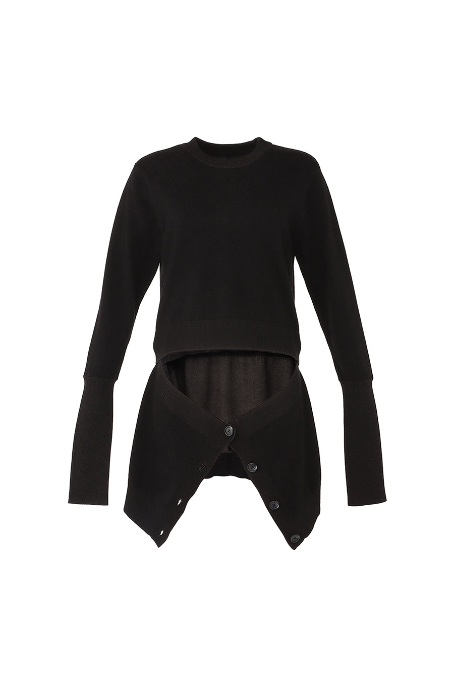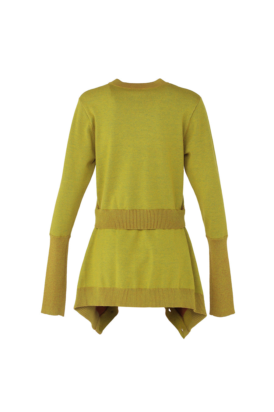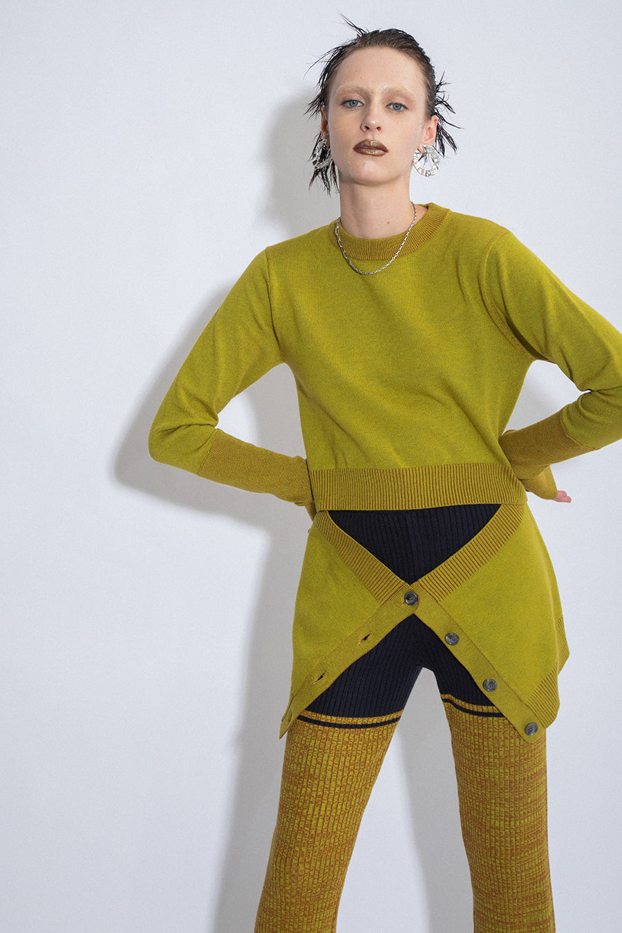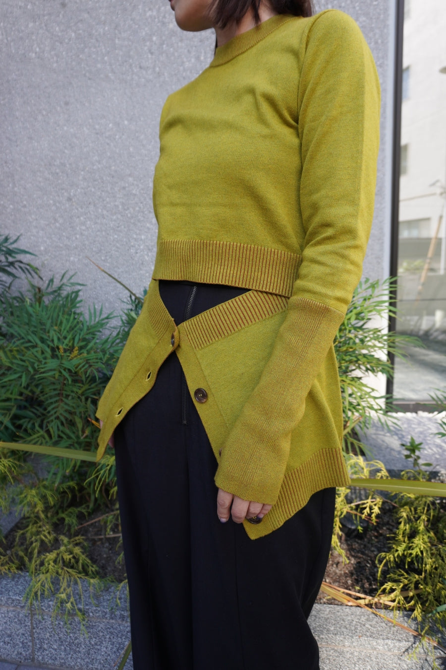 腰まわりにニットカーデを巻いているかのようなドッキングデザインニットは、1枚でレイヤードスタイルを楽しめる主役級アイテム。ヒップまで隠れる着丈は腰回りをカバーしてくれ、スタイルアップ効果も。