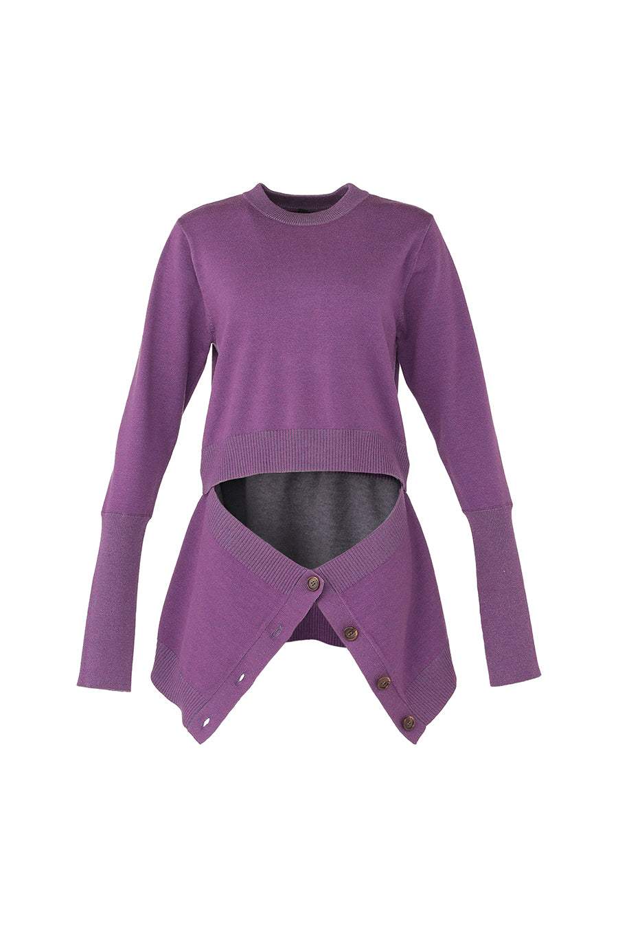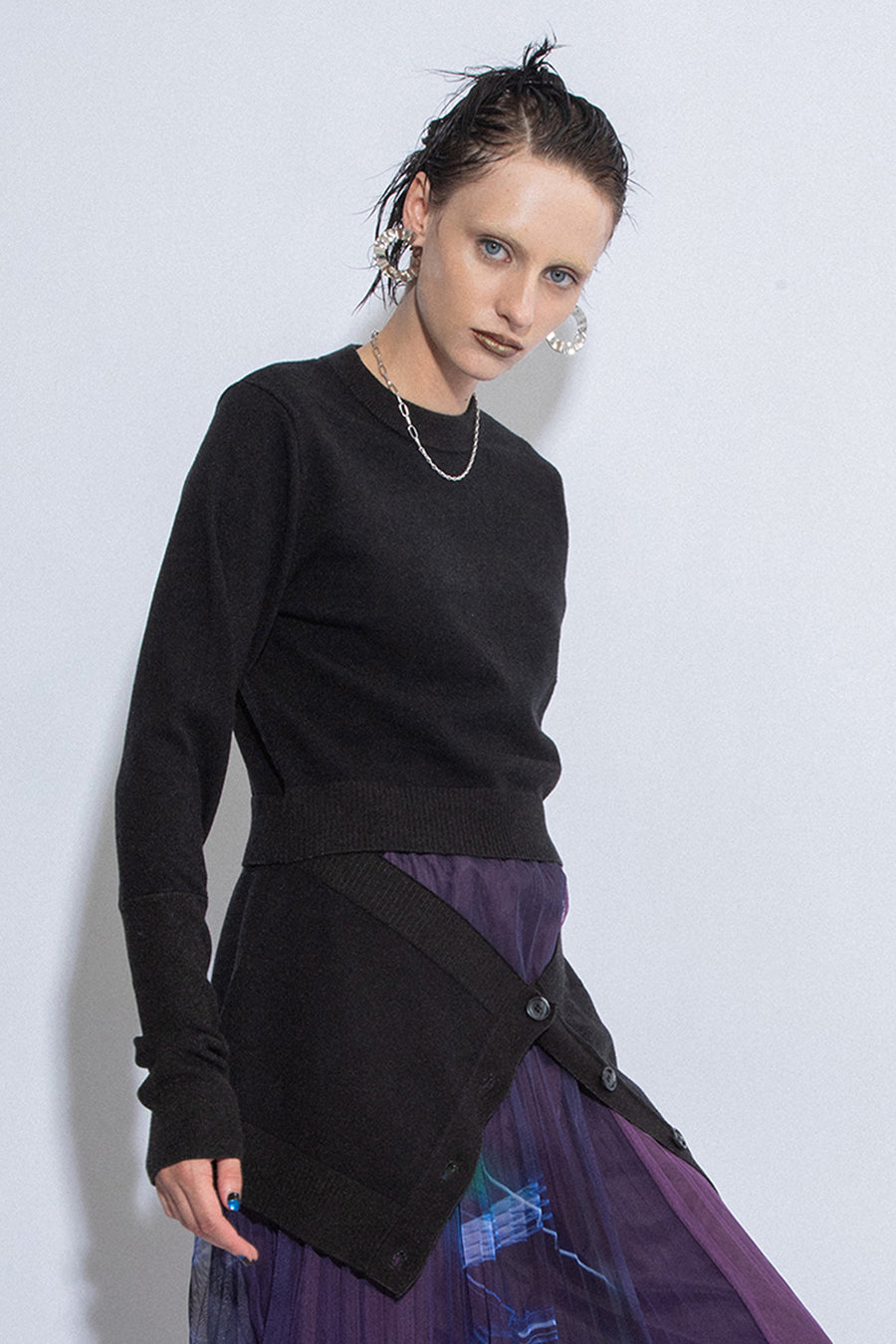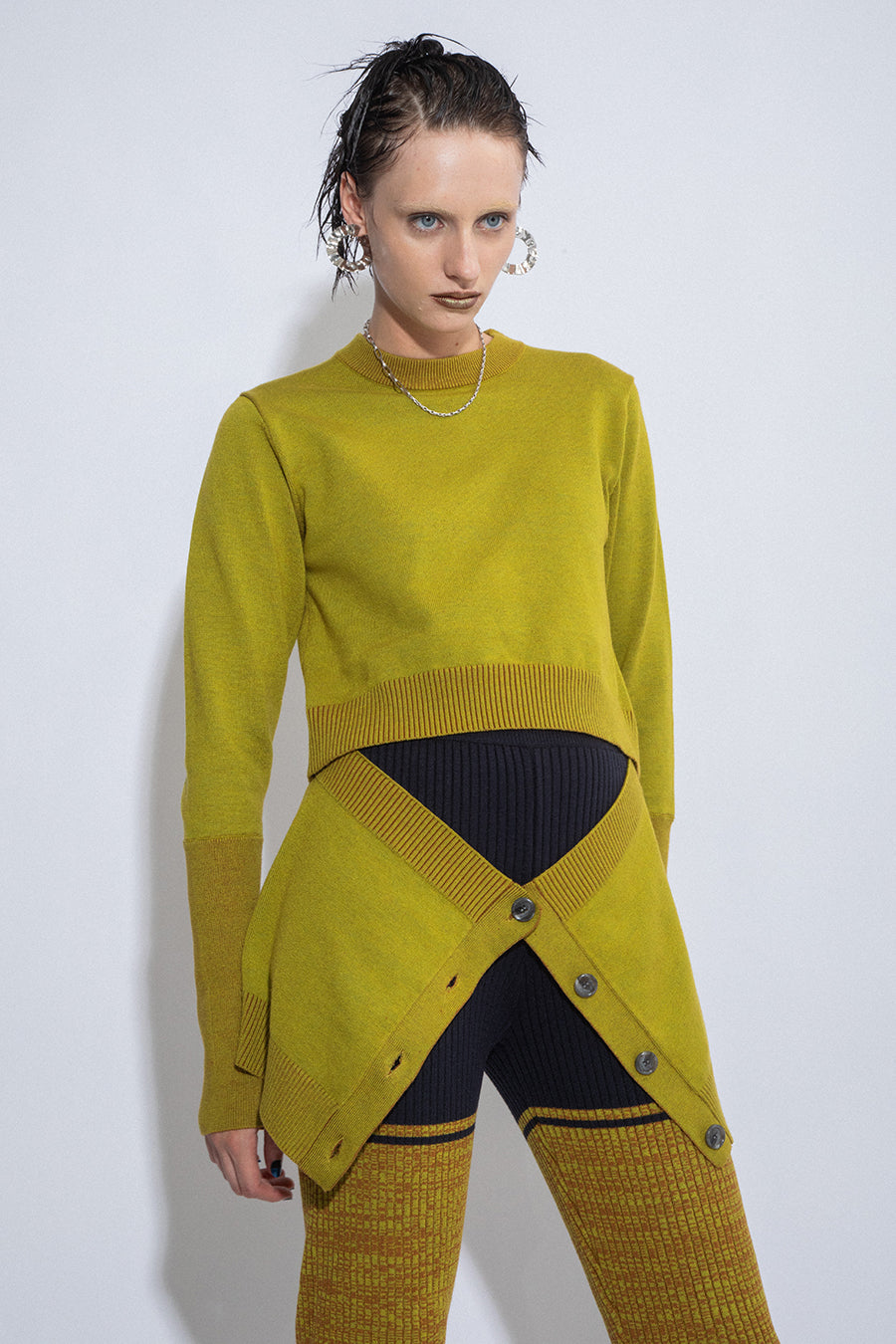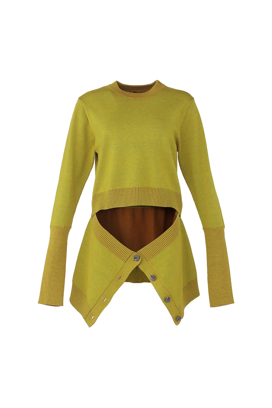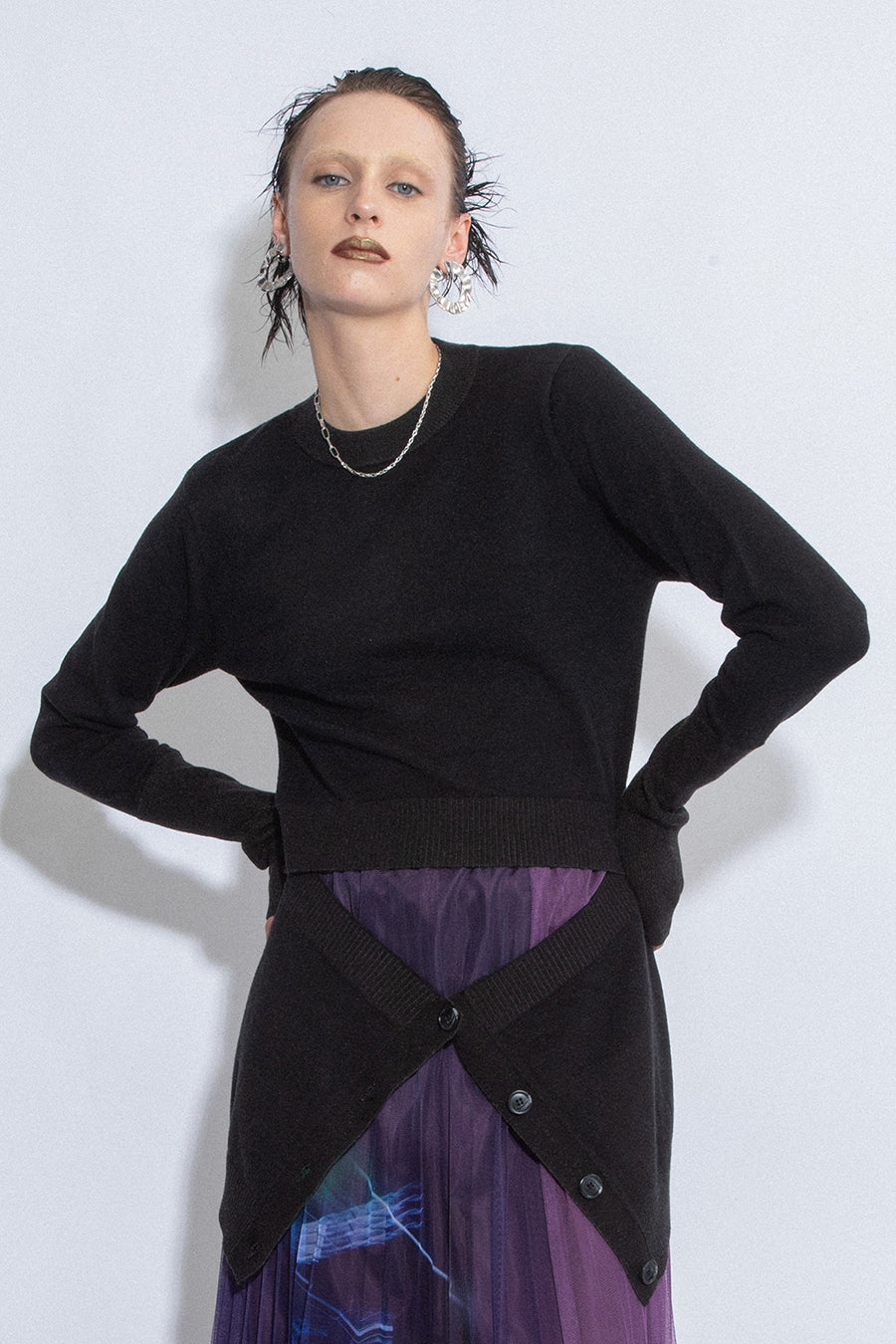 腰まわりにニットカーデを巻いているかのようなドッキングデザインニットは、1枚でレイヤードスタイルを楽しめる主役級アイテム。ヒップまで隠れる着丈は腰回りをカバーしてくれ、スタイルアップ効果も。