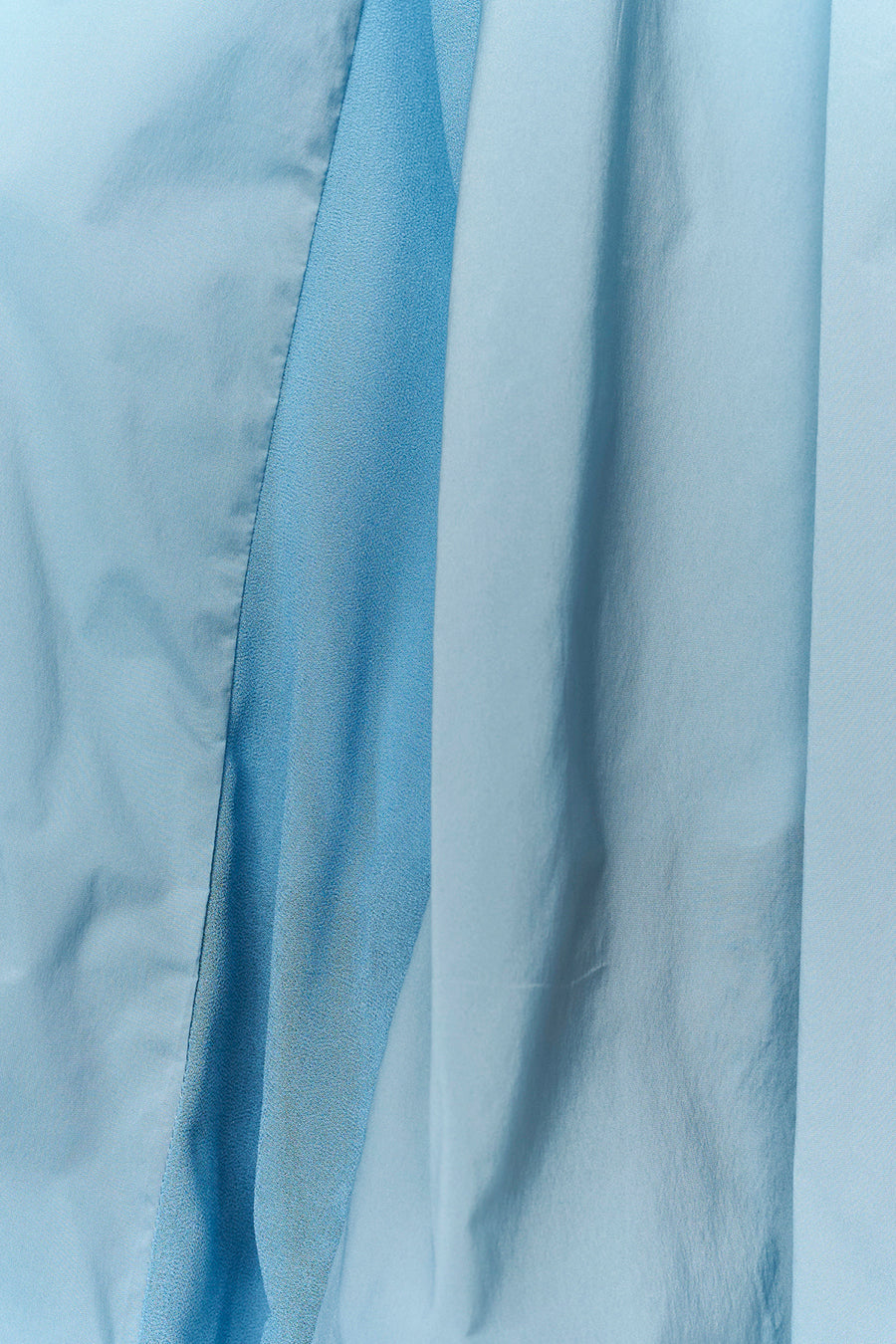 内側で薄手の裏地で吊って、ねじりを入れて、部分的にシフォンの素材も混ぜ、