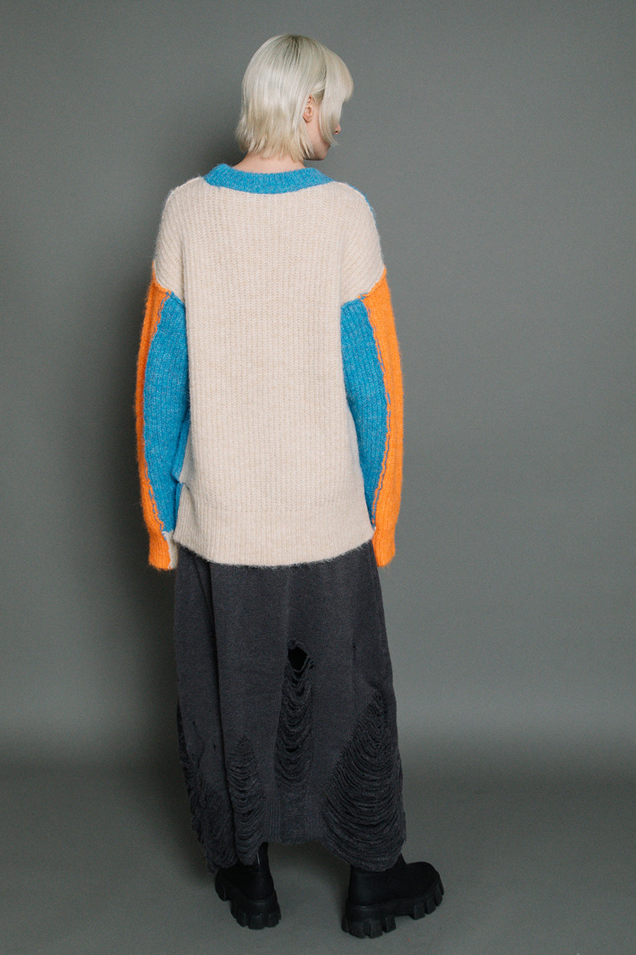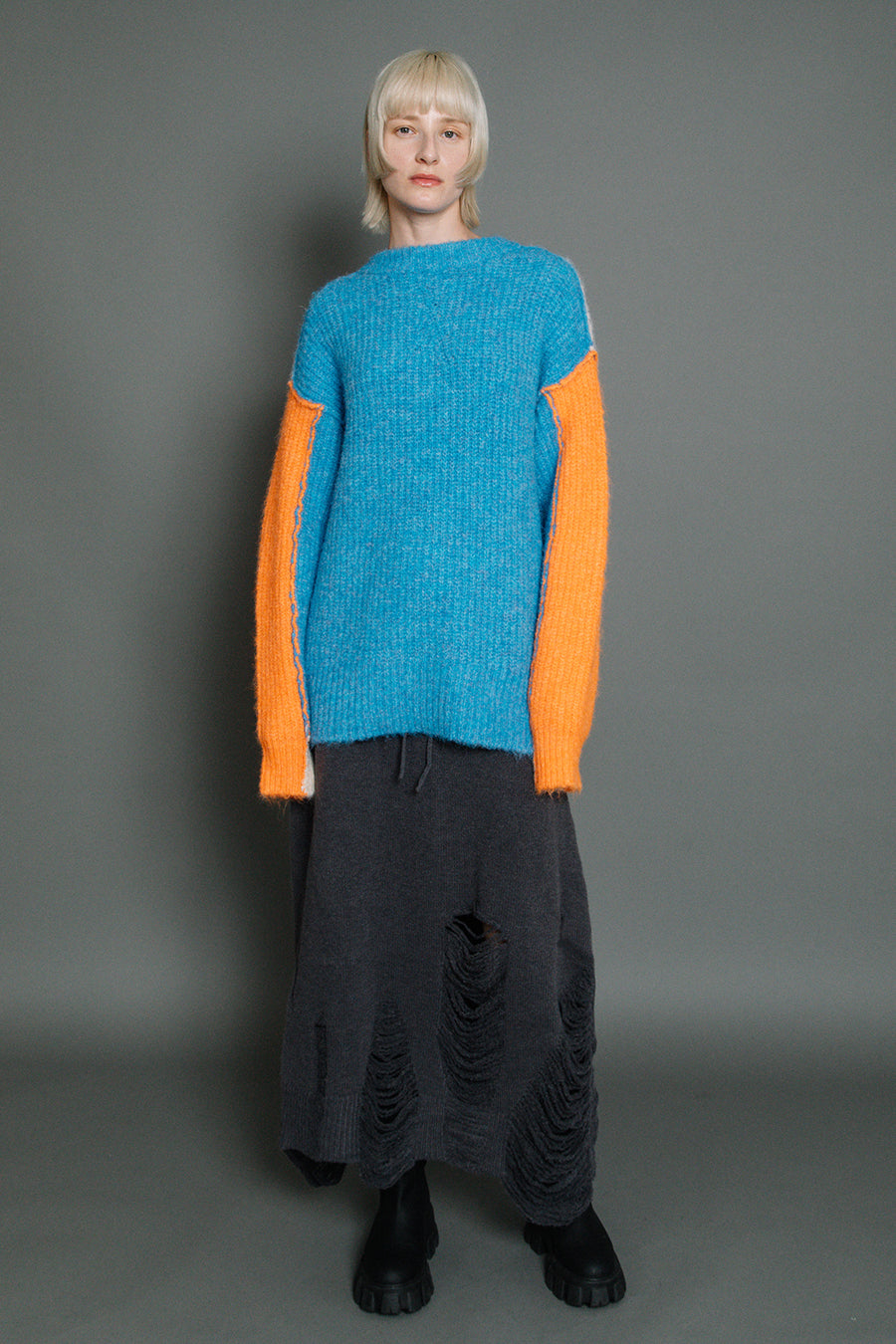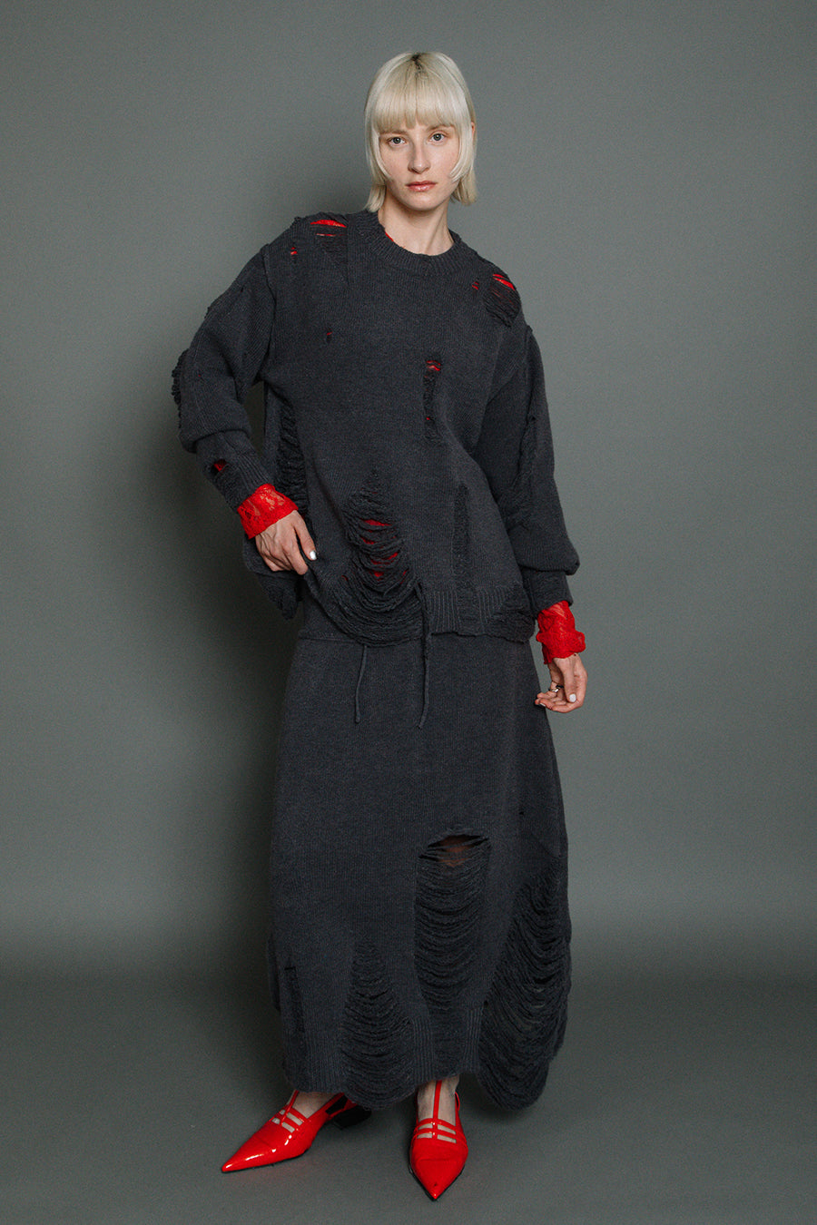 同素材のダメージプルオーバーとのセットアップコーデもお勧め。
