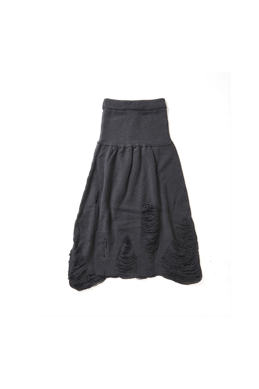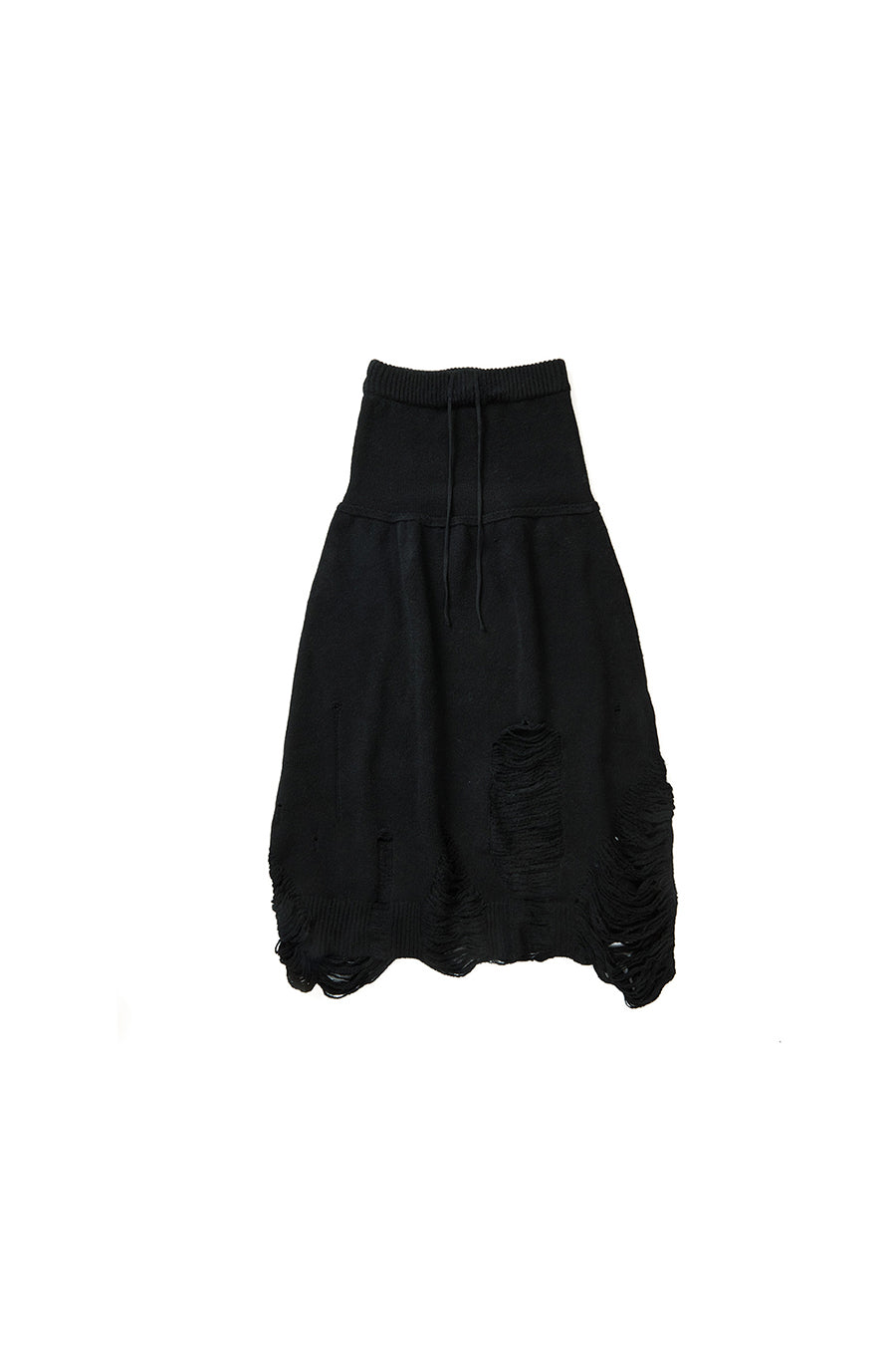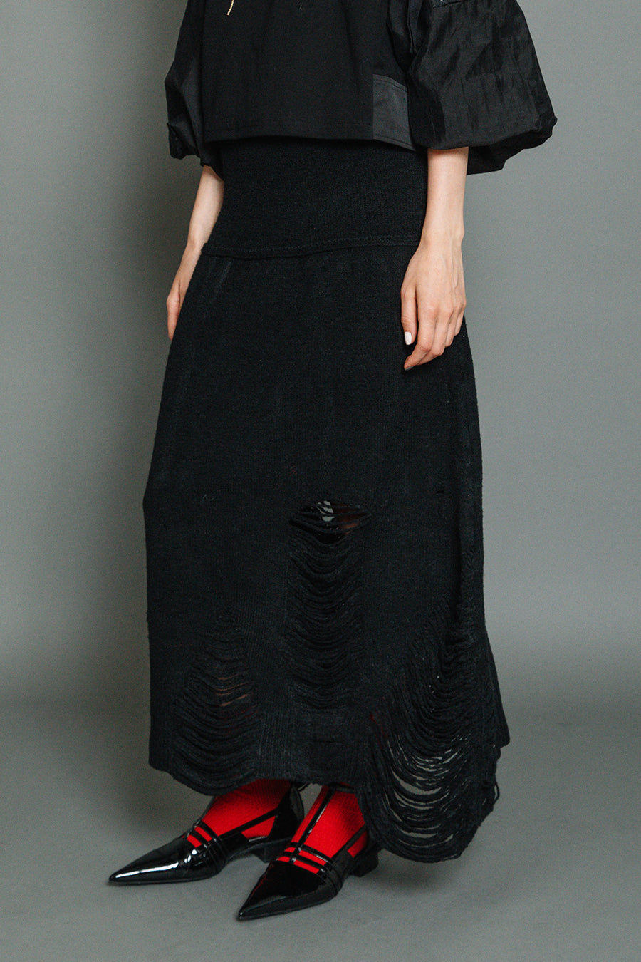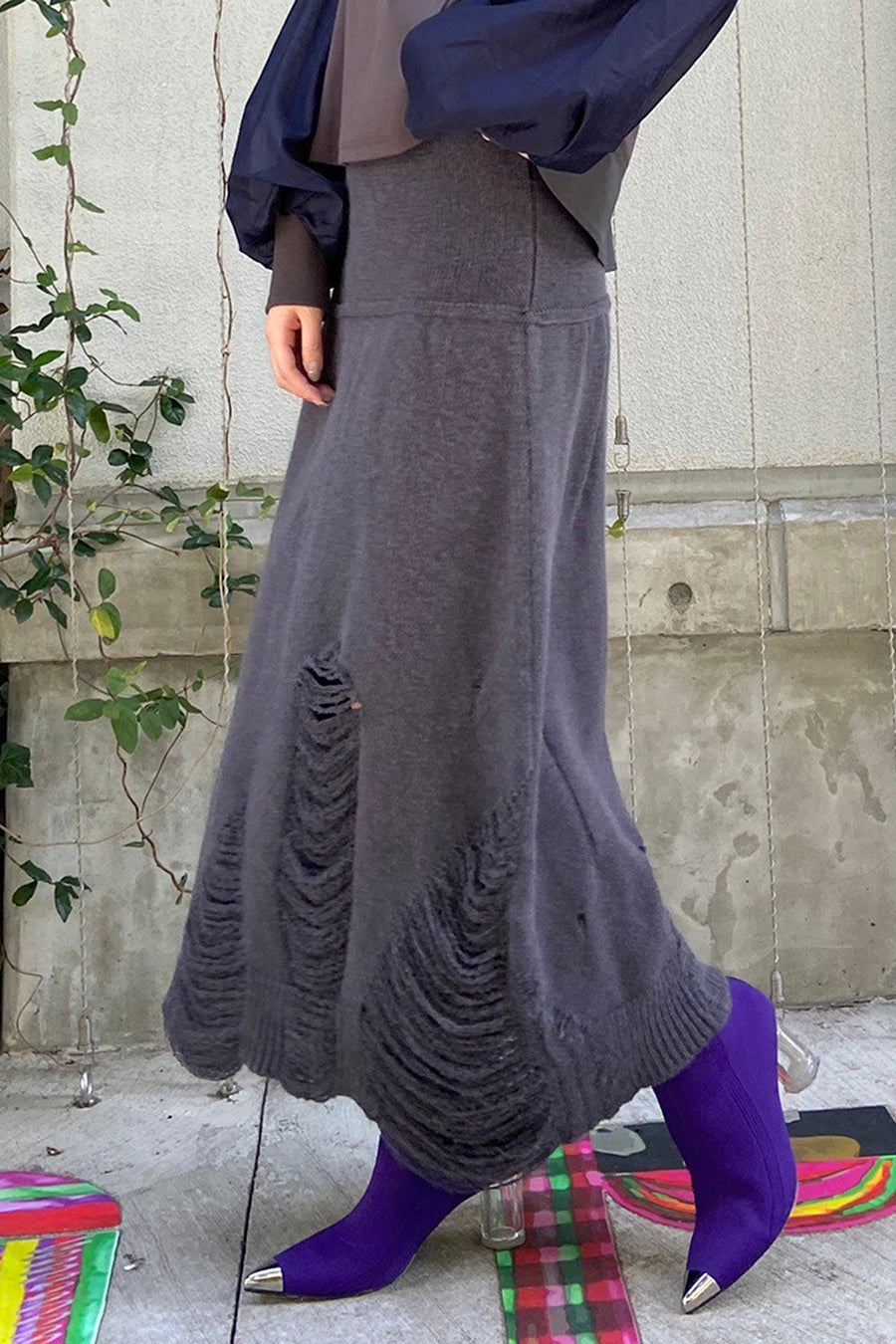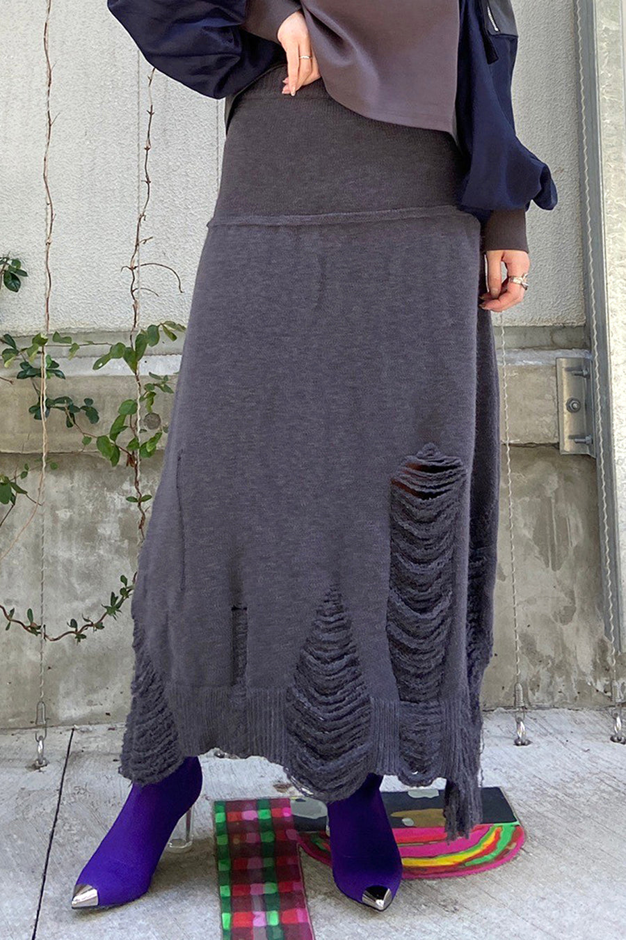 ヒップラインで切り替え、ほのかにギャザーを入れたAラインシルエットで、裾部分のランダムなダメージ加工がポイントに。ハードな印象ではなく、抜け感のある雰囲気でトレンド感も兼ね備えたアイテム。
