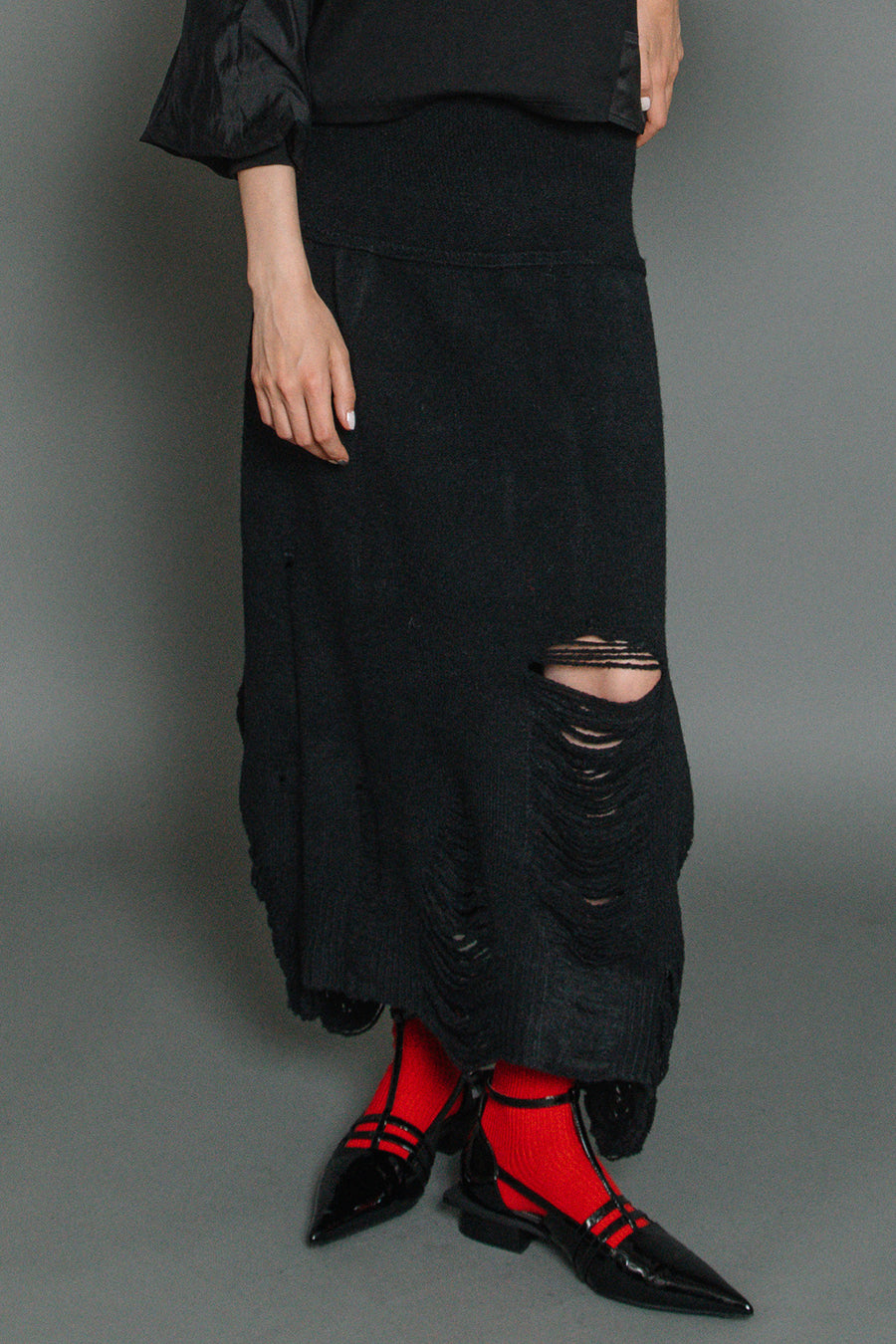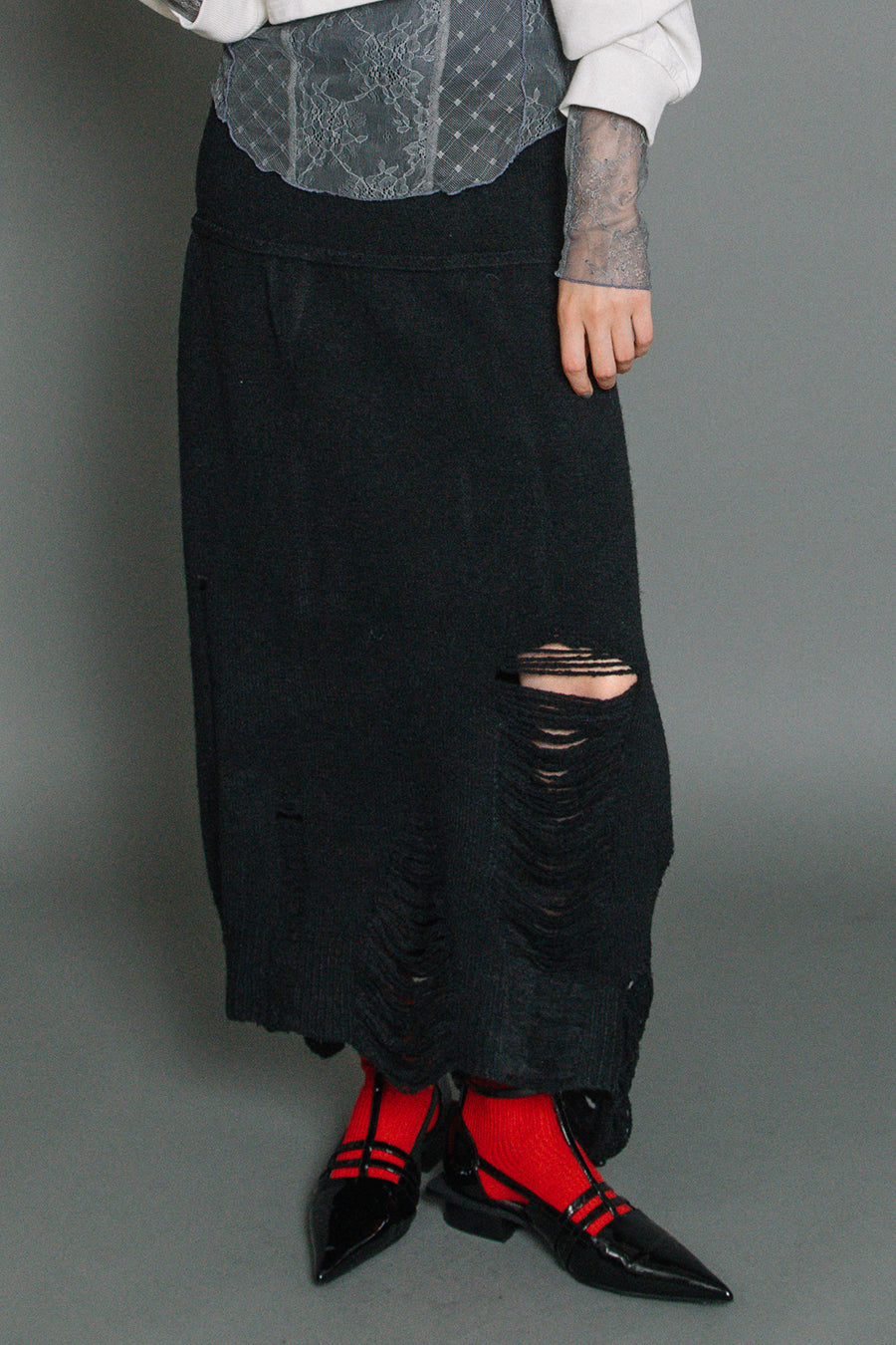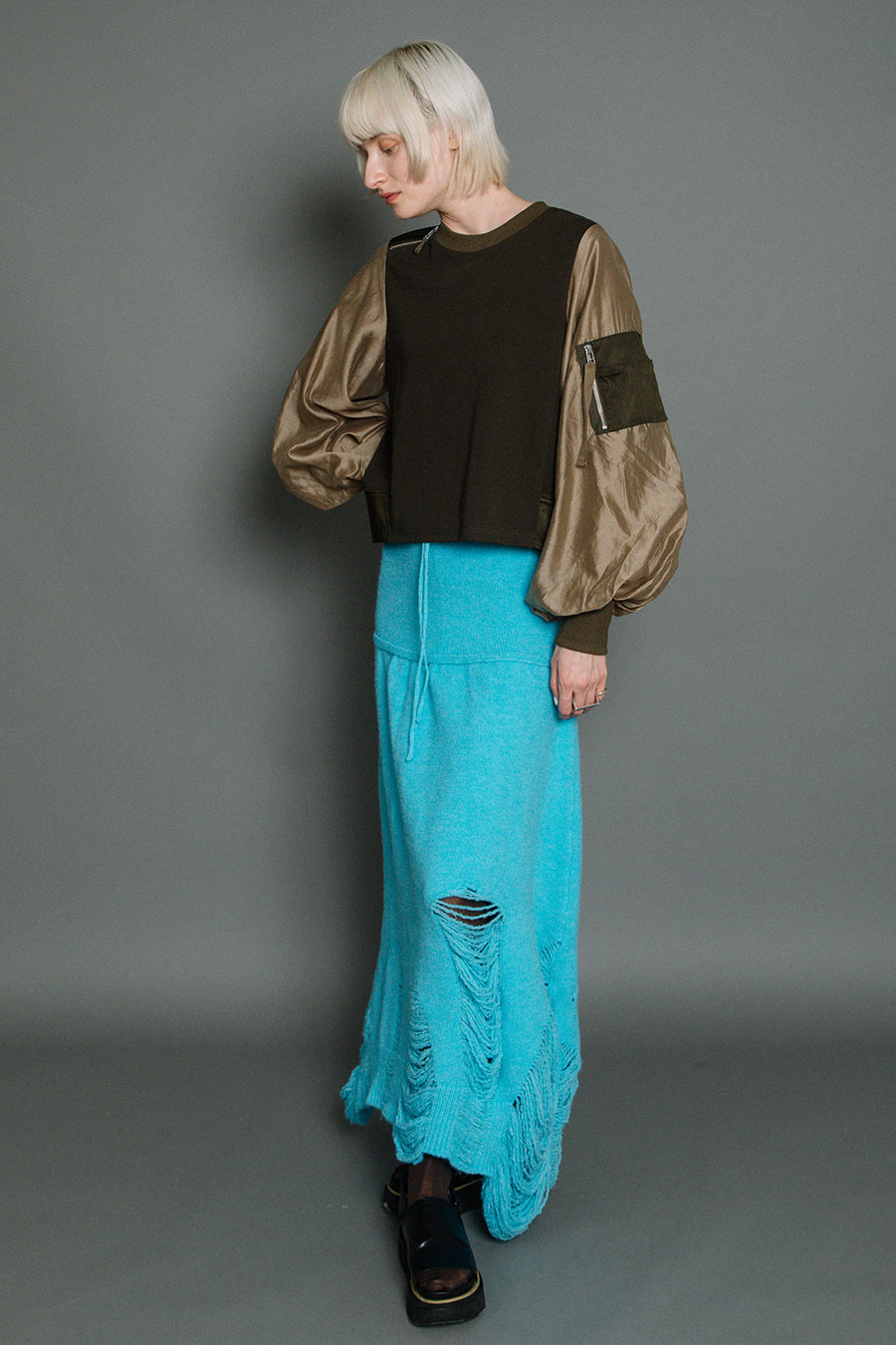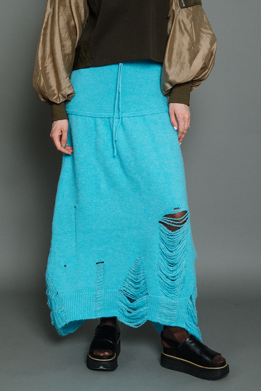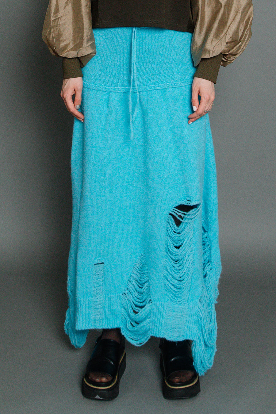 ヒップラインで切り替え、ほのかにギャザーを入れたAラインシルエットで、裾部分のランダムなダメージ加工がポイントに。ハードな印象ではなく、抜け感のある雰囲気でトレンド感も兼ね備えたアイテム。