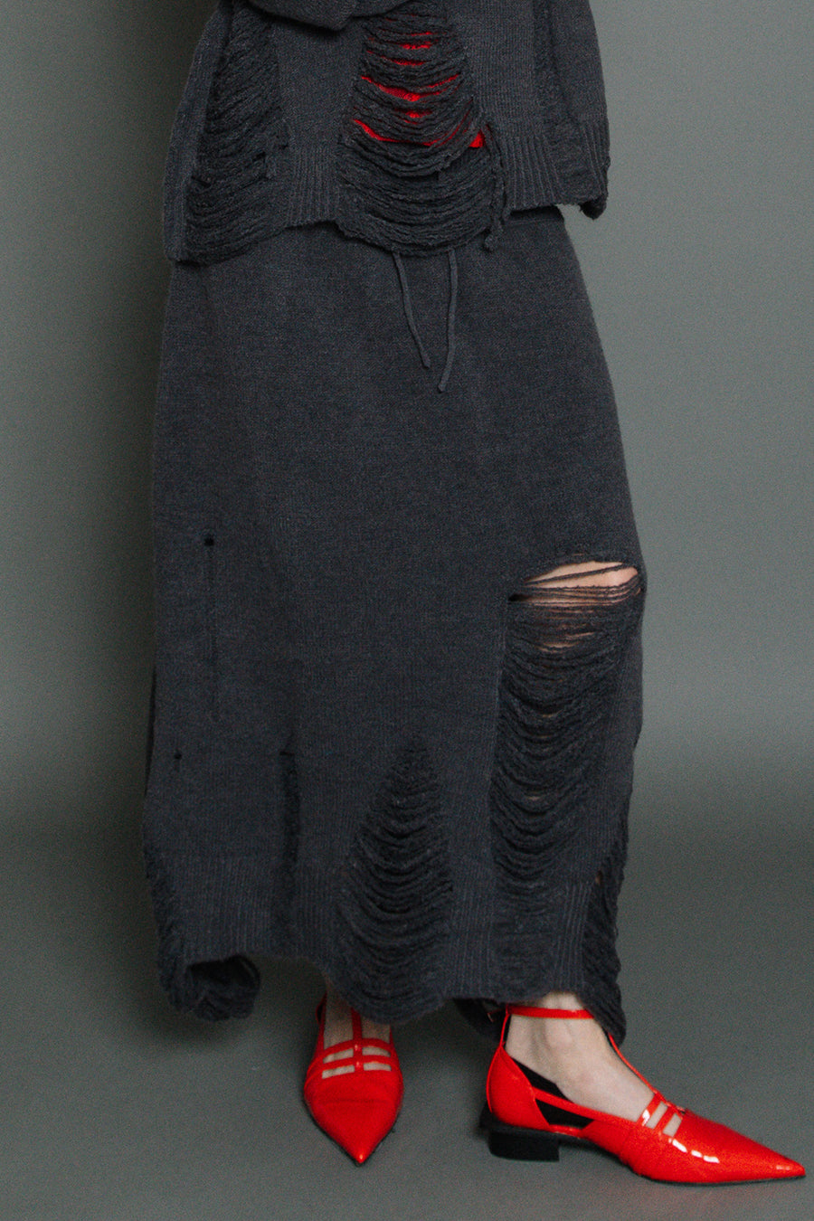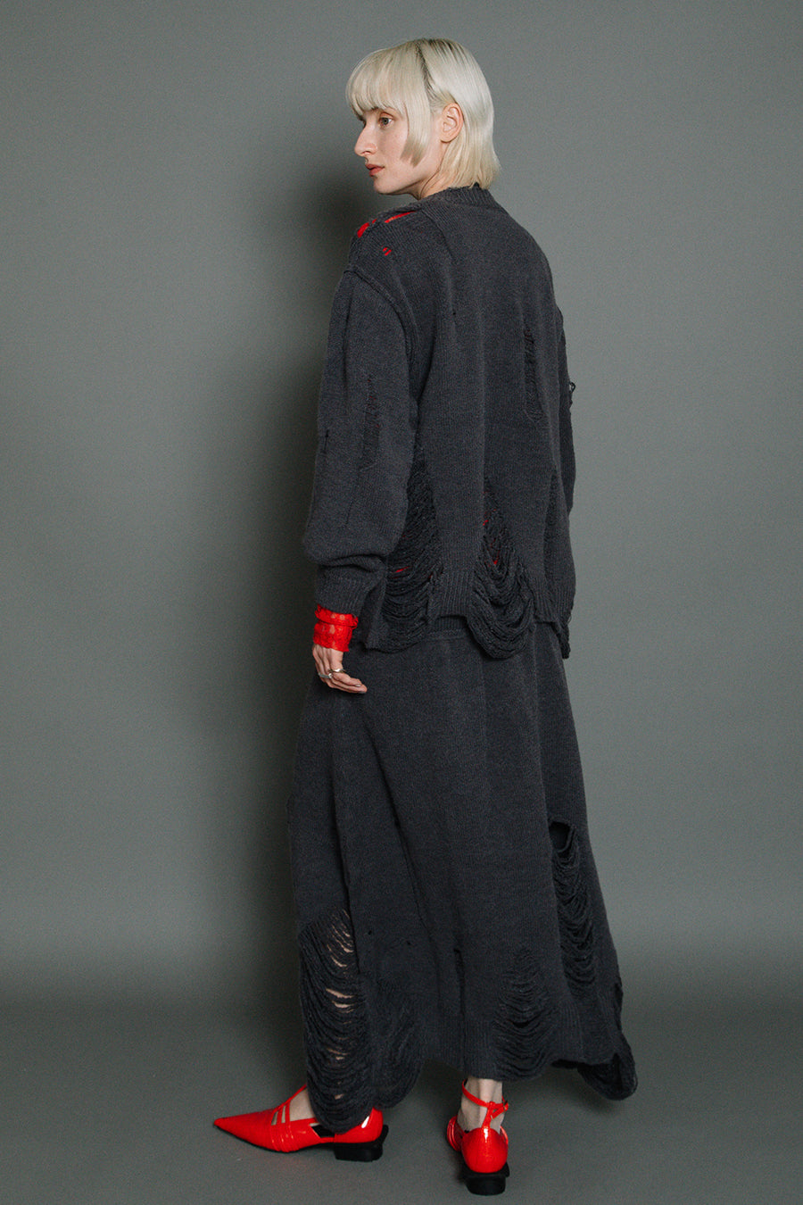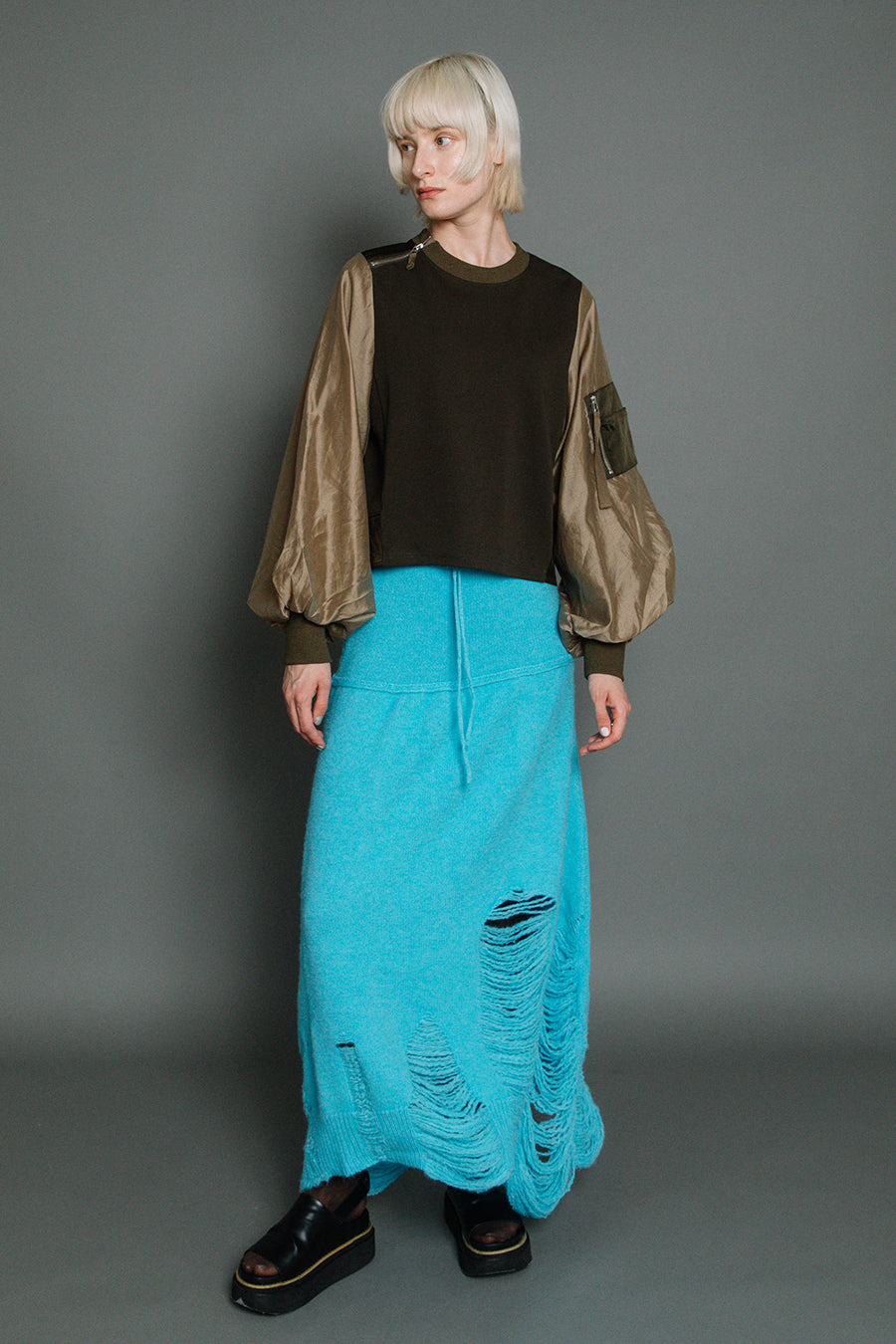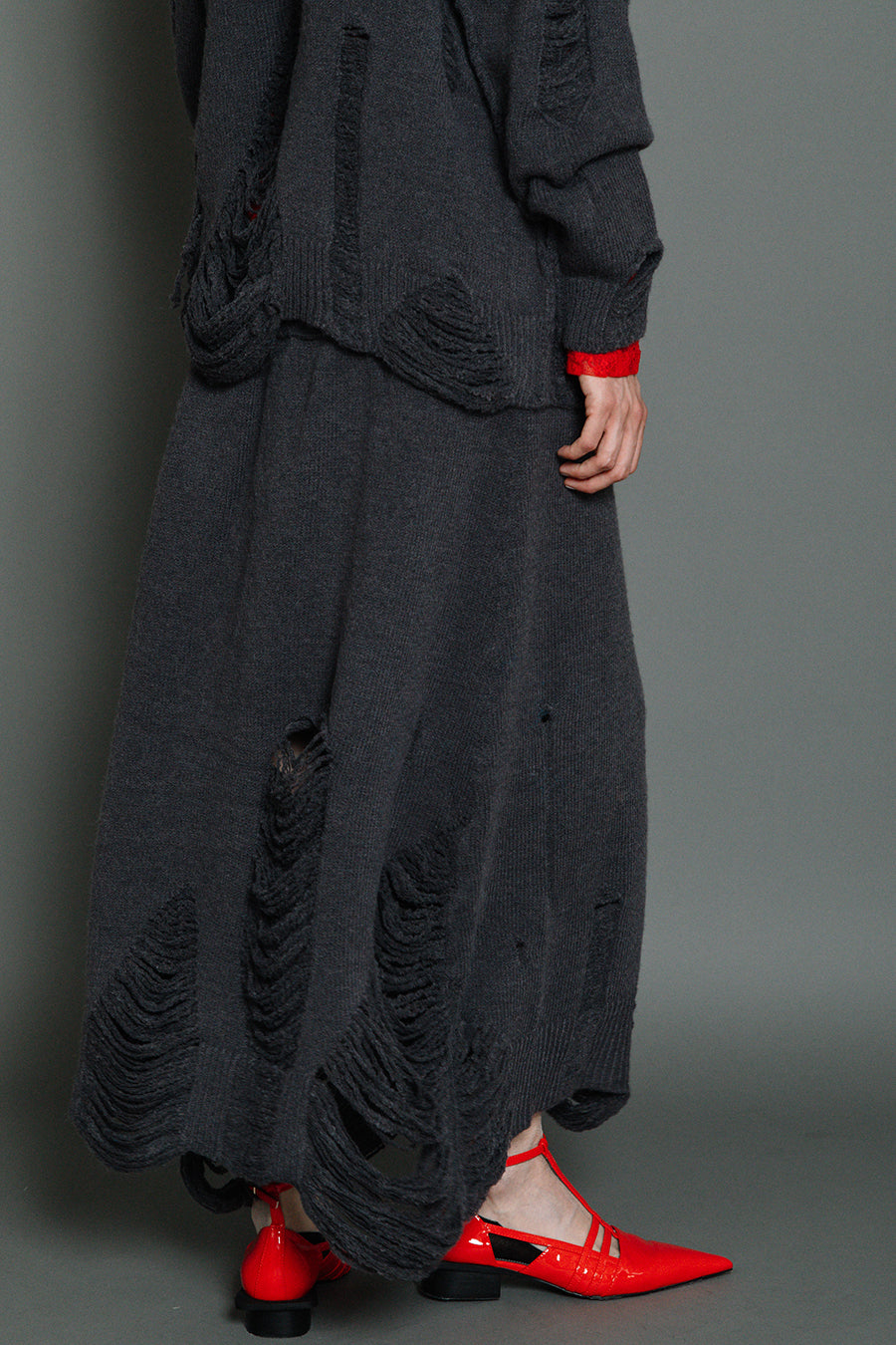 ヒップラインで切り替え、ほのかにギャザーを入れたAラインシルエットで、裾部分のランダムなダメージ加工がポイントに。ハードな印象ではなく、抜け感のある雰囲気でトレンド感も兼ね備えたアイテム。