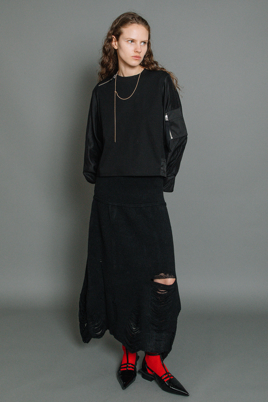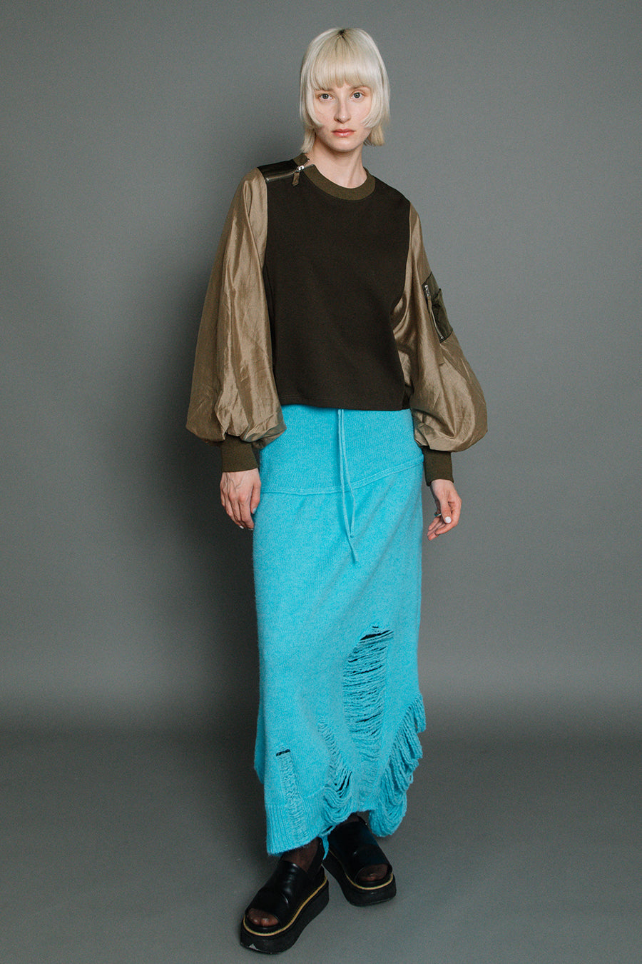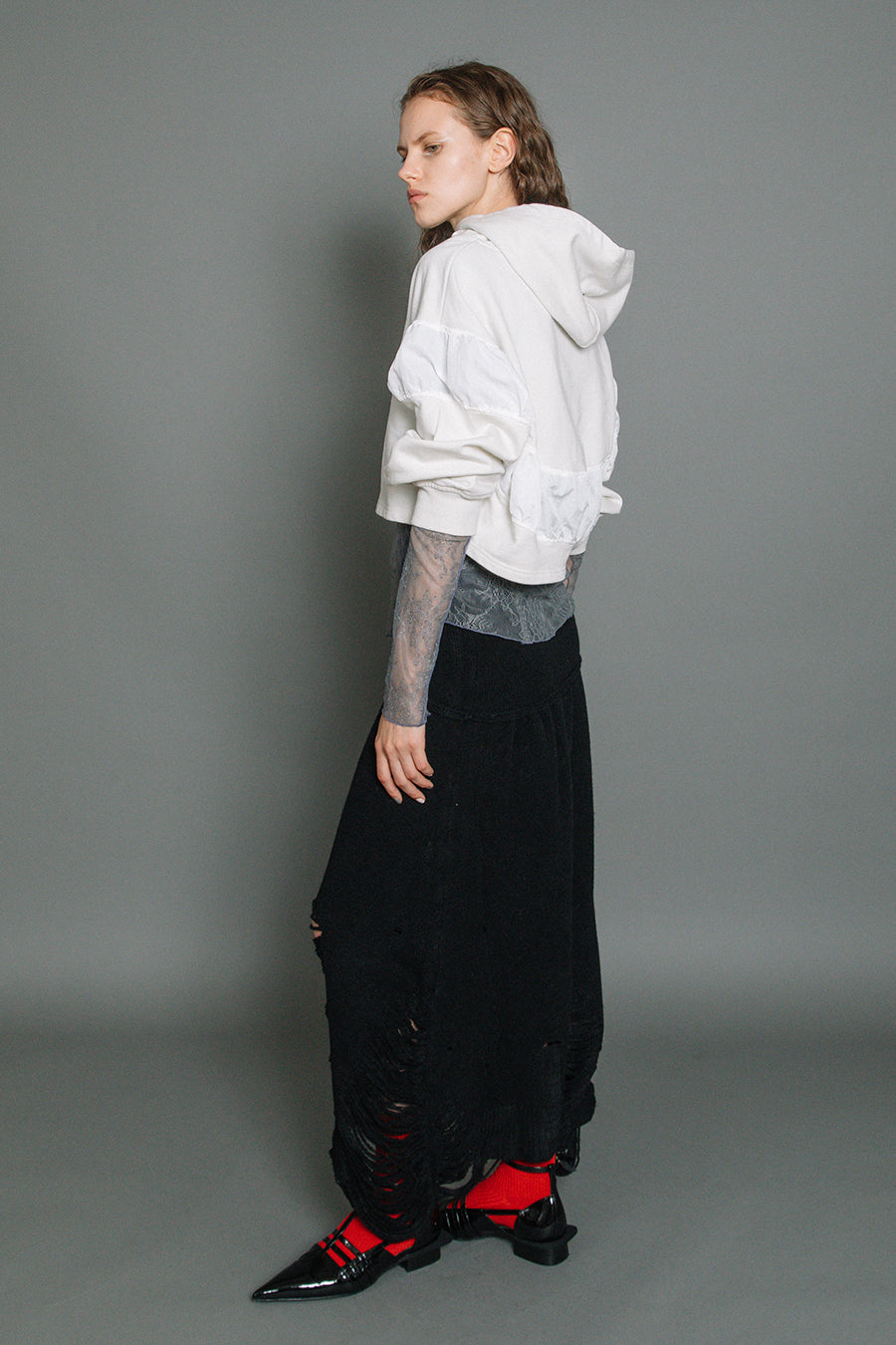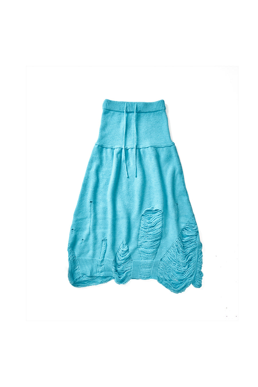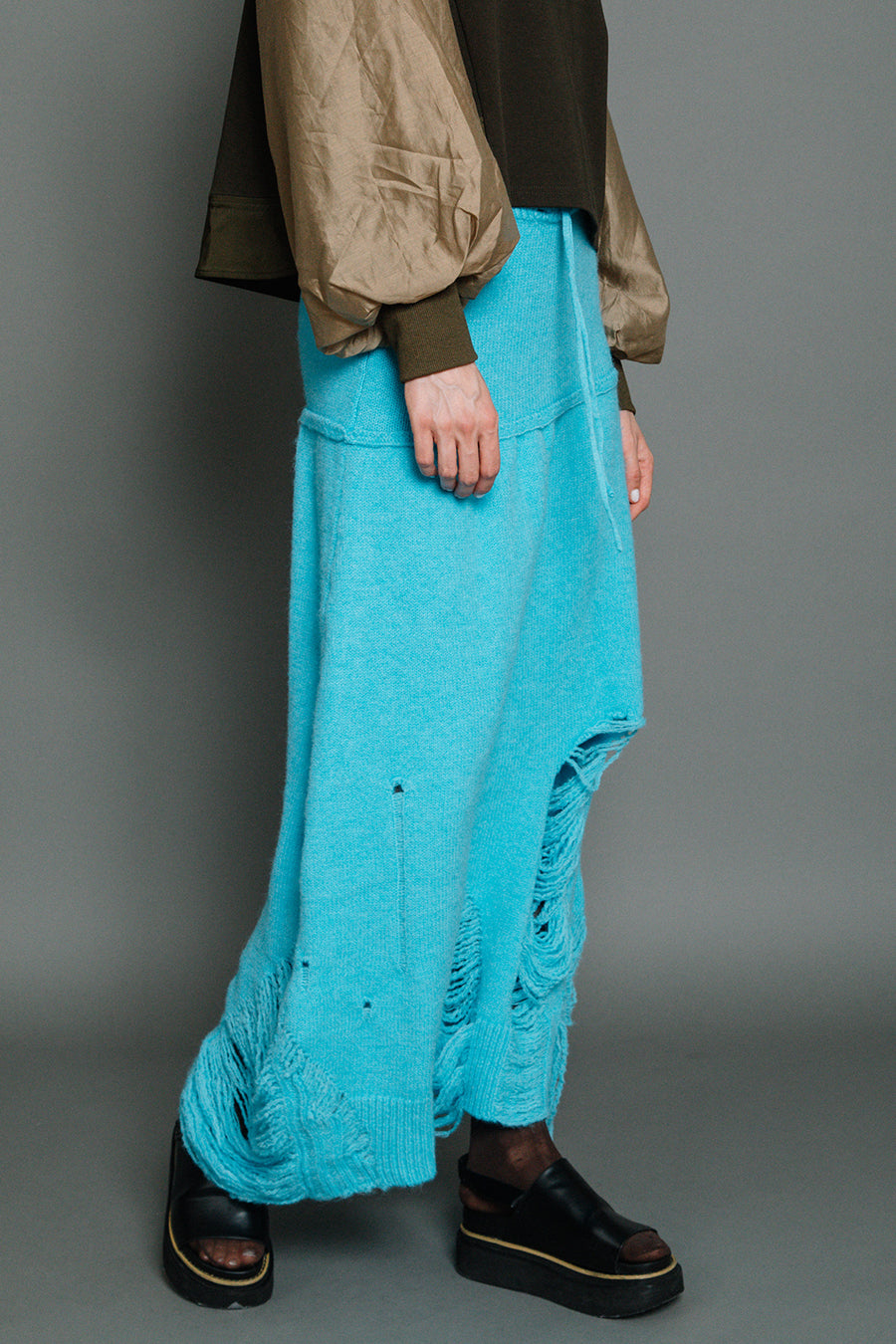 ヒップラインで切り替え、ほのかにギャザーを入れたAラインシルエットで、裾部分のランダムなダメージ加工がポイントに。ハードな印象ではなく、抜け感のある雰囲気でトレンド感も兼ね備えたアイテム。
