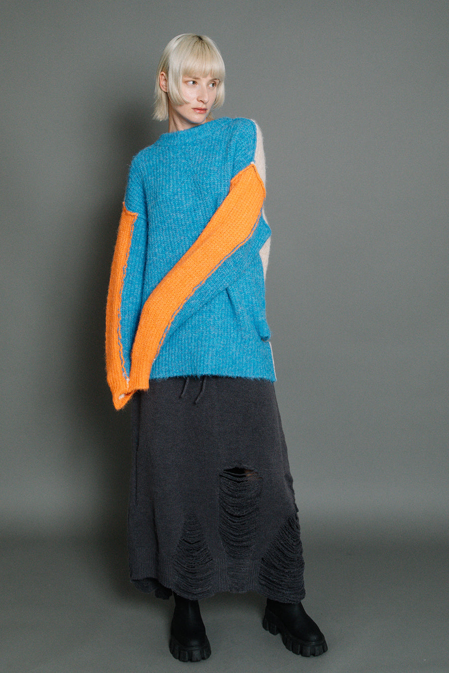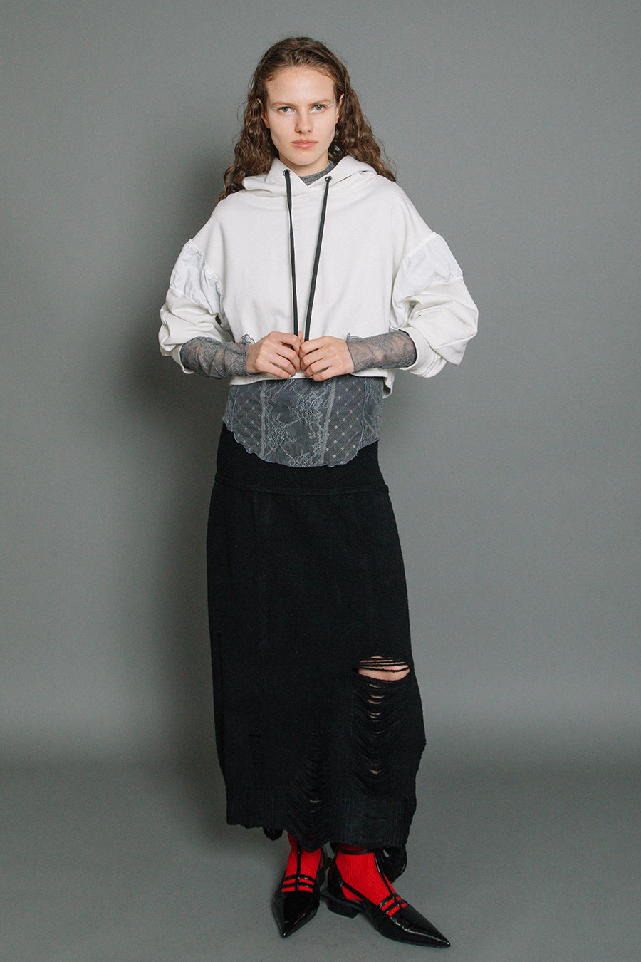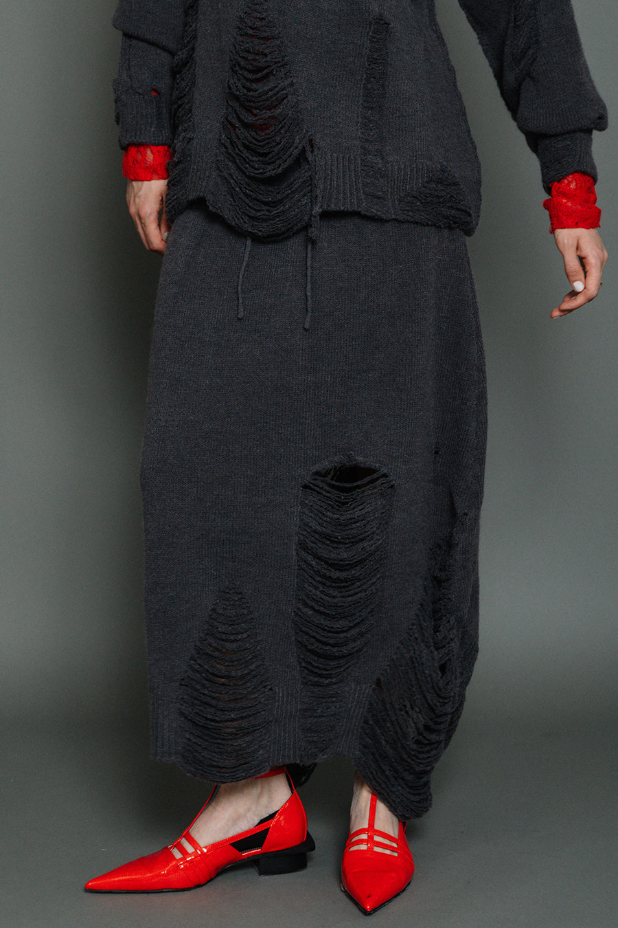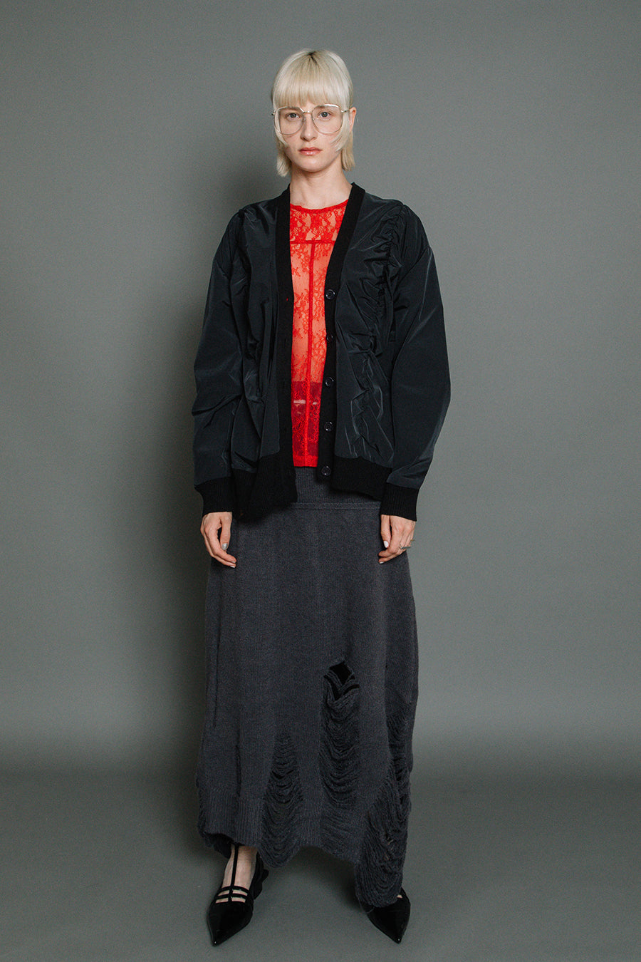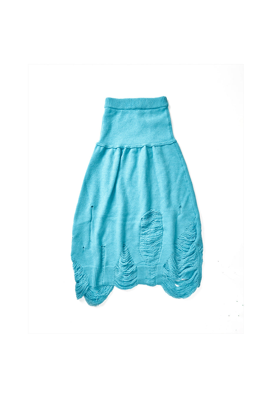 ヒップラインで切り替え、ほのかにギャザーを入れたAラインシルエットで、裾部分のランダムなダメージ加工がポイントに。ハードな印象ではなく、抜け感のある雰囲気でトレンド感も兼ね備えたアイテム。