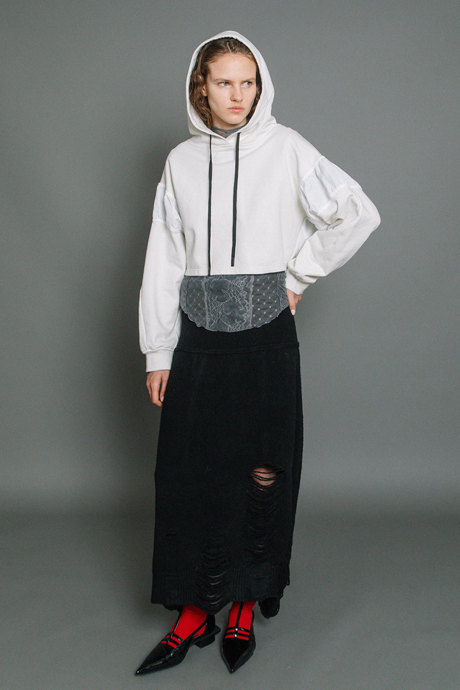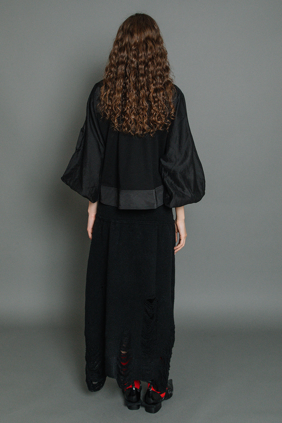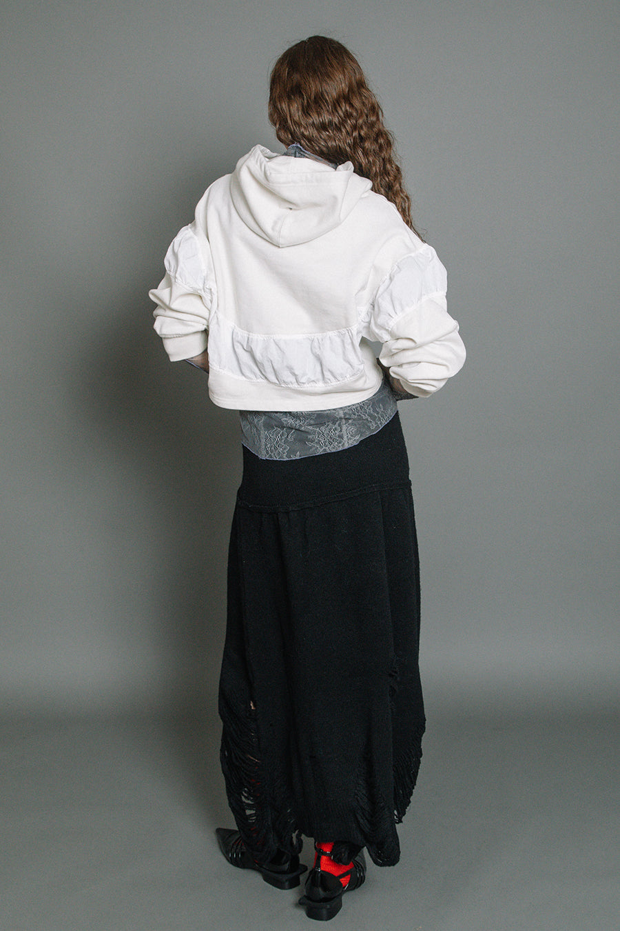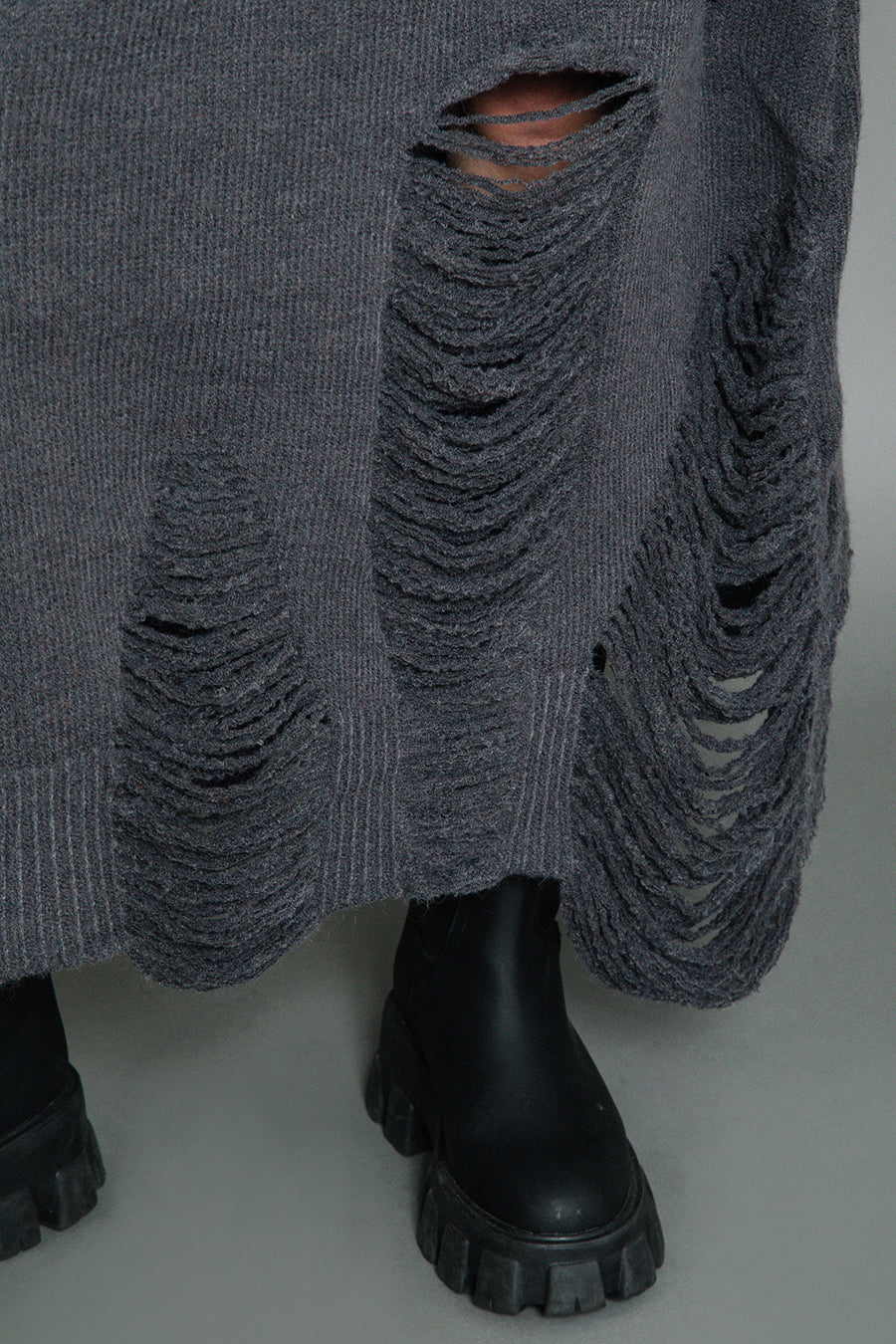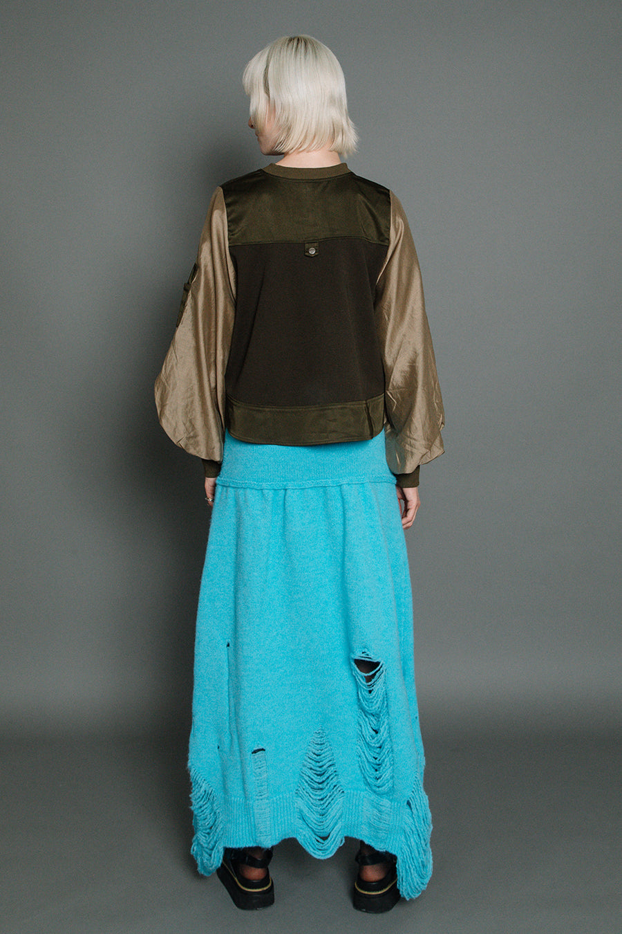 ヒップラインで切り替え、ほのかにギャザーを入れたAラインシルエットで、裾部分のランダムなダメージ加工がポイントに。ハードな印象ではなく、抜け感のある雰囲気でトレンド感も兼ね備えたアイテム。