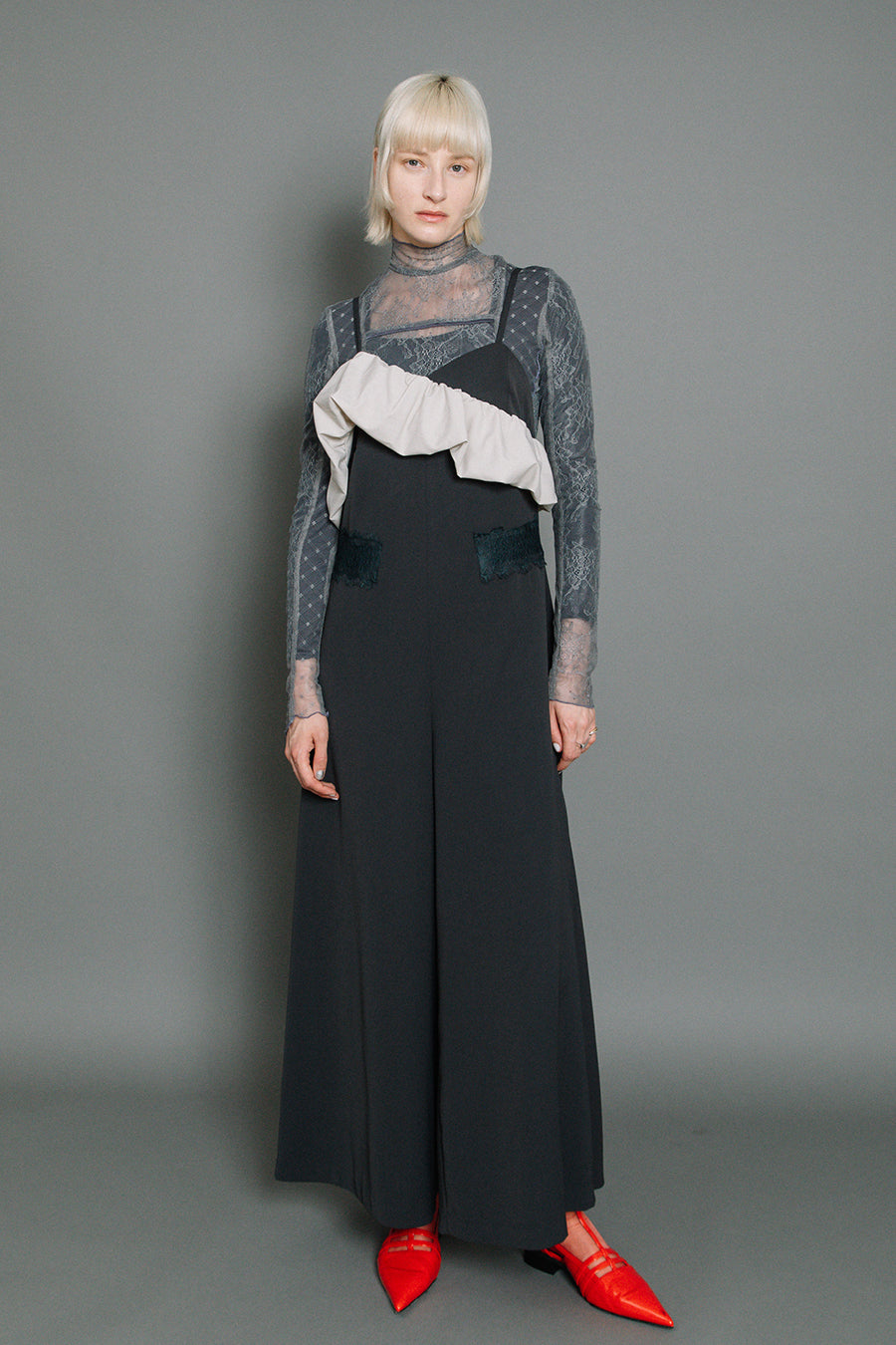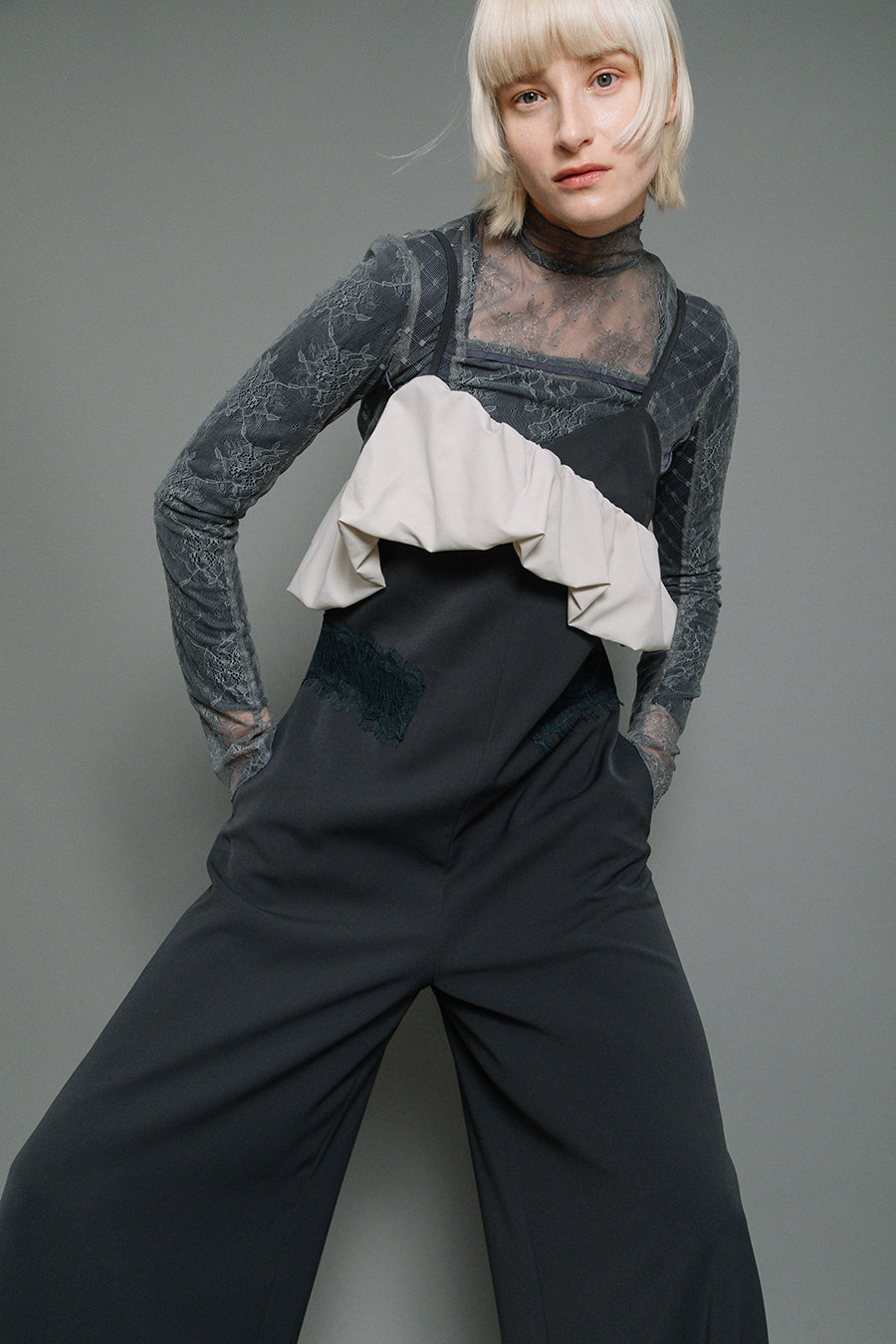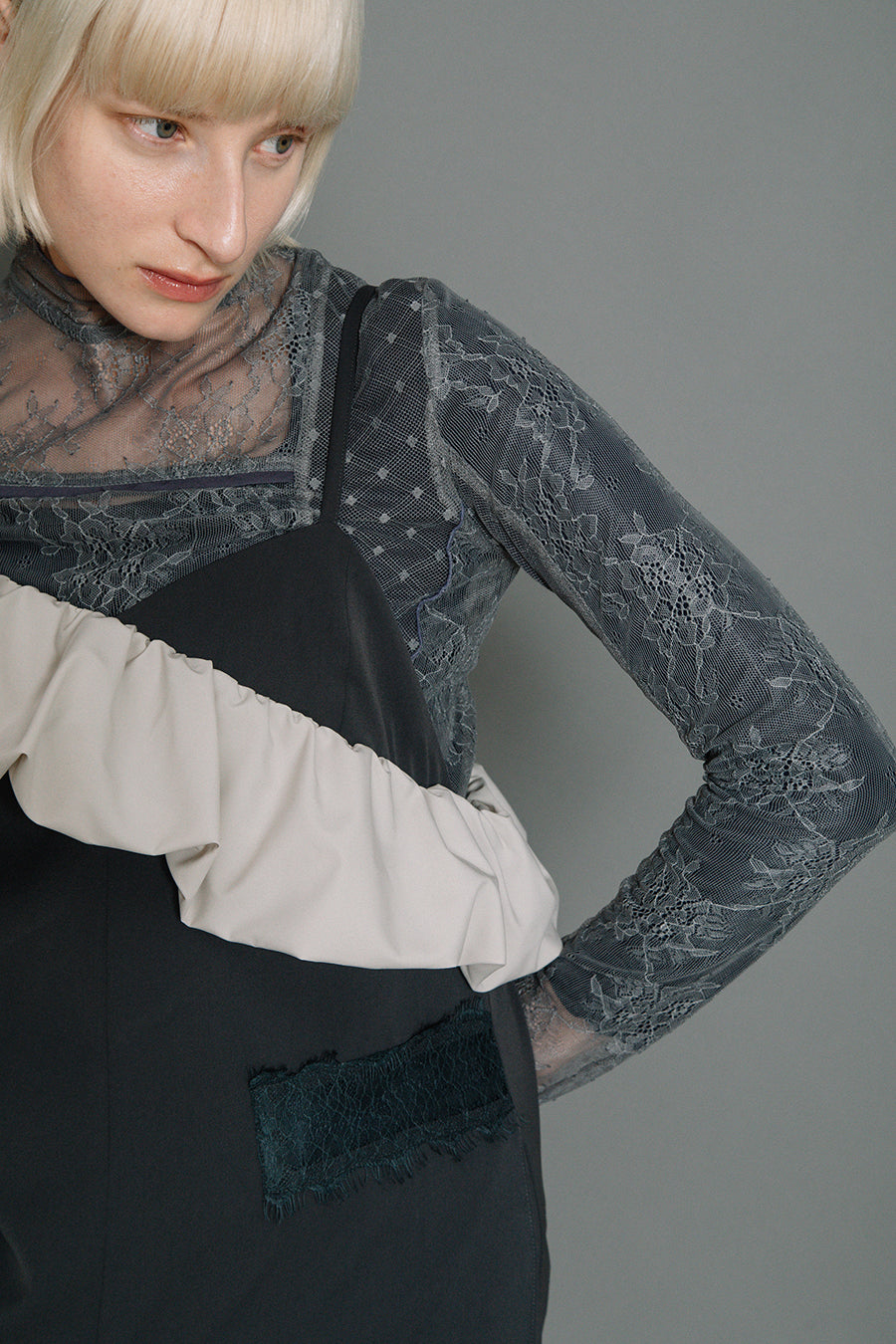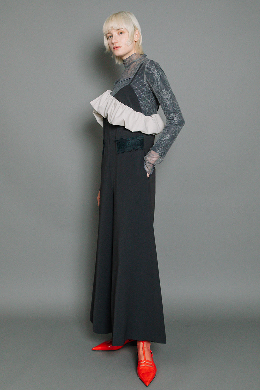 体のラインを拾わないゆとりのあるサイジングながら、レースをウエストより高めの位置に斜めに配置することでウエストまわりをシャープに見せ、脚長効果も◎