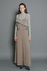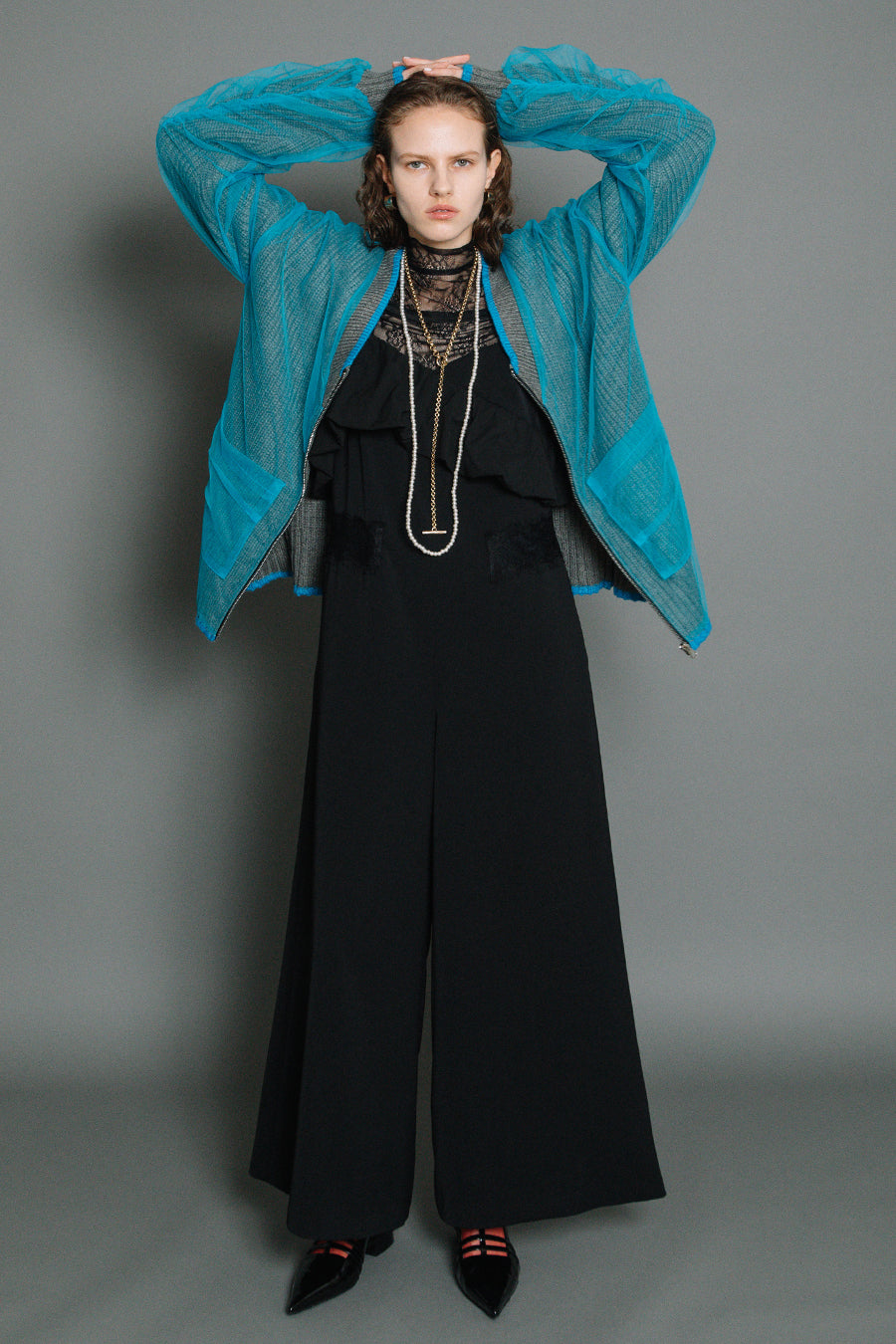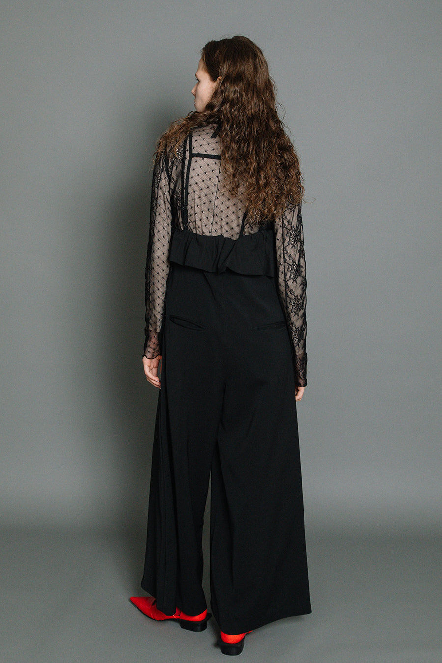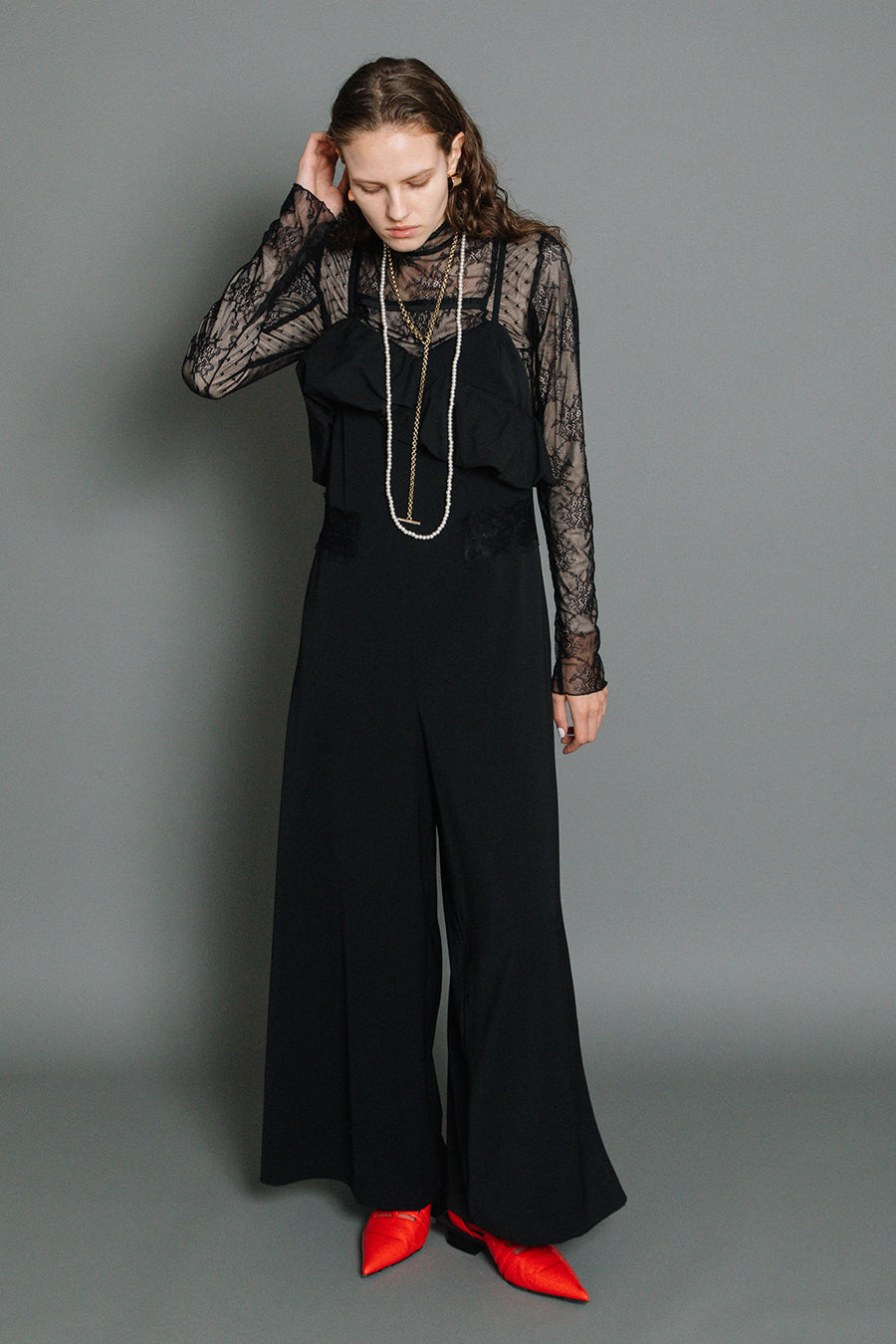 体のラインを拾わないゆとりのあるサイジングながら、レースをウエストより高めの位置に斜めに配置することでウエストまわりをシャープに見せ、脚長効果も◎