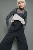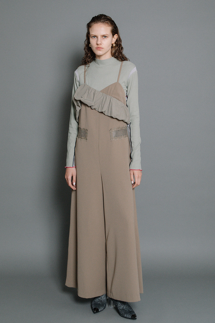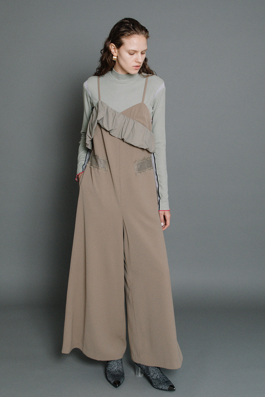 梳毛調の中肉素材のオールインワンにアシンメトリーのバルーンフリルを施した華やかなオールインワン。