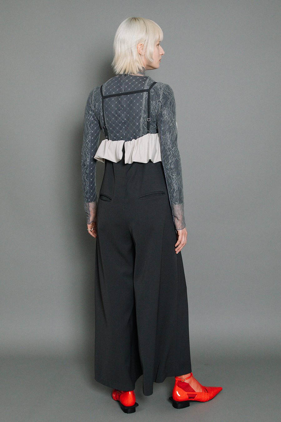バルーンフリルはマットなタフタ素材を使用することでモードな印象に仕上げ、ウエストサイドのスカラップレースが大人の華やかさを演出。