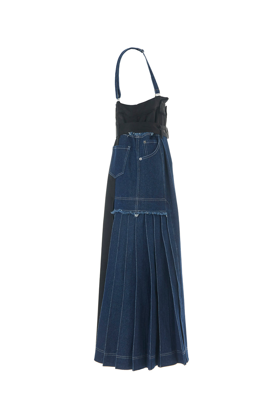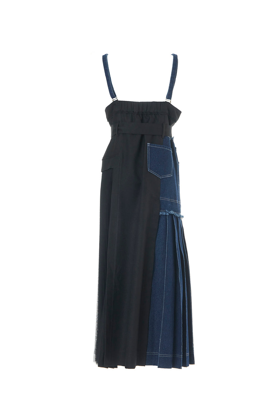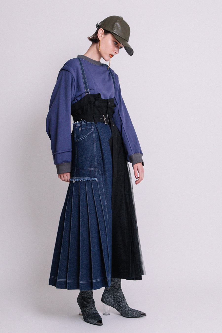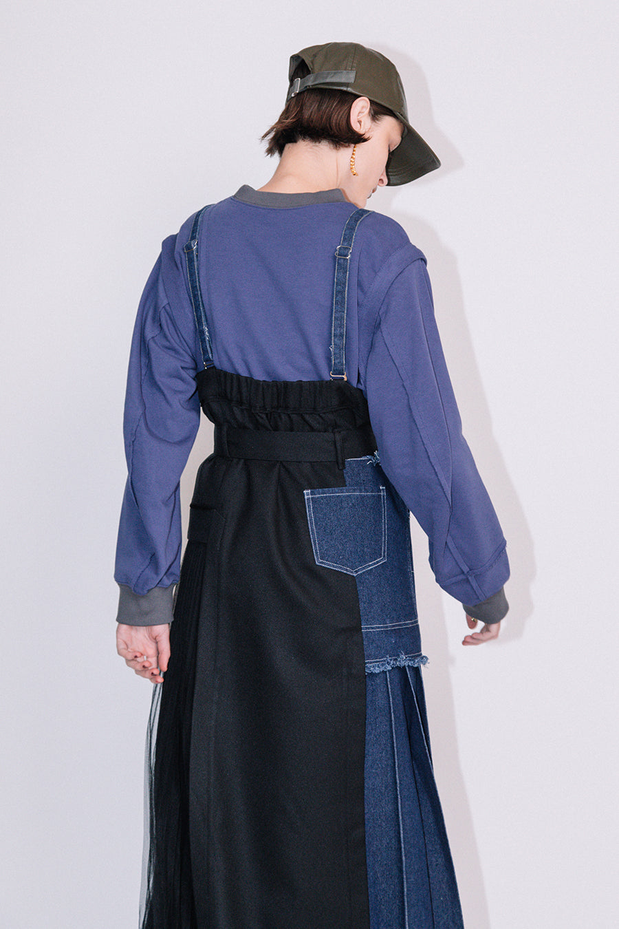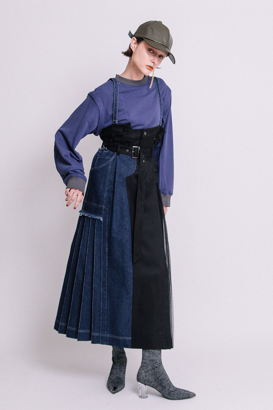 右サイドにはデニムタックプリーツ、左サイドにはチュールプリーツを施し、裾にかけて広がるフレアラインが女性らしい立体的なシルエットに仕上げたアイテム。バスト・ウエストはゆとりのある寸法設定なので、厚手のトップスをインナーにしても◎