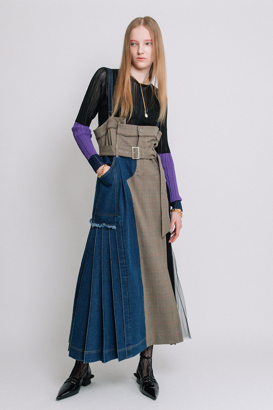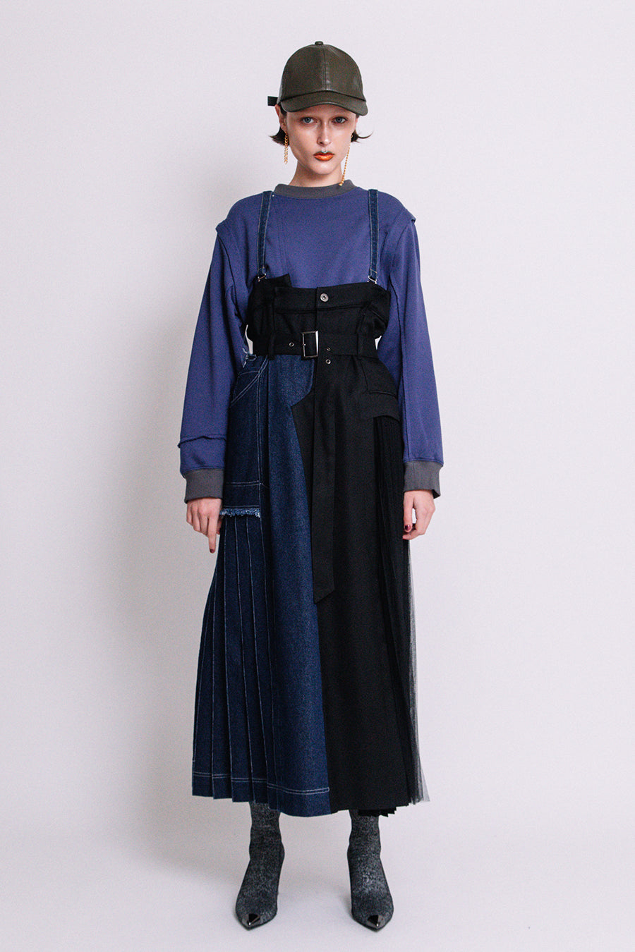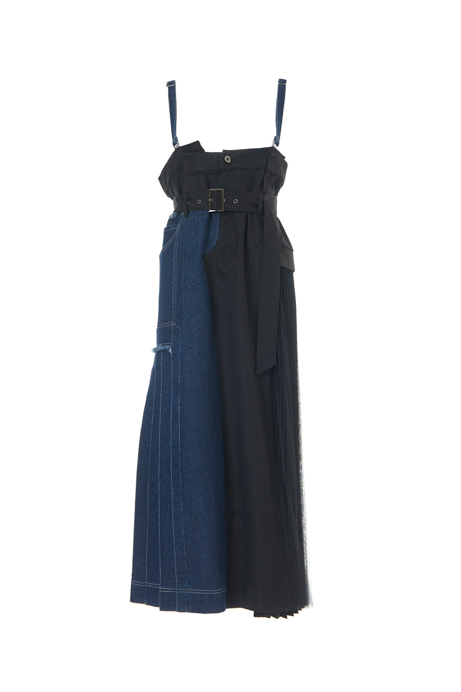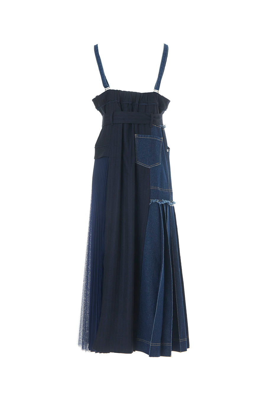 右サイドにはデニムタックプリーツ、左サイドにはチュールプリーツを施し、裾にかけて広がるフレアラインが女性らしい立体的なシルエットに仕上げたアイテム。バスト・ウエストはゆとりのある寸法設定なので、厚手のトップスをインナーにしても◎