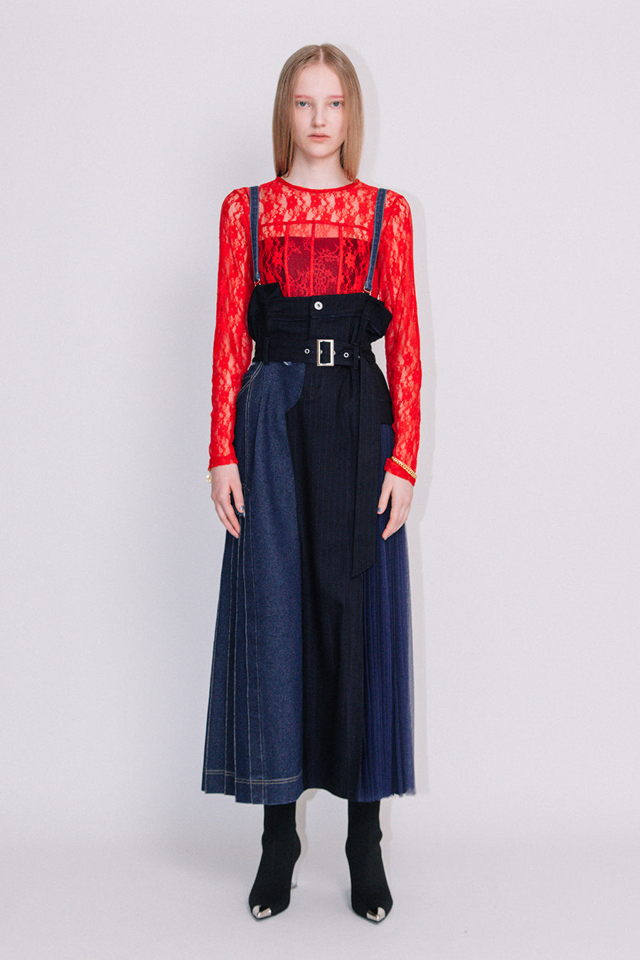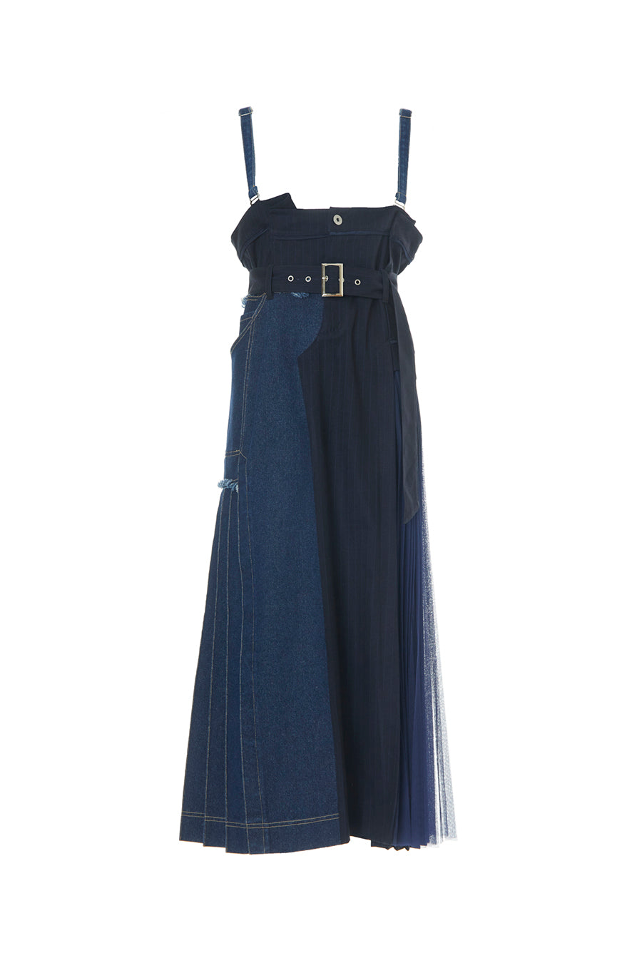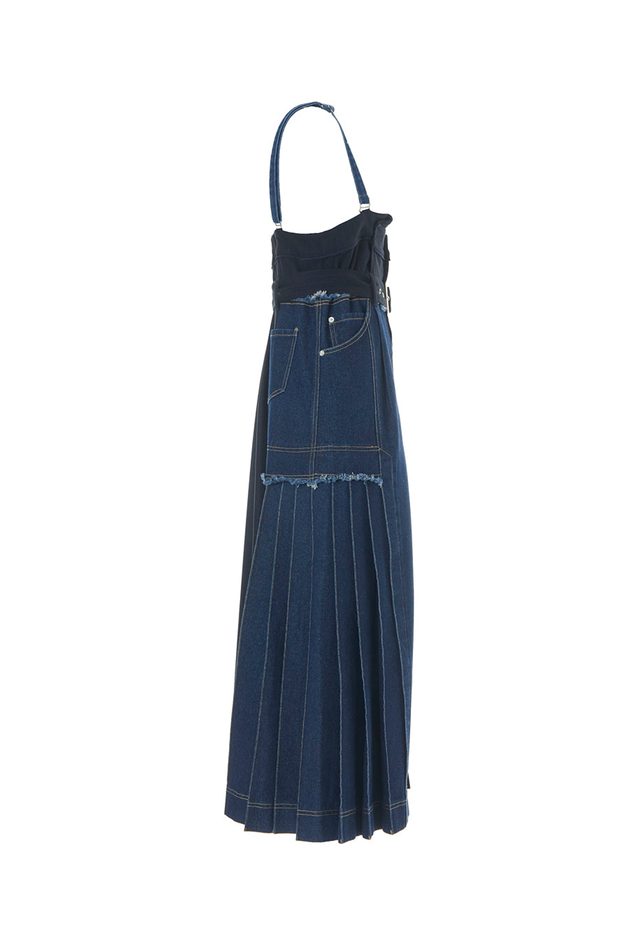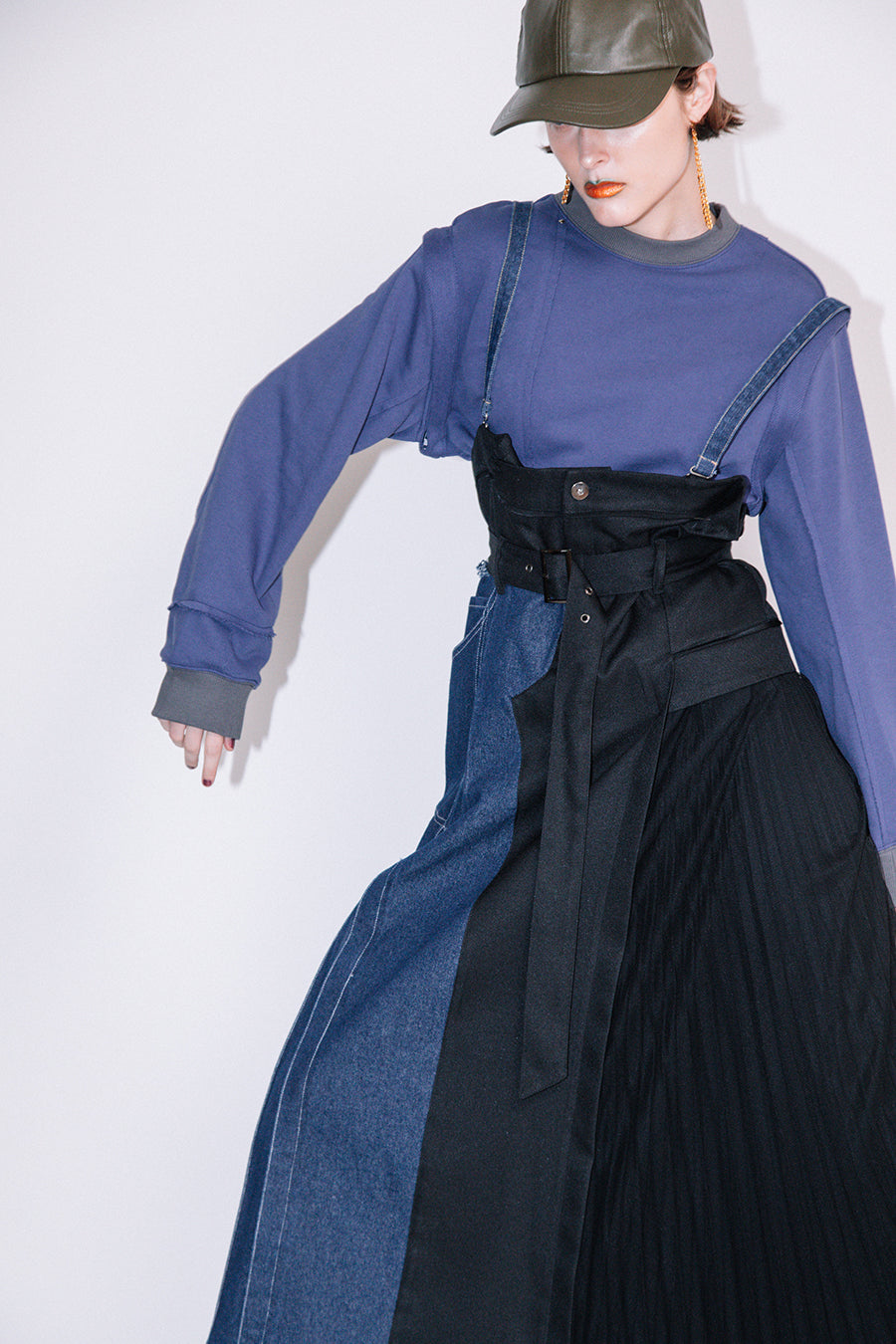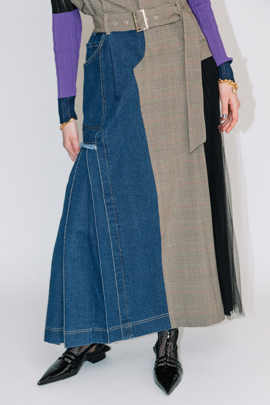 右サイドにはデニムタックプリーツ、左サイドにはチュールプリーツを施し、裾にかけて広がるフレアラインが女性らしい立体的なシルエットに仕上げたアイテム。バスト・ウエストはゆとりのある寸法設定なので、厚手のトップスをインナーにしても◎