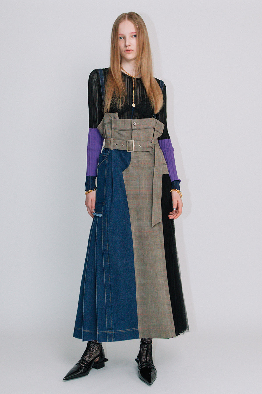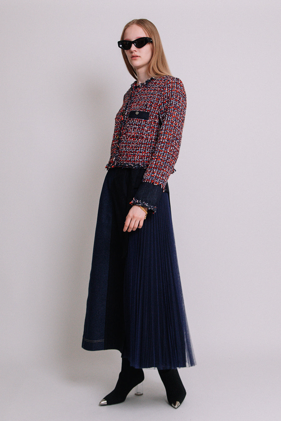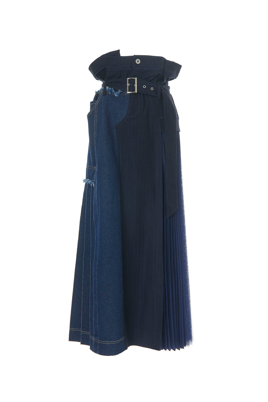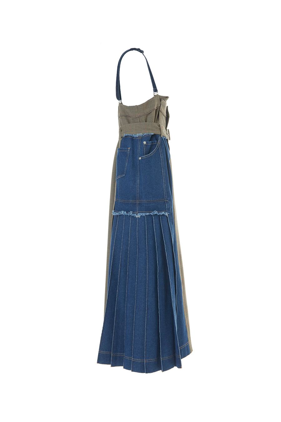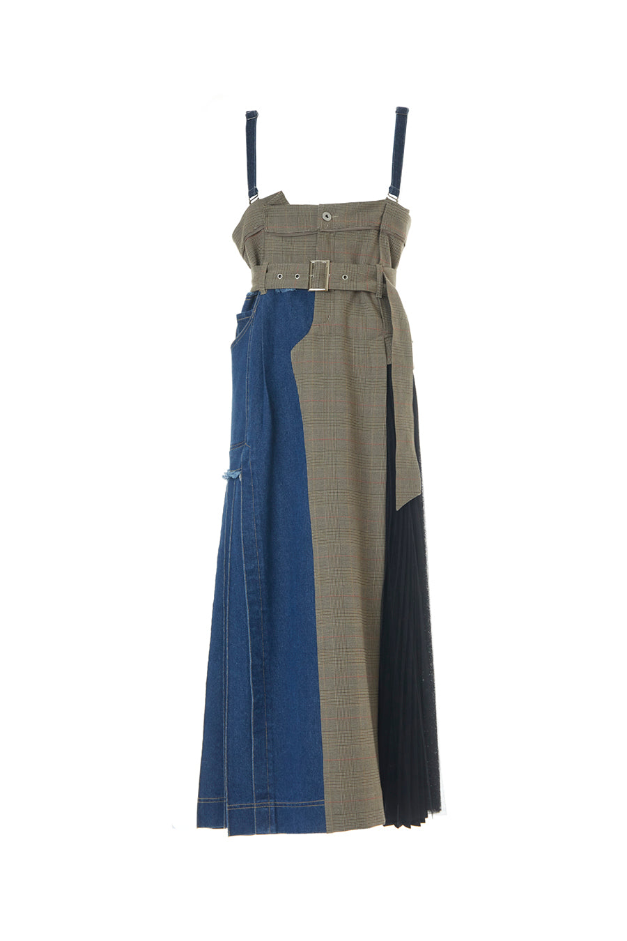 右サイドにはデニムタックプリーツ、左サイドにはチュールプリーツを施し、裾にかけて広がるフレアラインが女性らしい立体的なシルエットに仕上げたアイテム。バスト・ウエストはゆとりのある寸法設定なので、厚手のトップスをインナーにしても◎