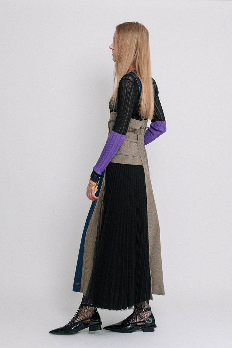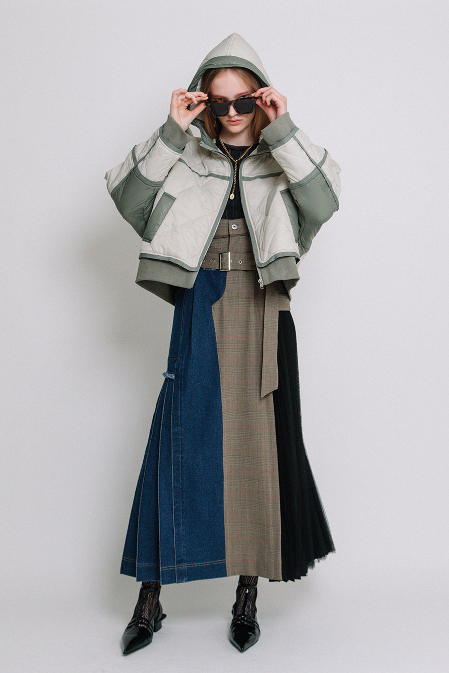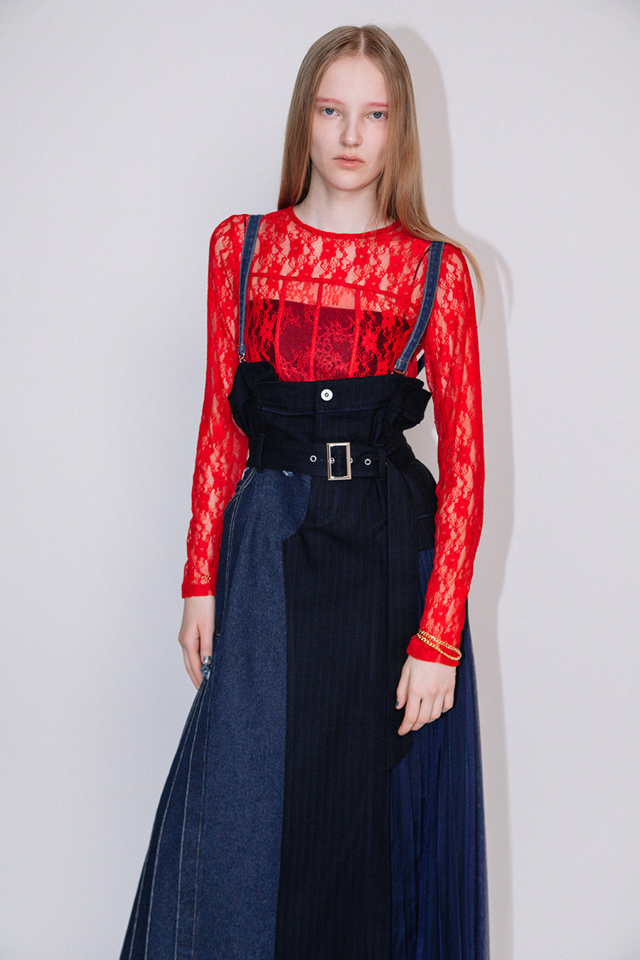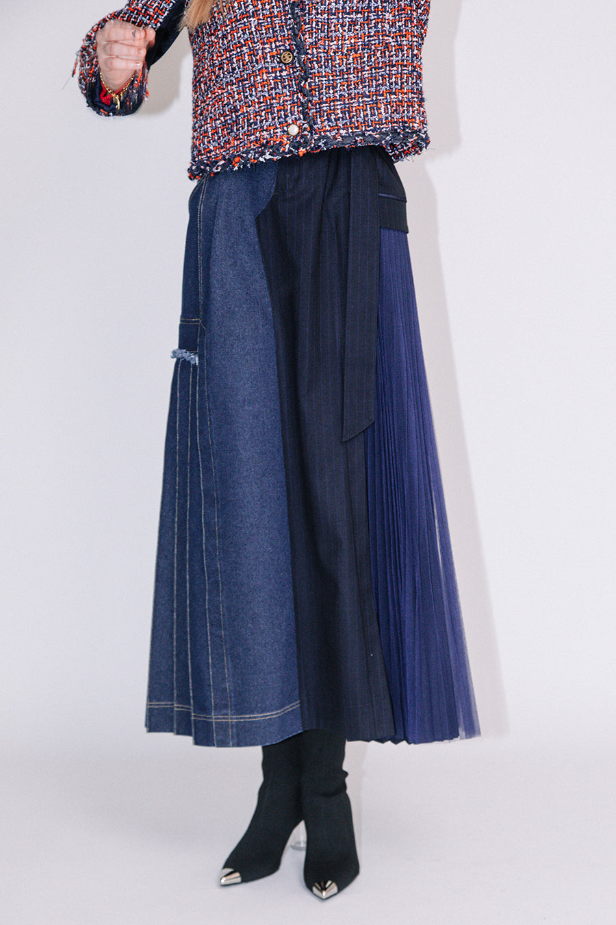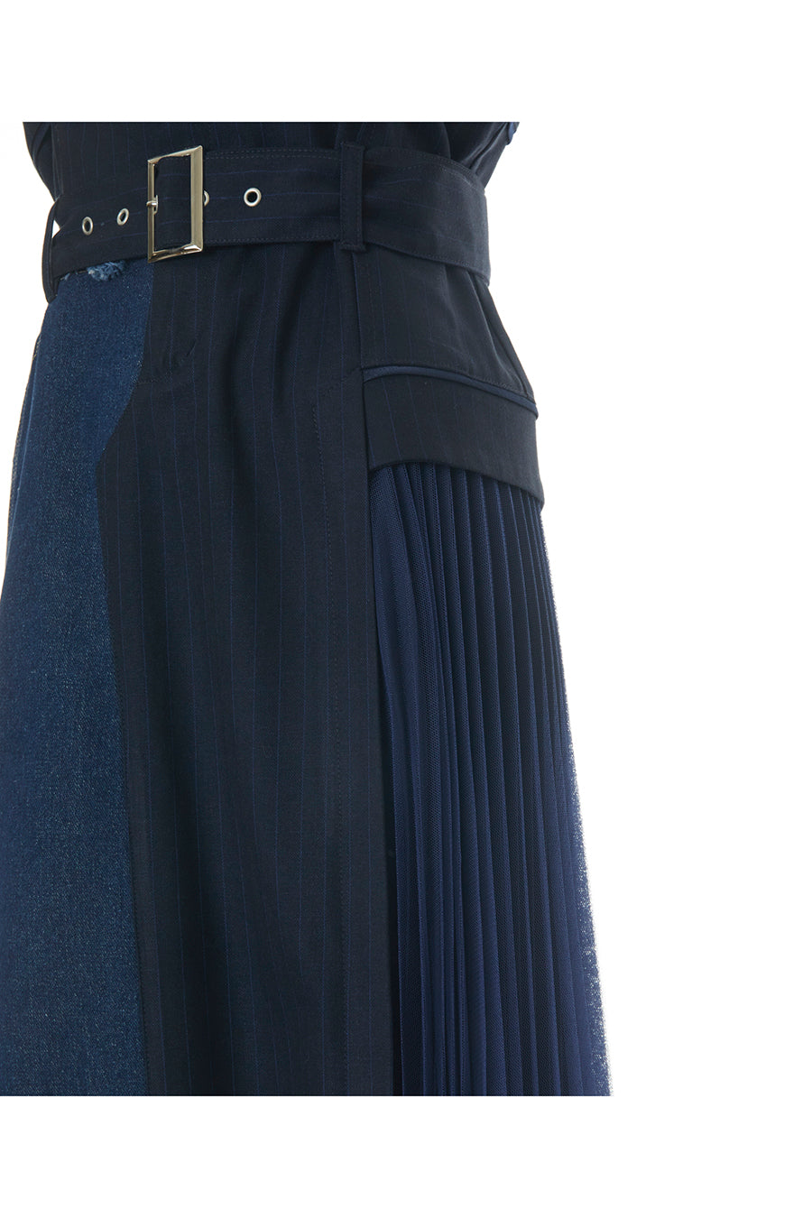 右サイドにはデニムタックプリーツ、左サイドにはチュールプリーツを施し、裾にかけて広がるフレアラインが女性らしい立体的なシルエットに仕上げたアイテム。バスト・ウエストはゆとりのある寸法設定なので、厚手のトップスをインナーにしても◎