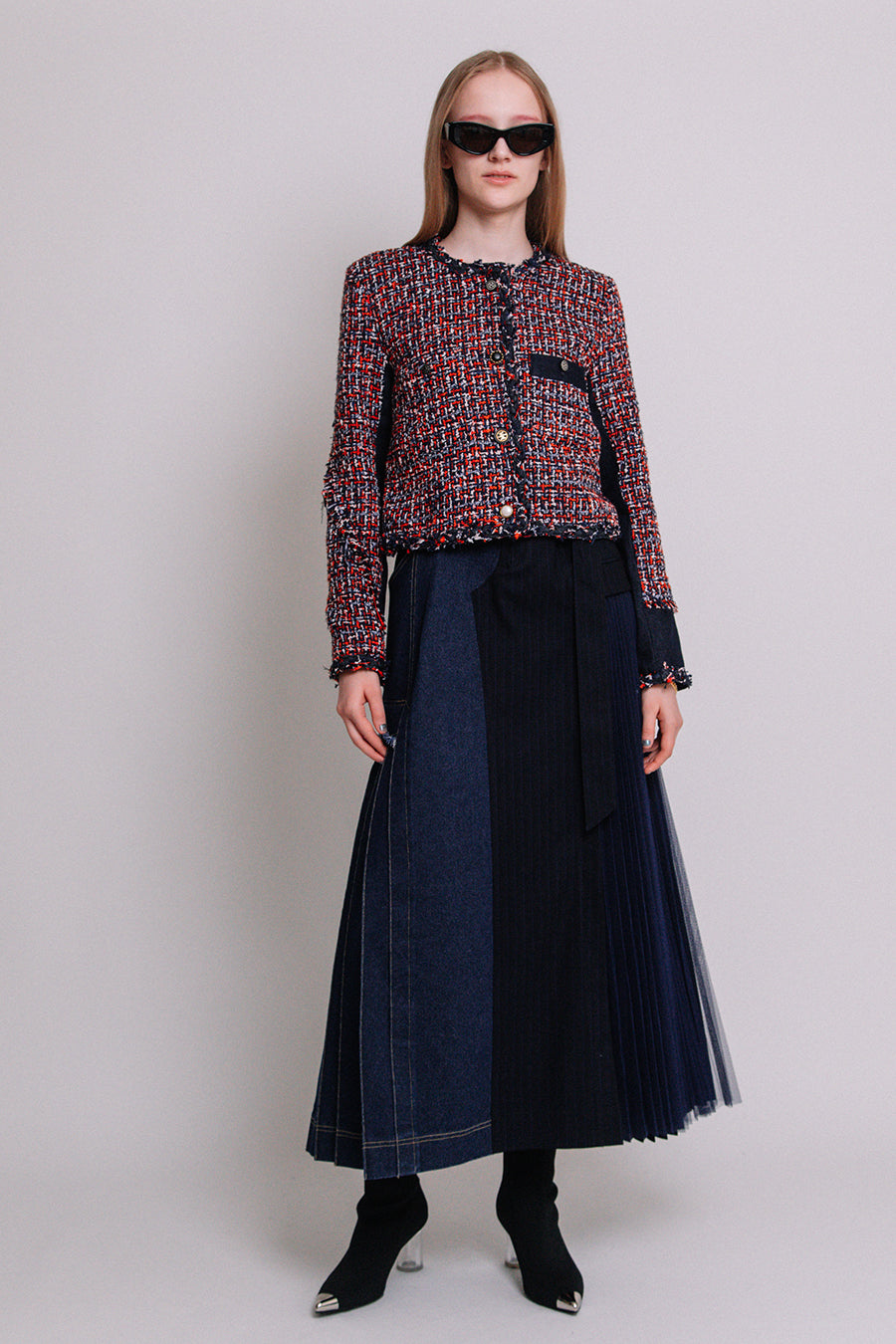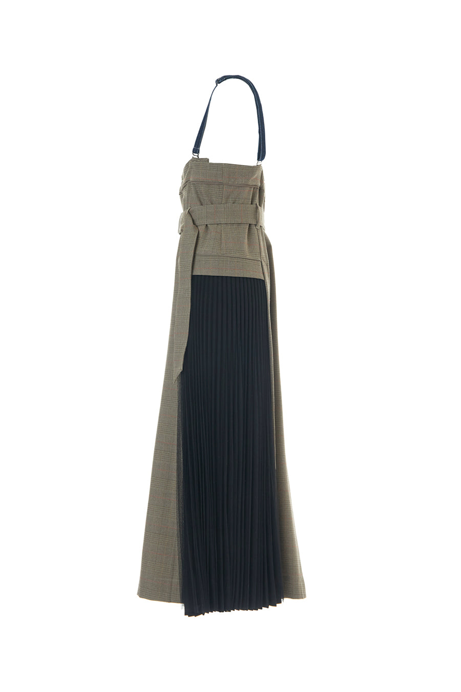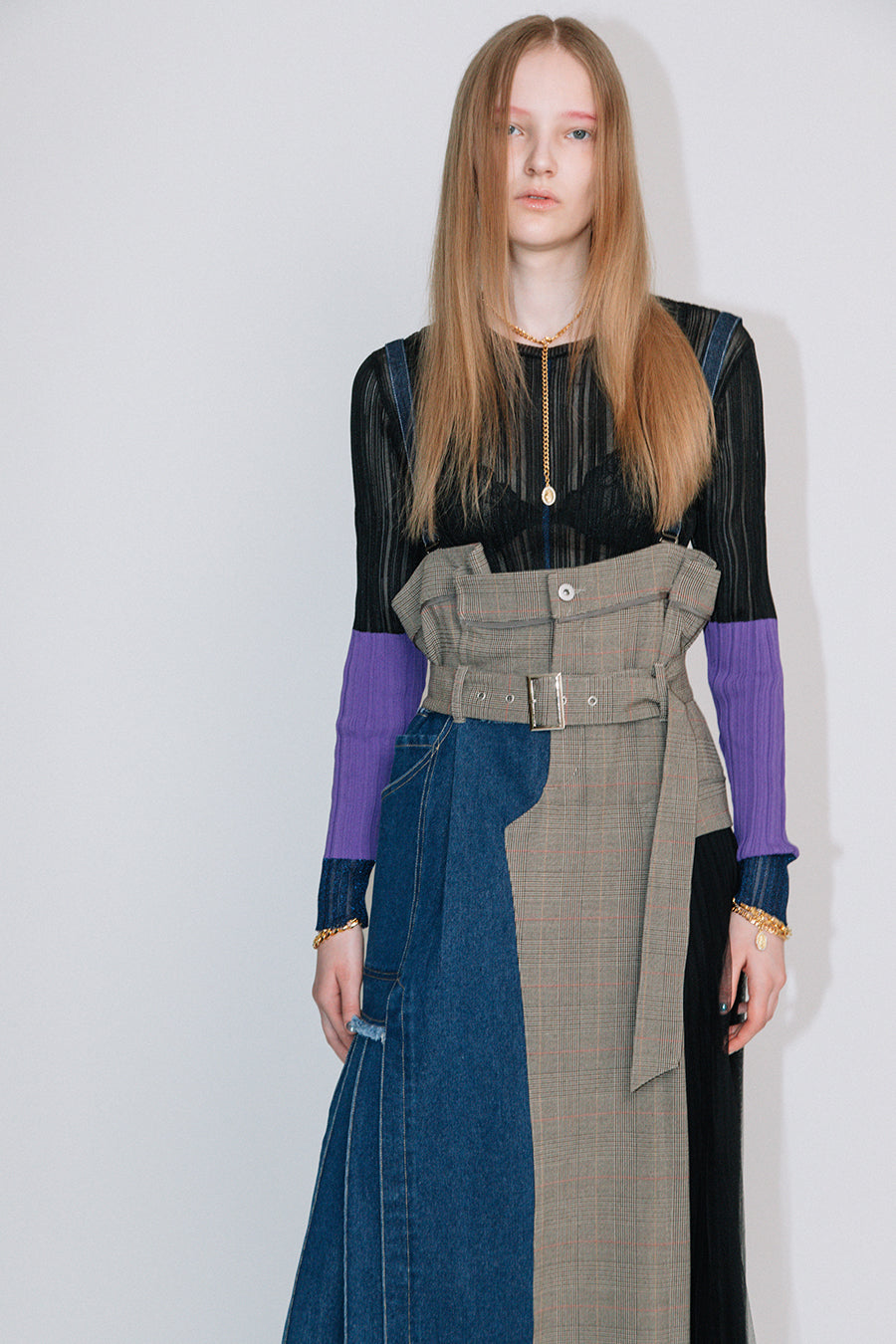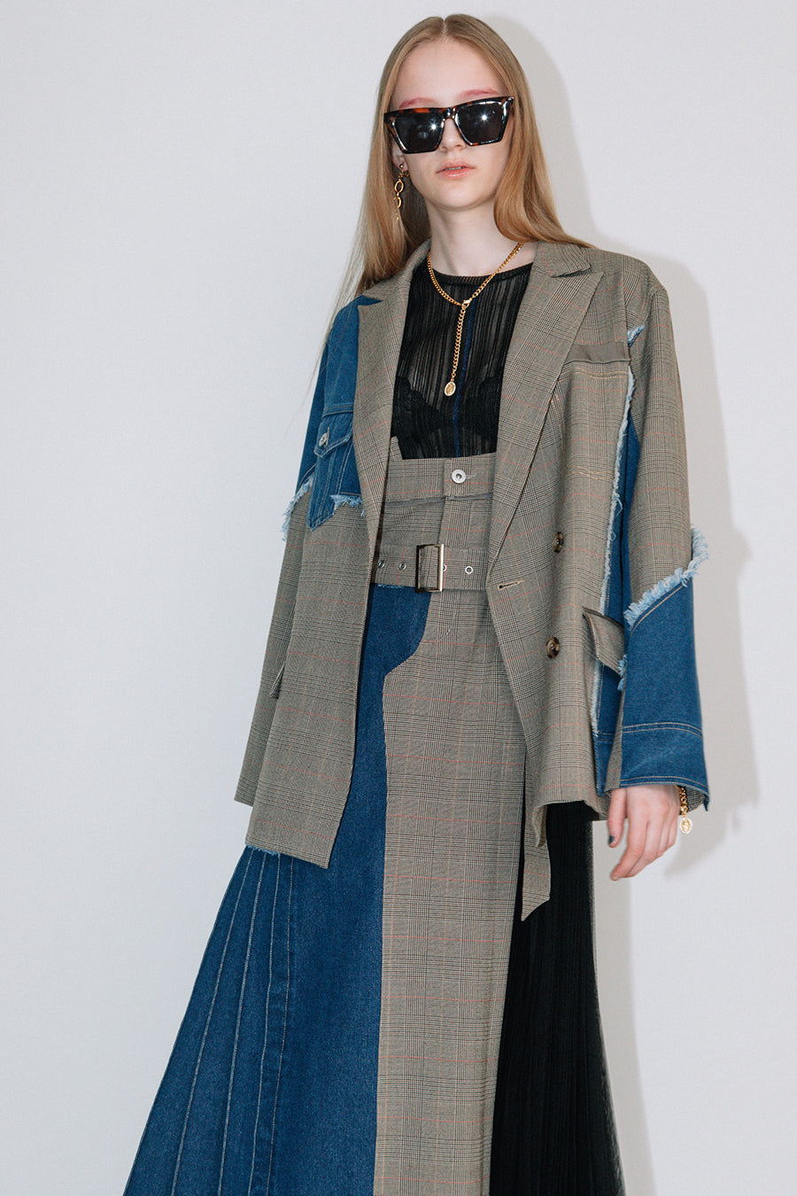 右サイドにはデニムタックプリーツ、左サイドにはチュールプリーツを施し、裾にかけて広がるフレアラインが女性らしい立体的なシルエットに仕上げたアイテム。バスト・ウエストはゆとりのある寸法設定なので、厚手のトップスをインナーにしても◎