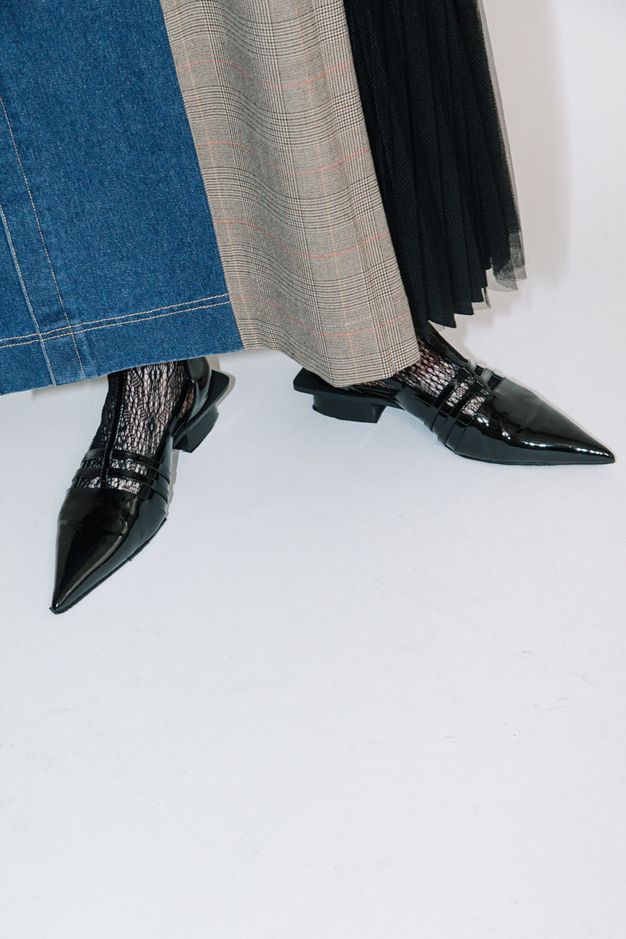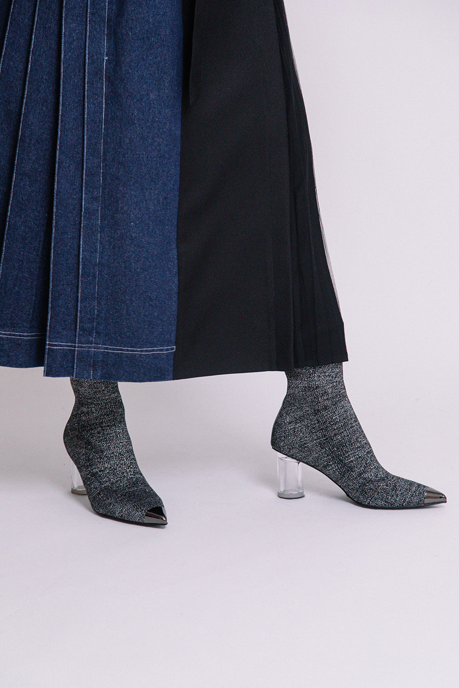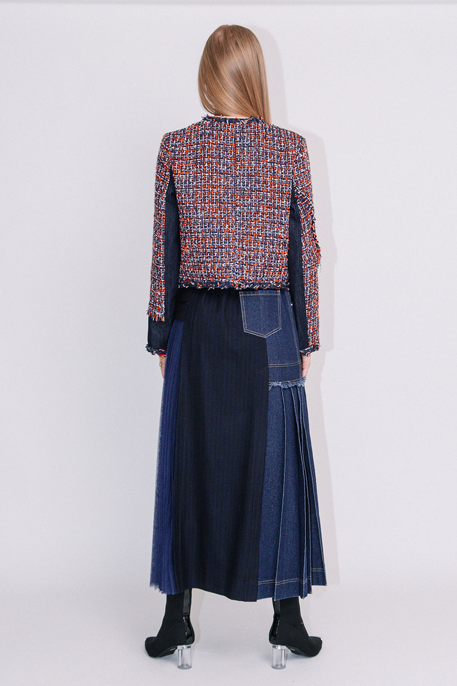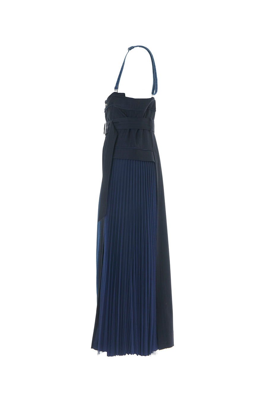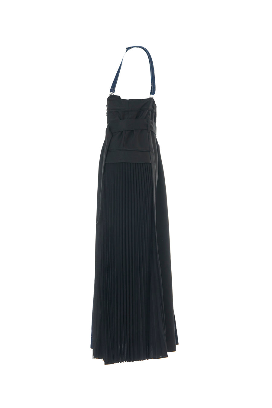 右サイドにはデニムタックプリーツ、左サイドにはチュールプリーツを施し、裾にかけて広がるフレアラインが女性らしい立体的なシルエットに仕上げたアイテム。バスト・ウエストはゆとりのある寸法設定なので、厚手のトップスをインナーにしても◎