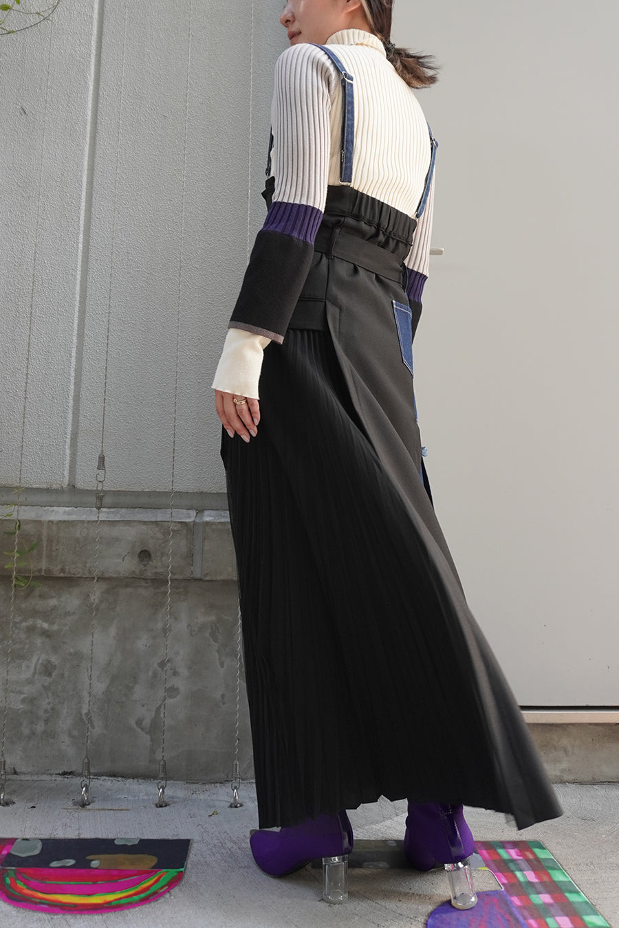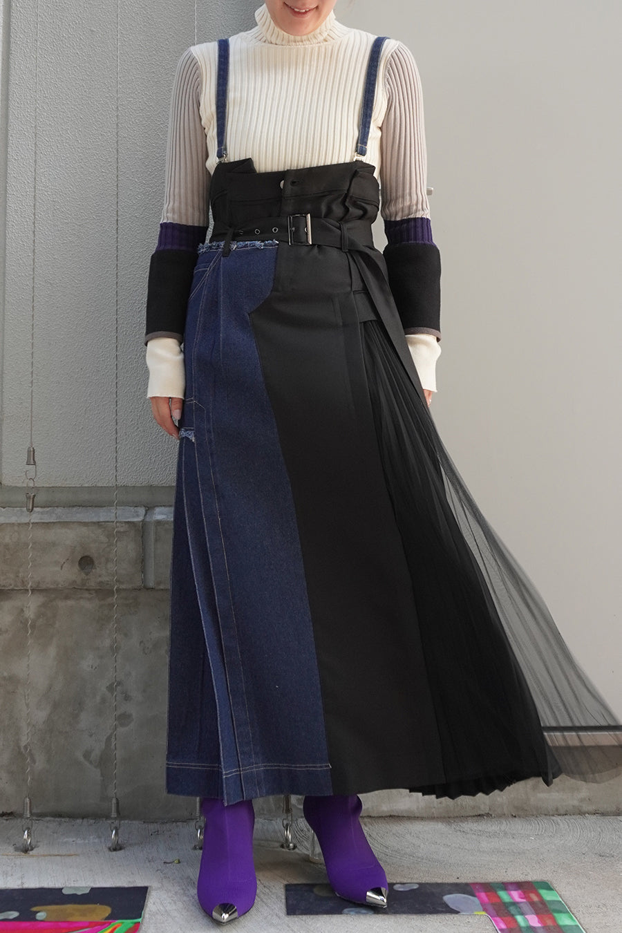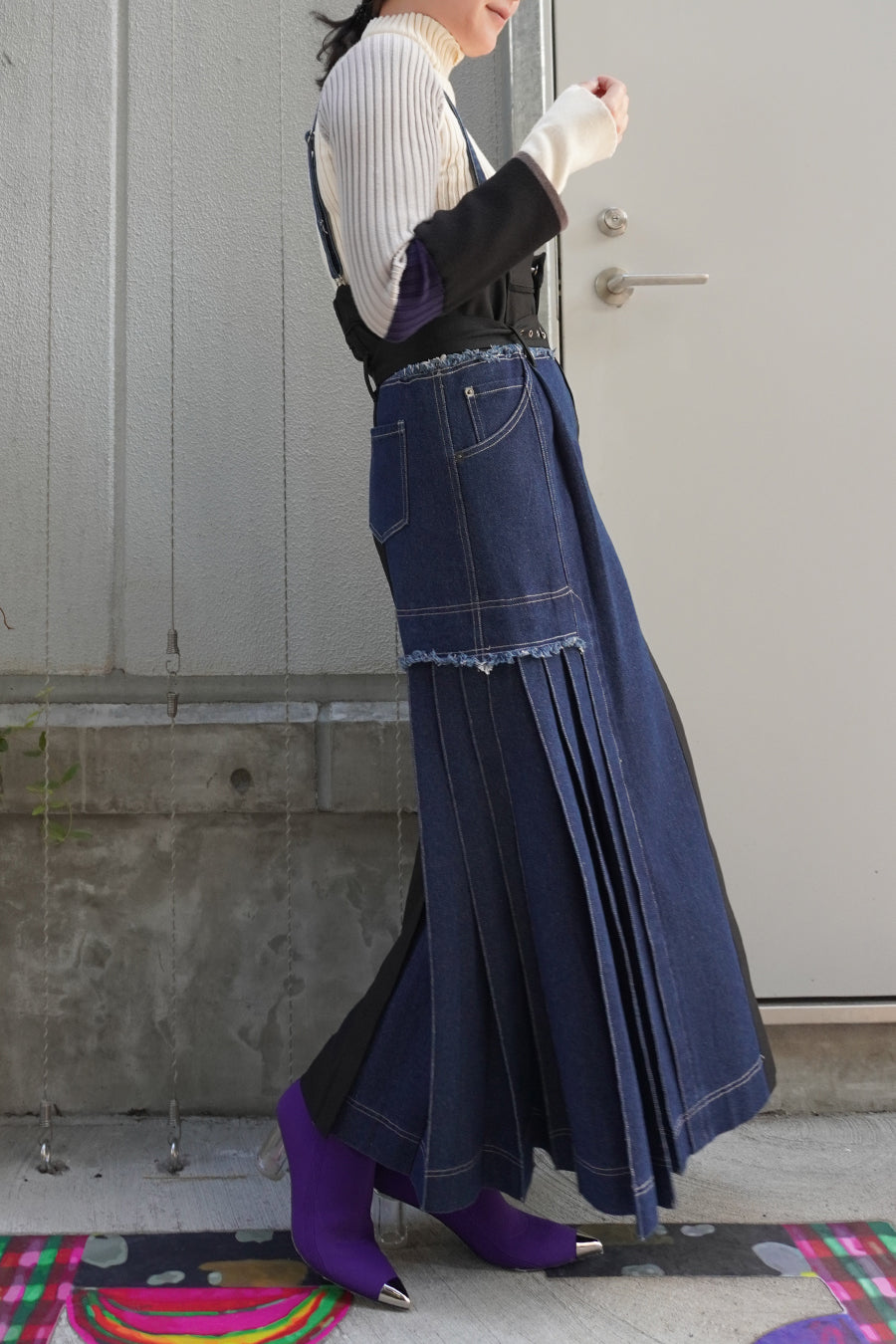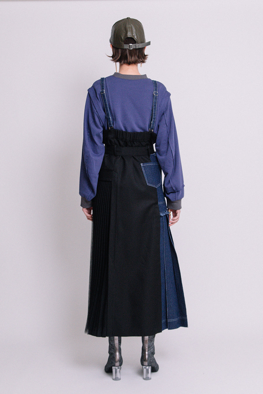 デニムコンビのアシンメトリージャンパースカート。綺麗めな梳毛調合繊生地とデニムの組み合わせが大人カジュアルな印象に。