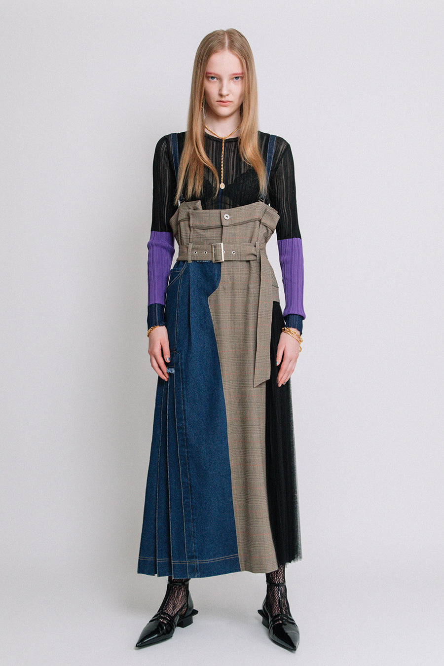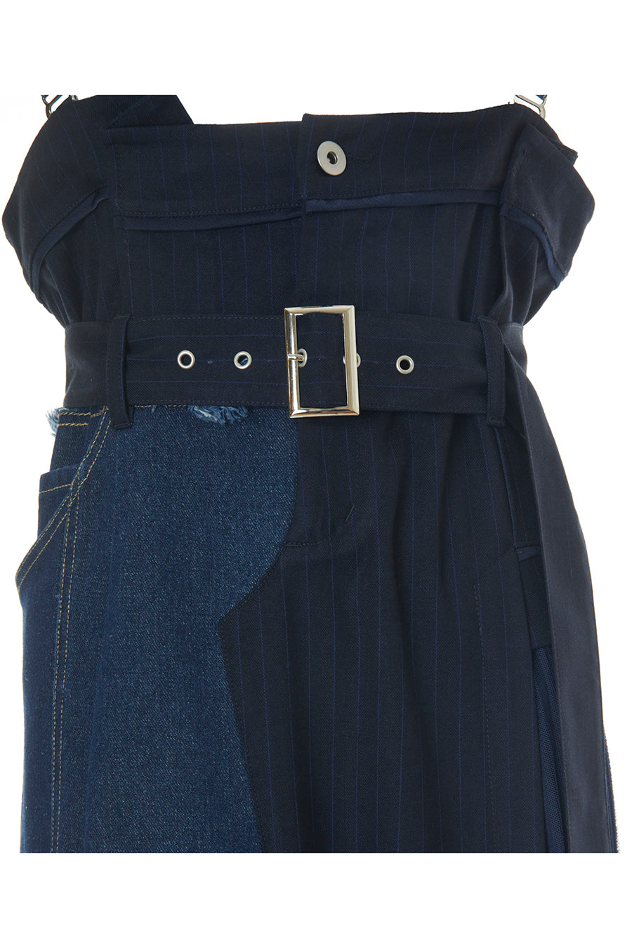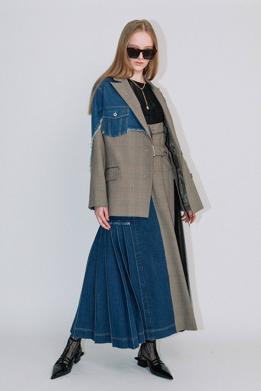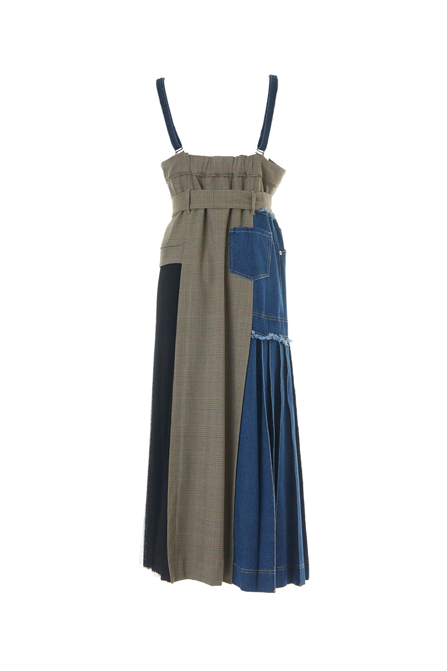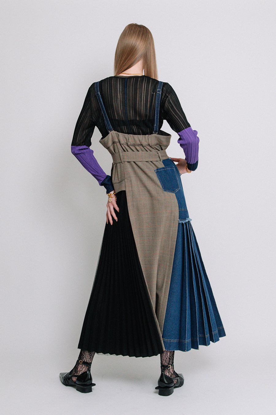 デニムコンビのアシンメトリージャンパースカート。綺麗めな梳毛調合繊生地とデニムの組み合わせが大人カジュアルな印象に。