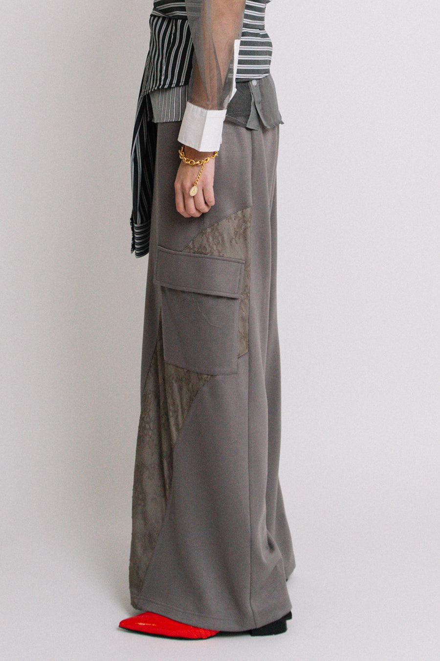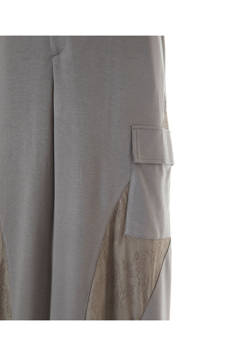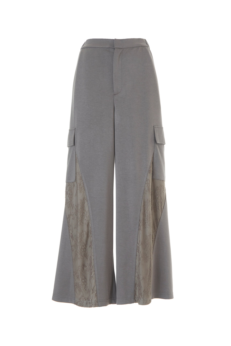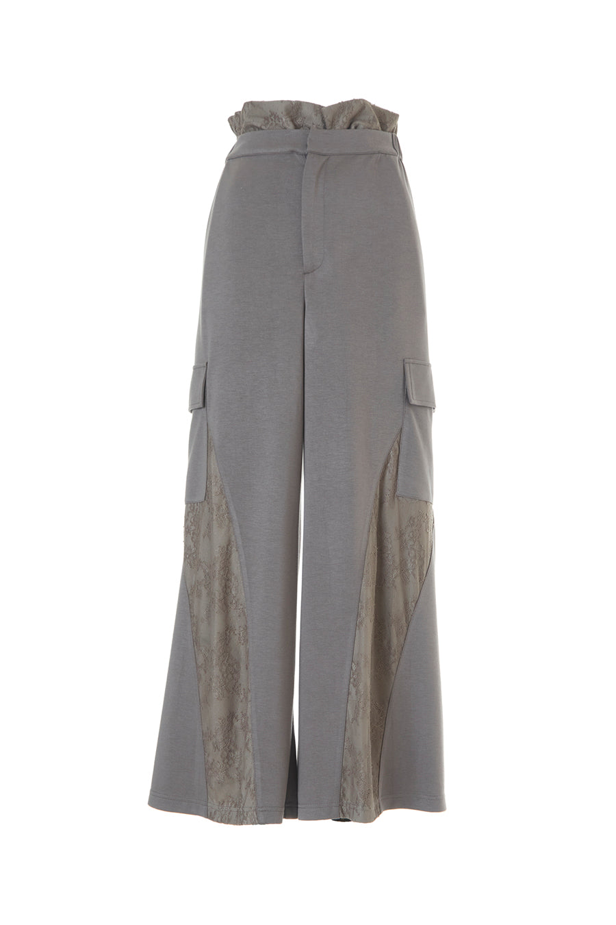 カーゴパンツに繊細なレースを切り替えることでカジュアルさと上品さを併せ持つ遊び心のあるアイテムに。
