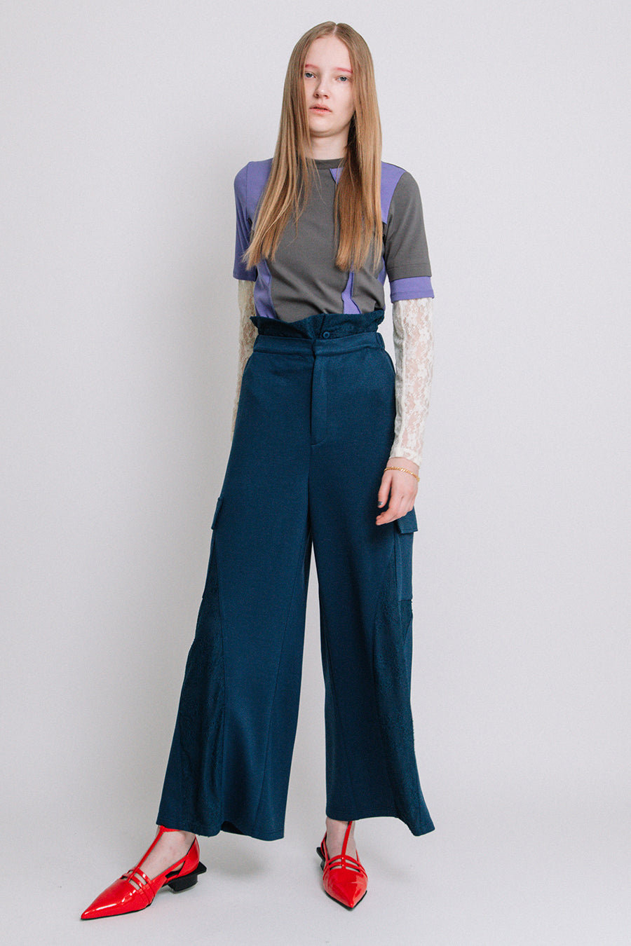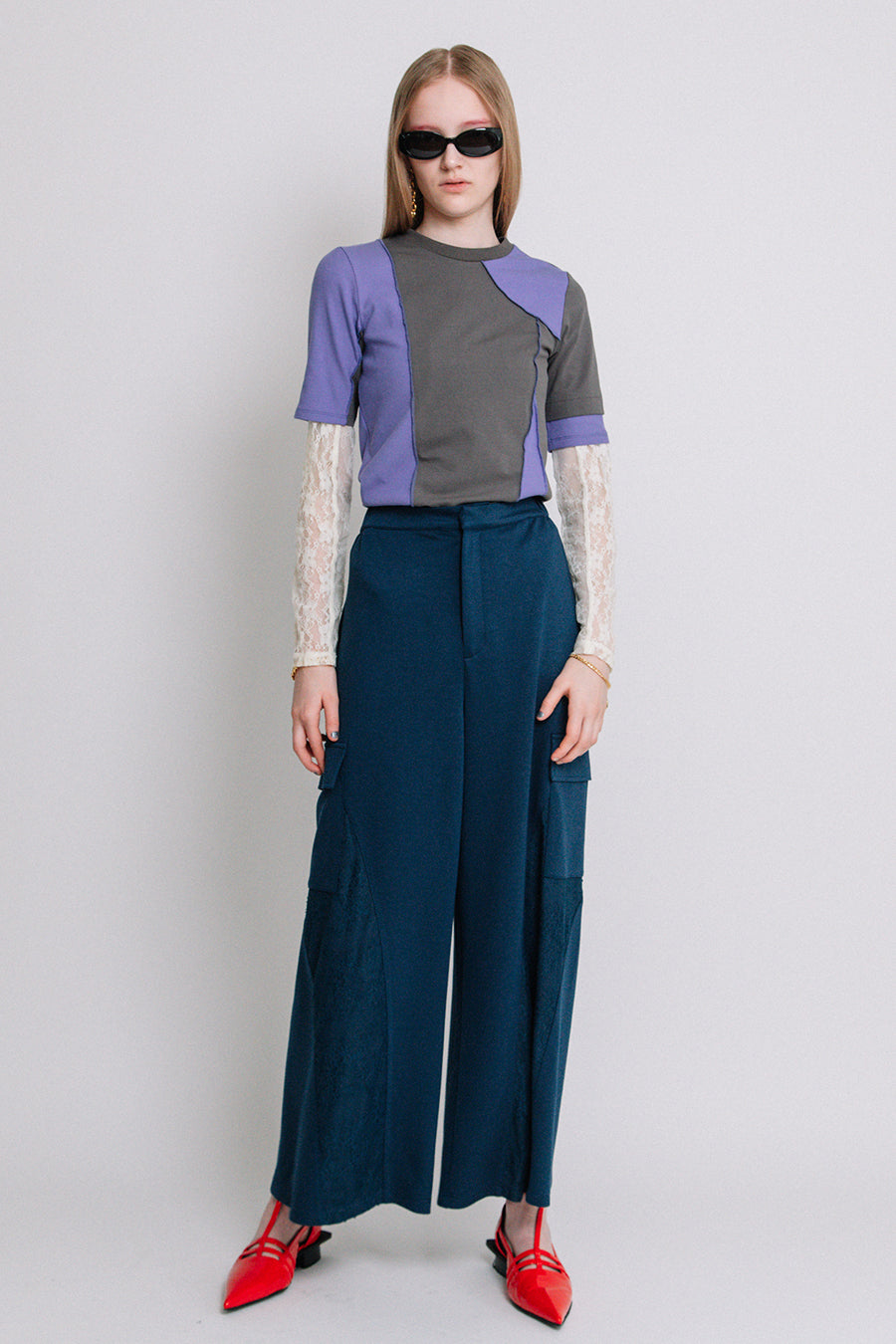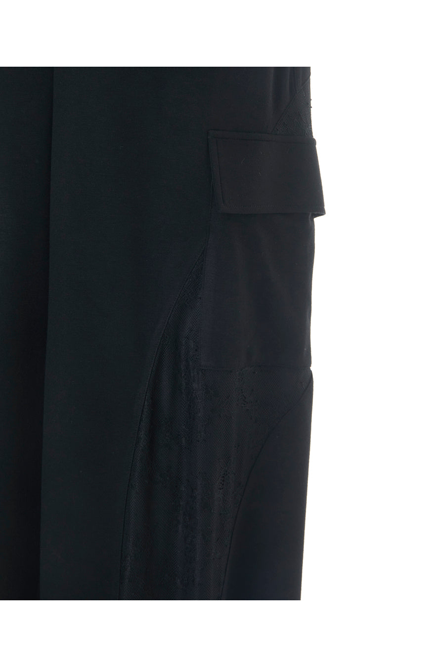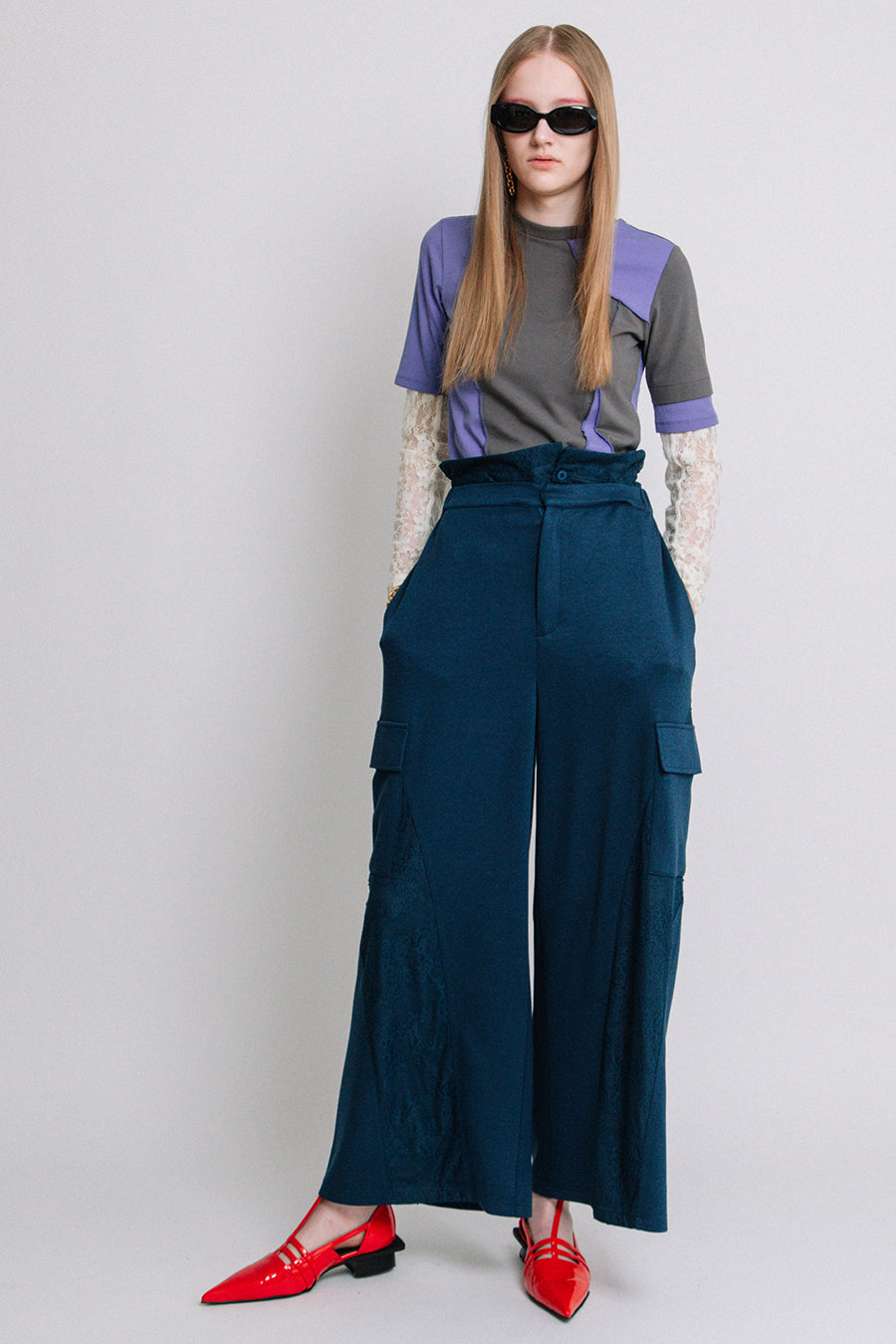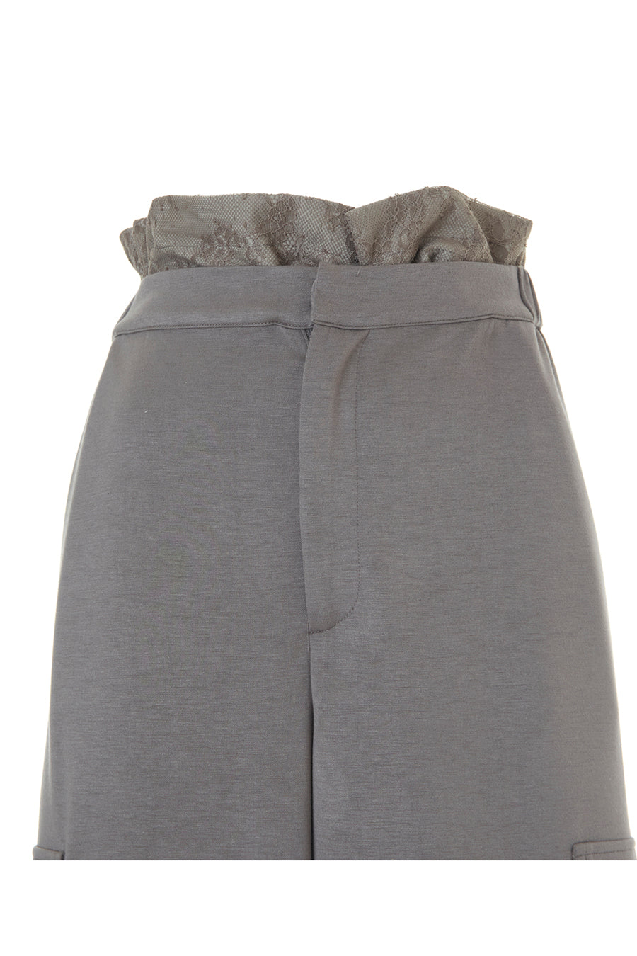 カーゴパンツに繊細なレースを切り替えることでカジュアルさと上品さを併せ持つ遊び心のあるアイテムに。