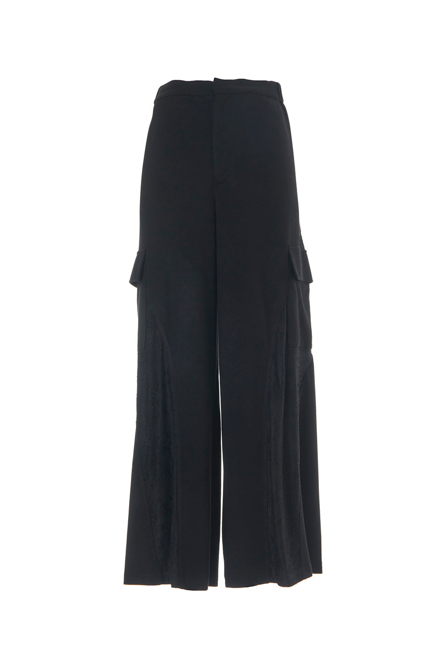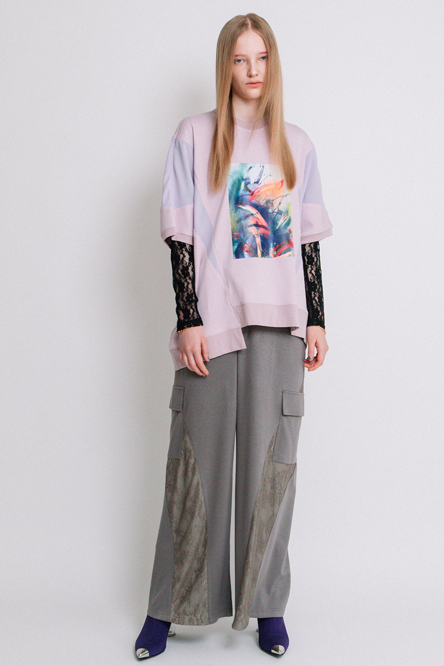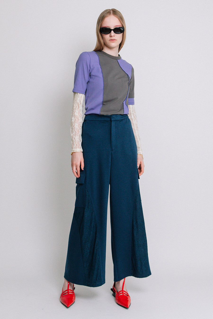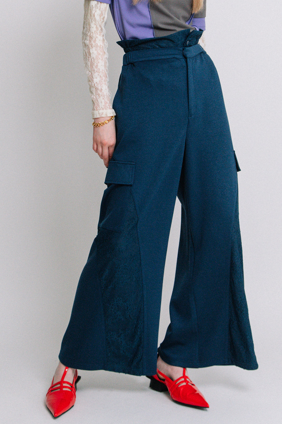 カーゴパンツに繊細なレースを切り替えることでカジュアルさと上品さを併せ持つ遊び心のあるアイテムに。