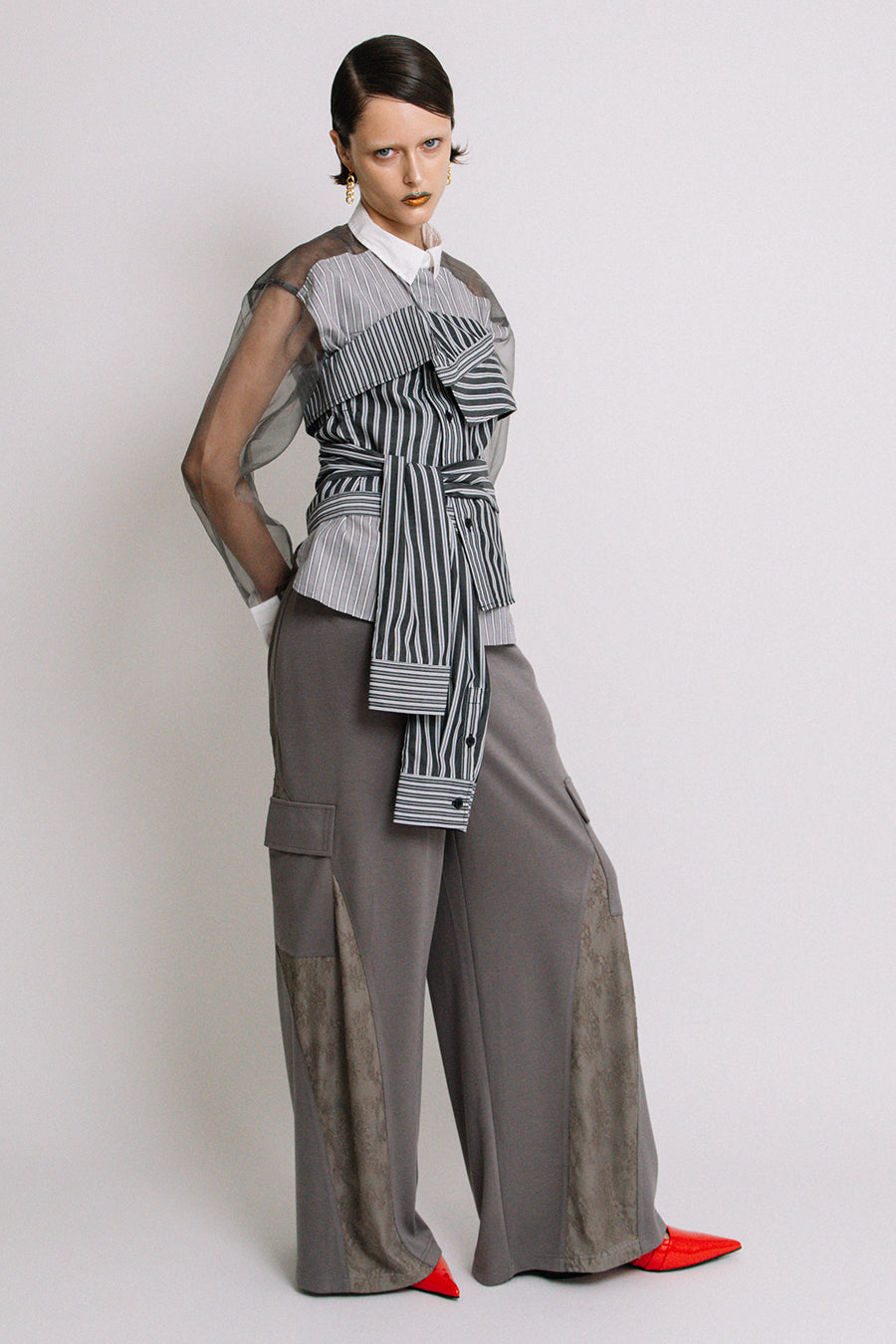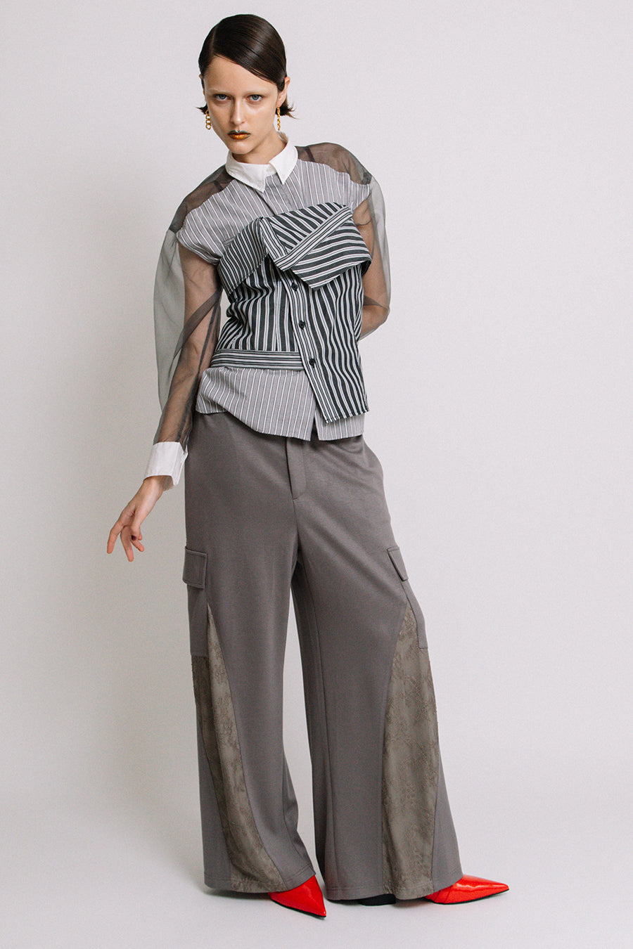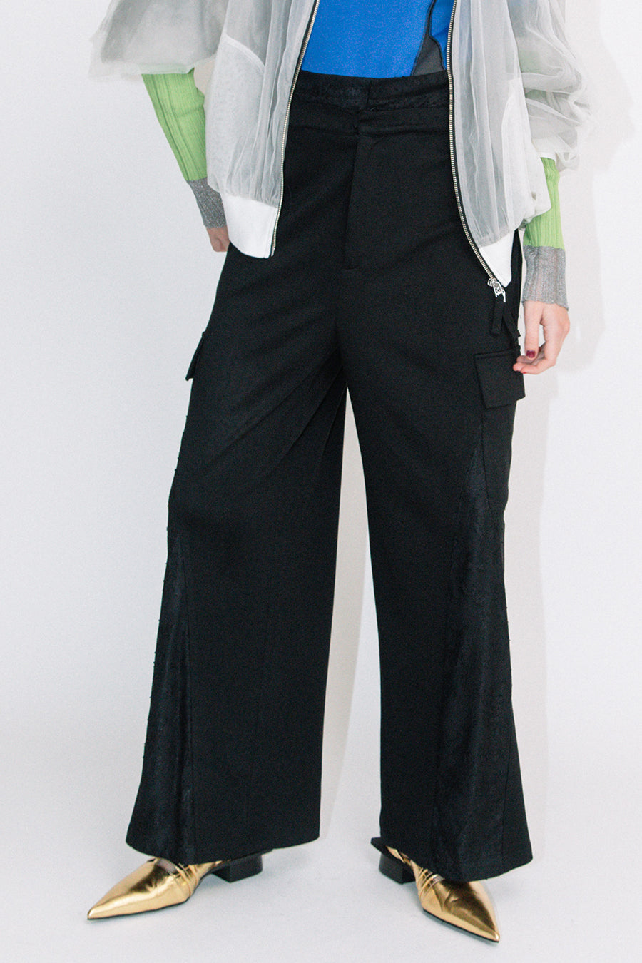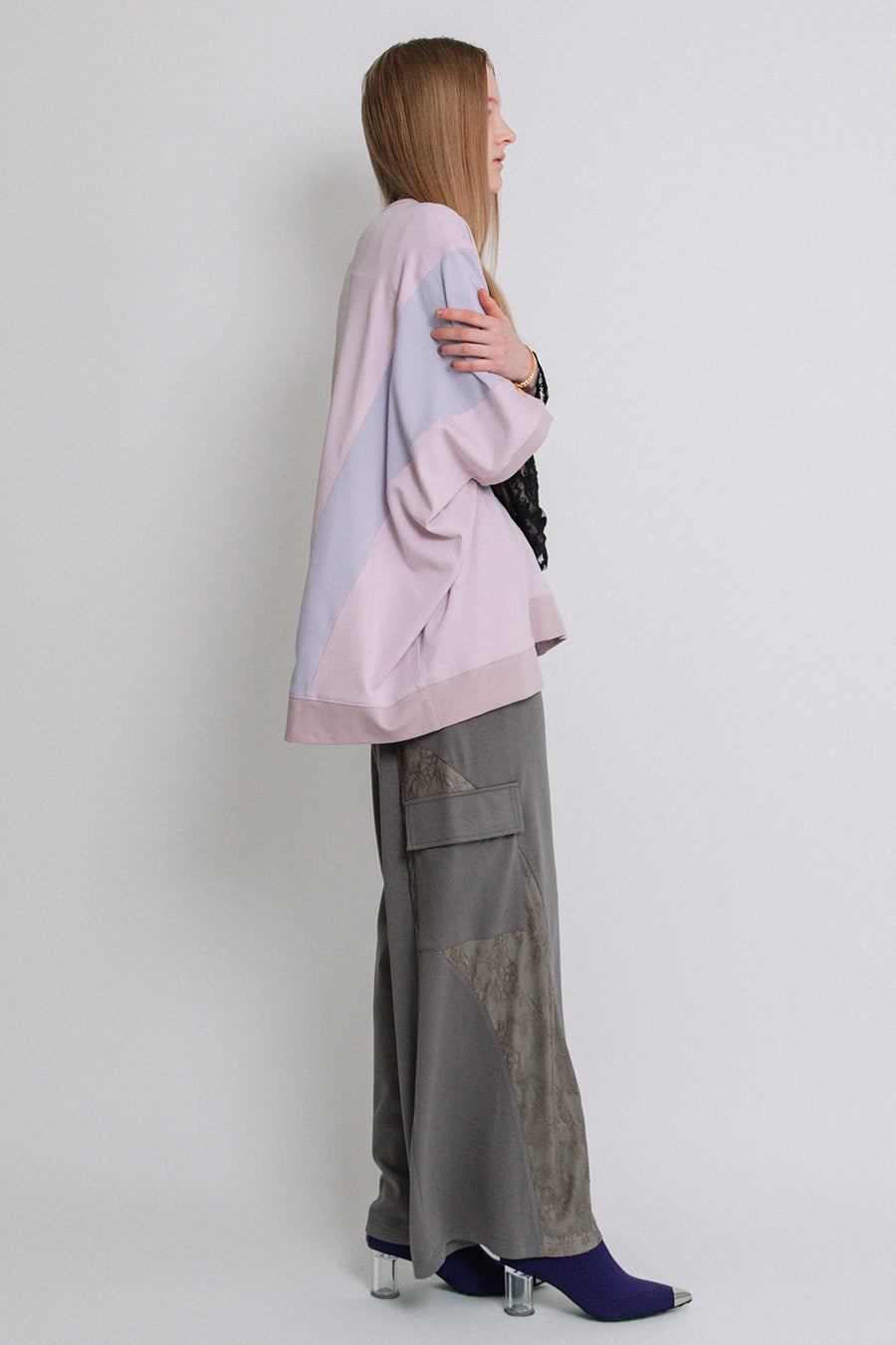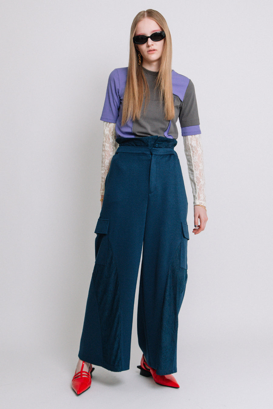 カーゴパンツに繊細なレースを切り替えることでカジュアルさと上品さを併せ持つ遊び心のあるアイテムに。