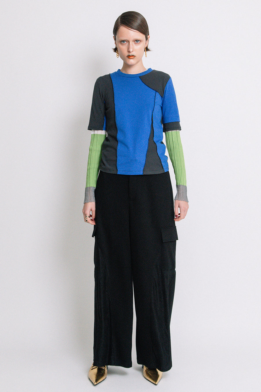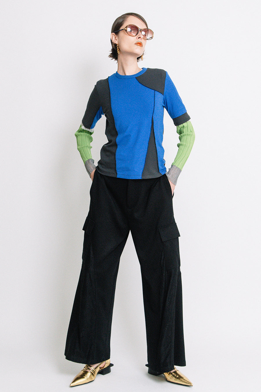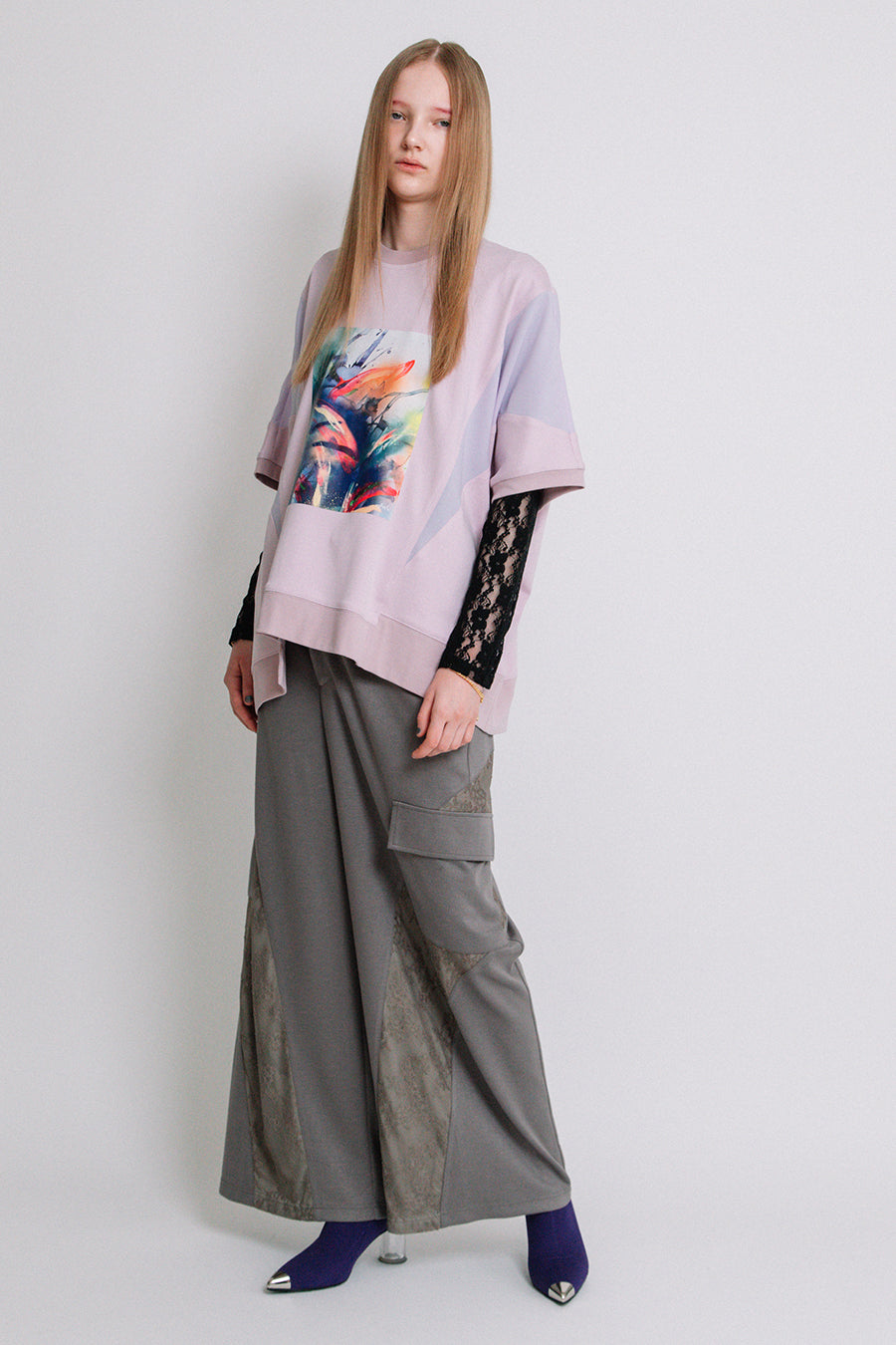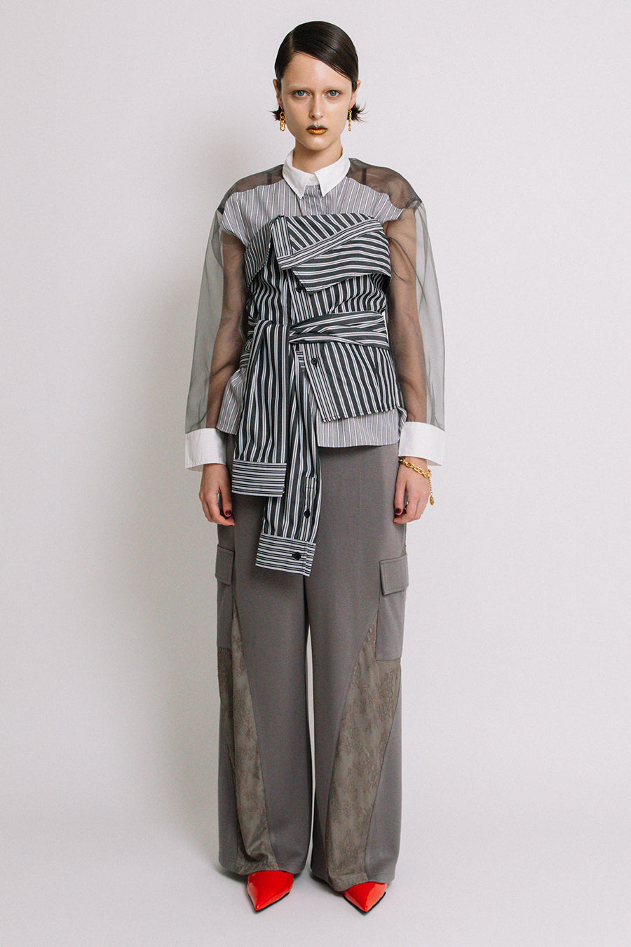 カーゴパンツに繊細なレースを切り替えることでカジュアルさと上品さを併せ持つ遊び心のあるアイテムに。