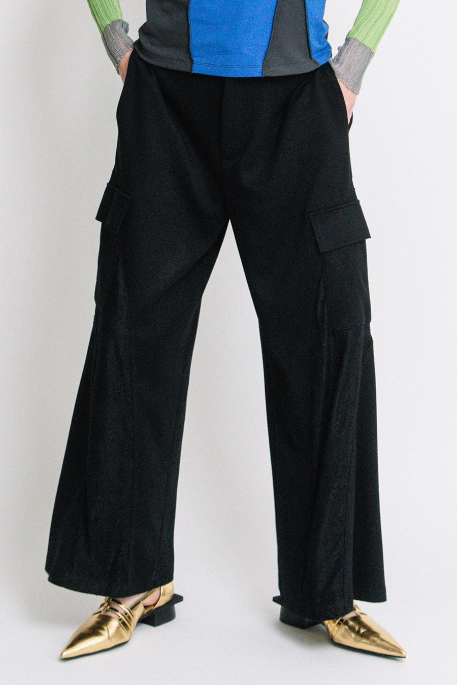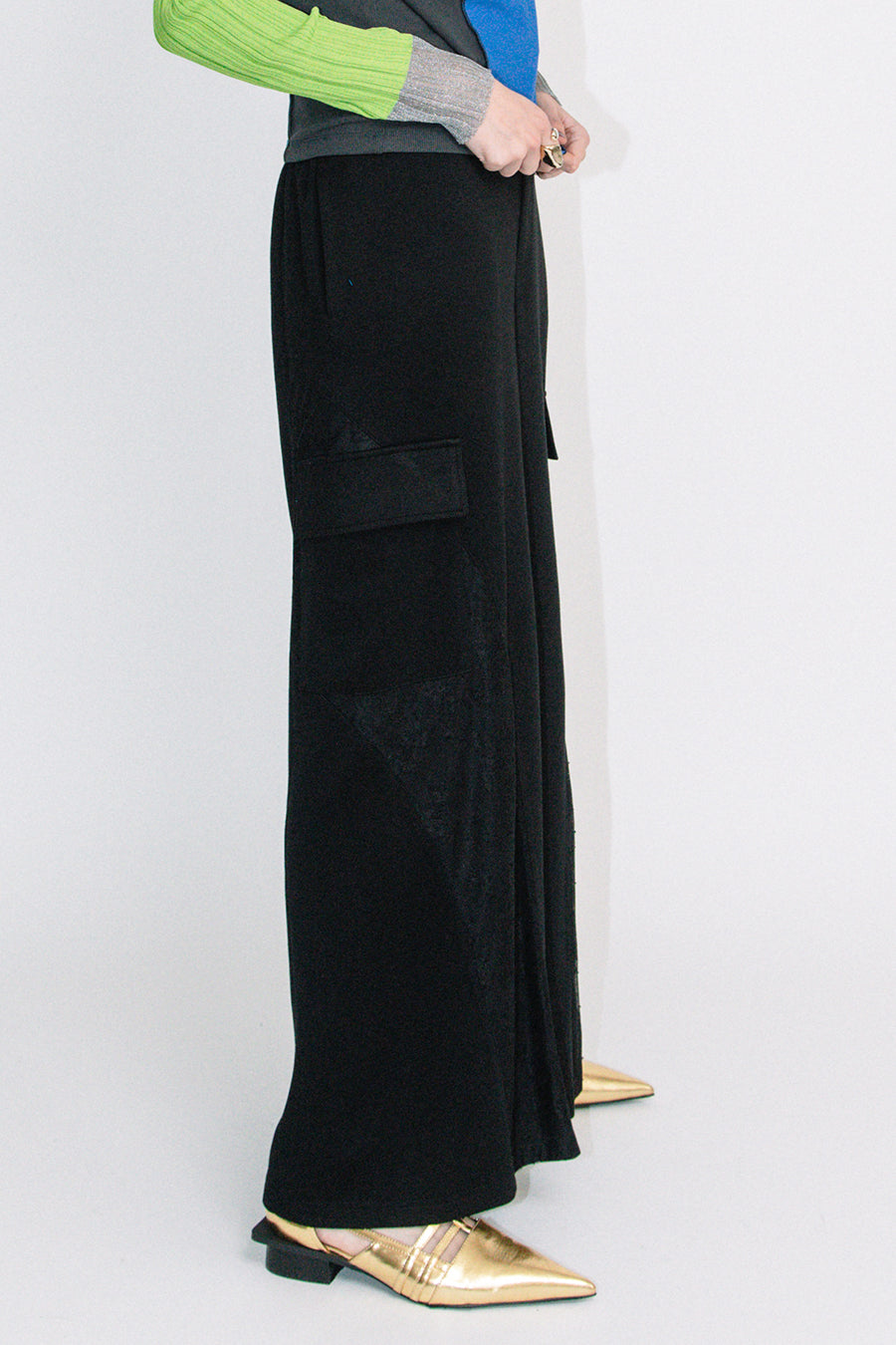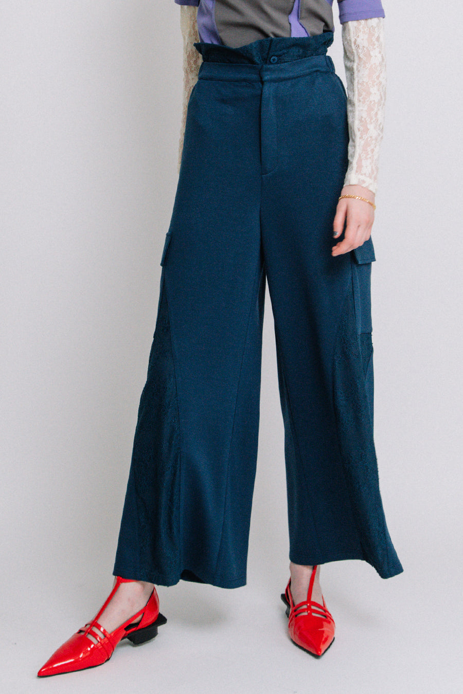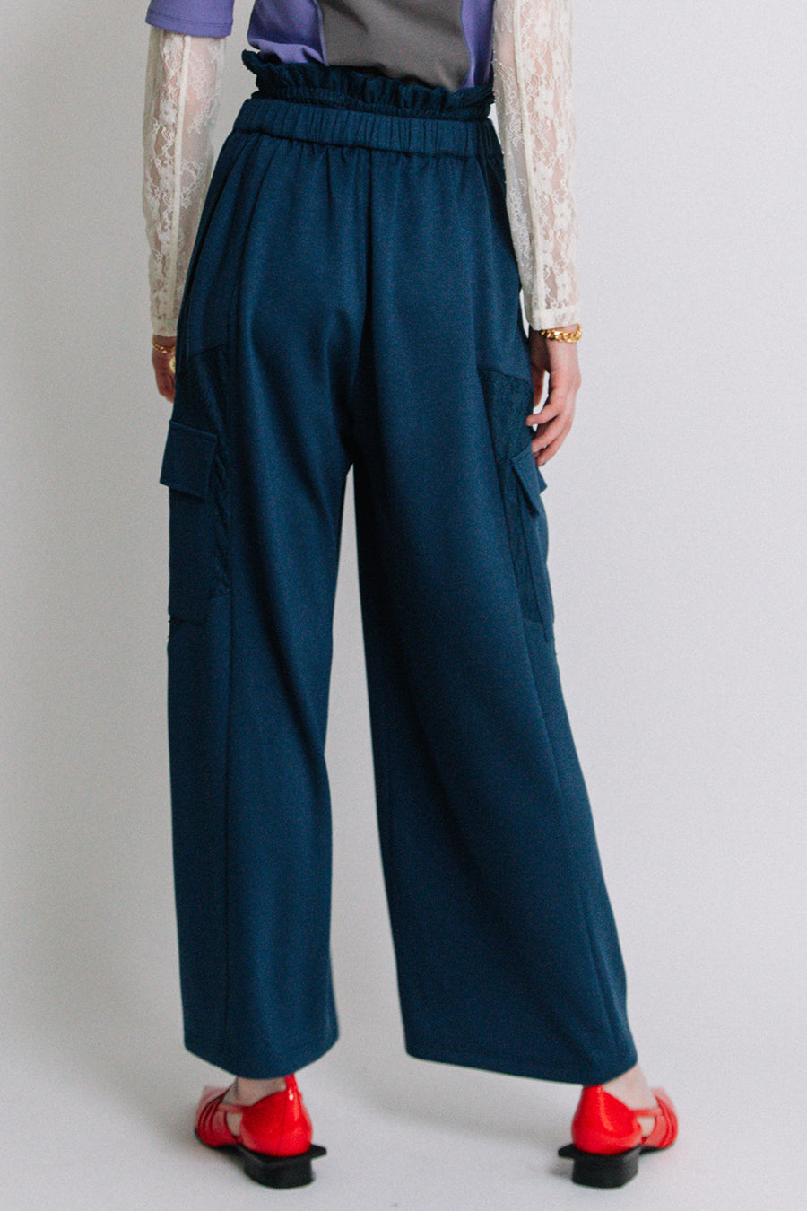 サイドのカーブラインのレース切り替えが華やかなイージーカーゴパンツ。
