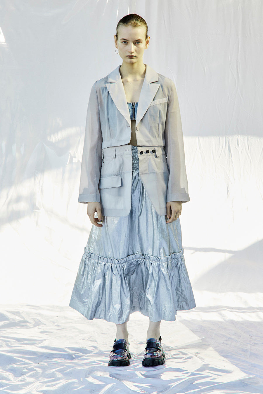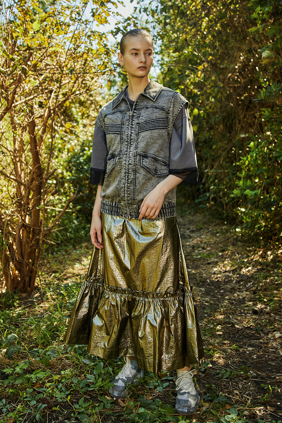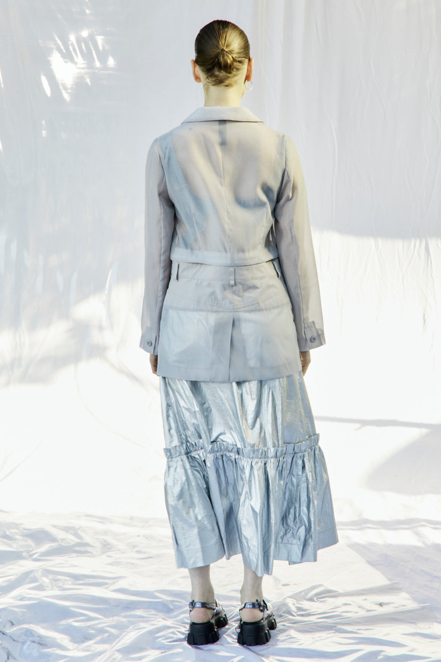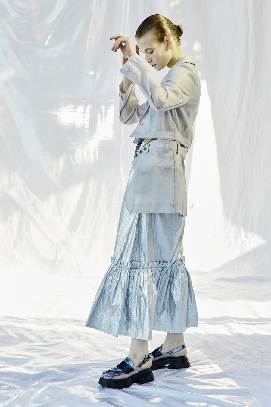 メタリックシャーリングティアードスカート