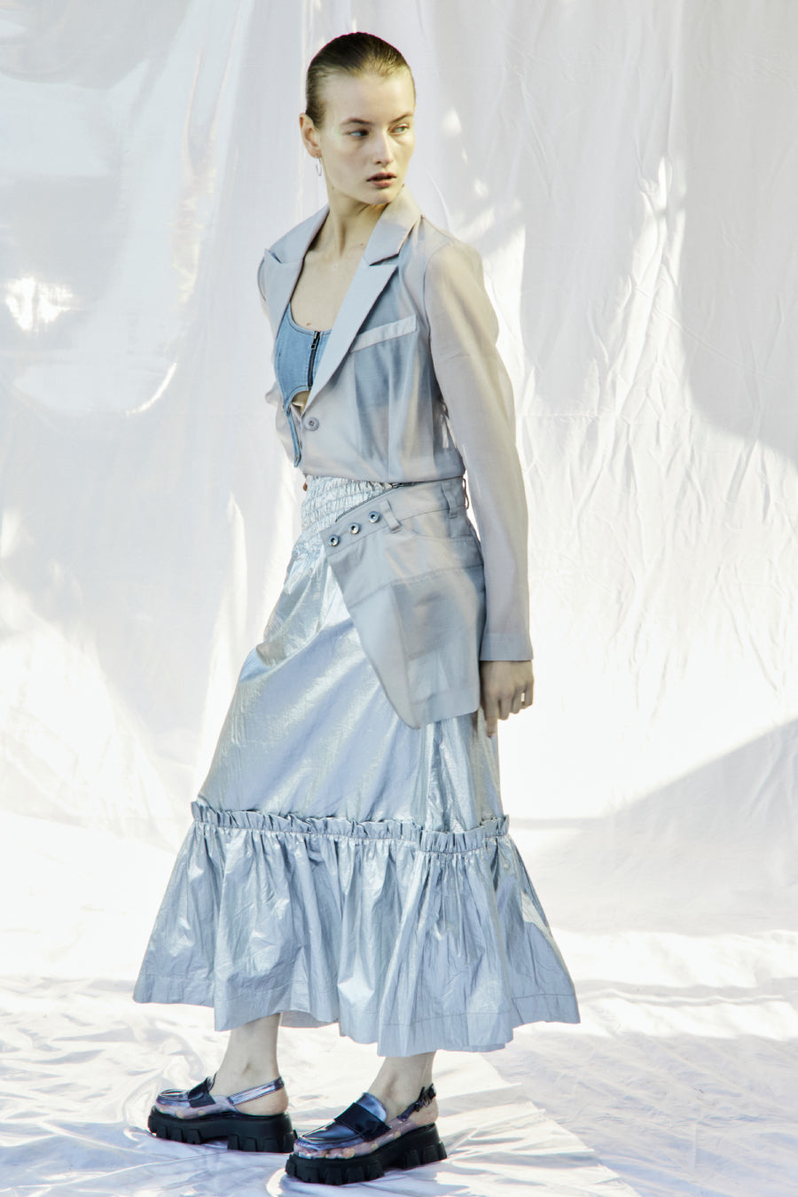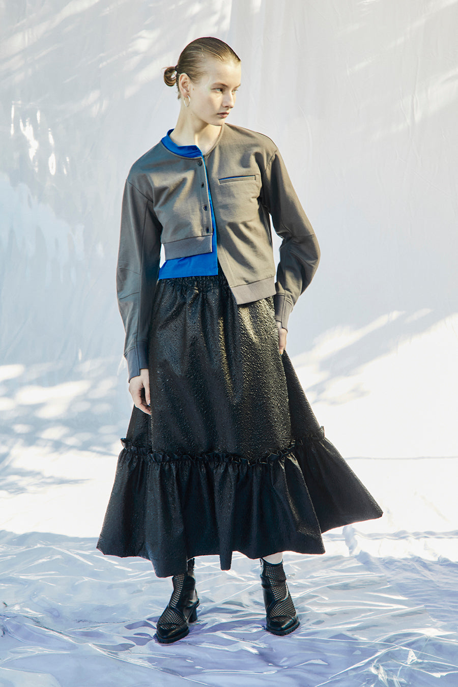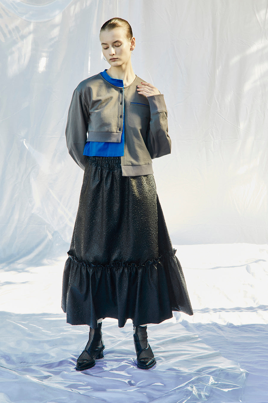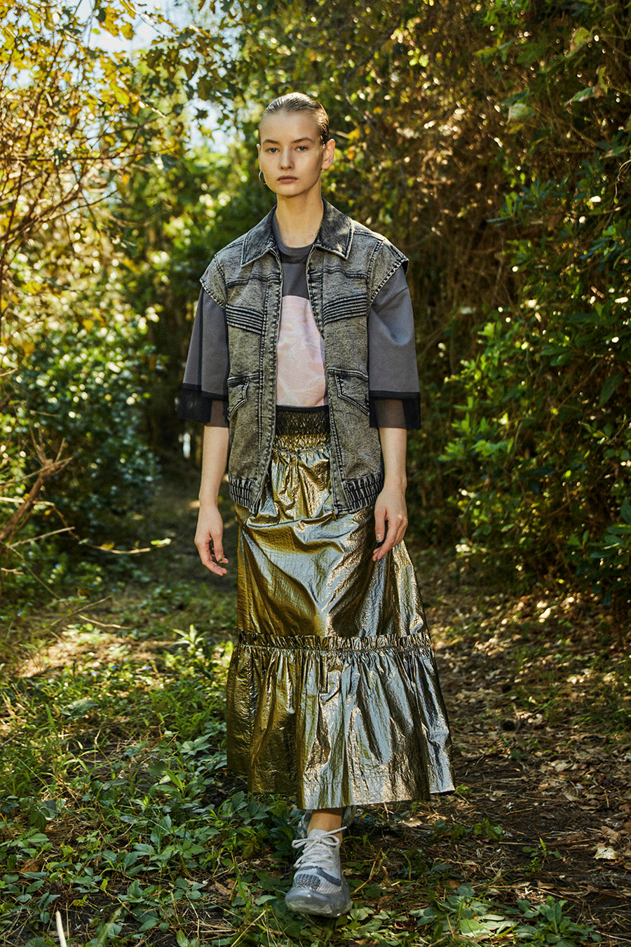 メタリックシャーリングティアードスカート