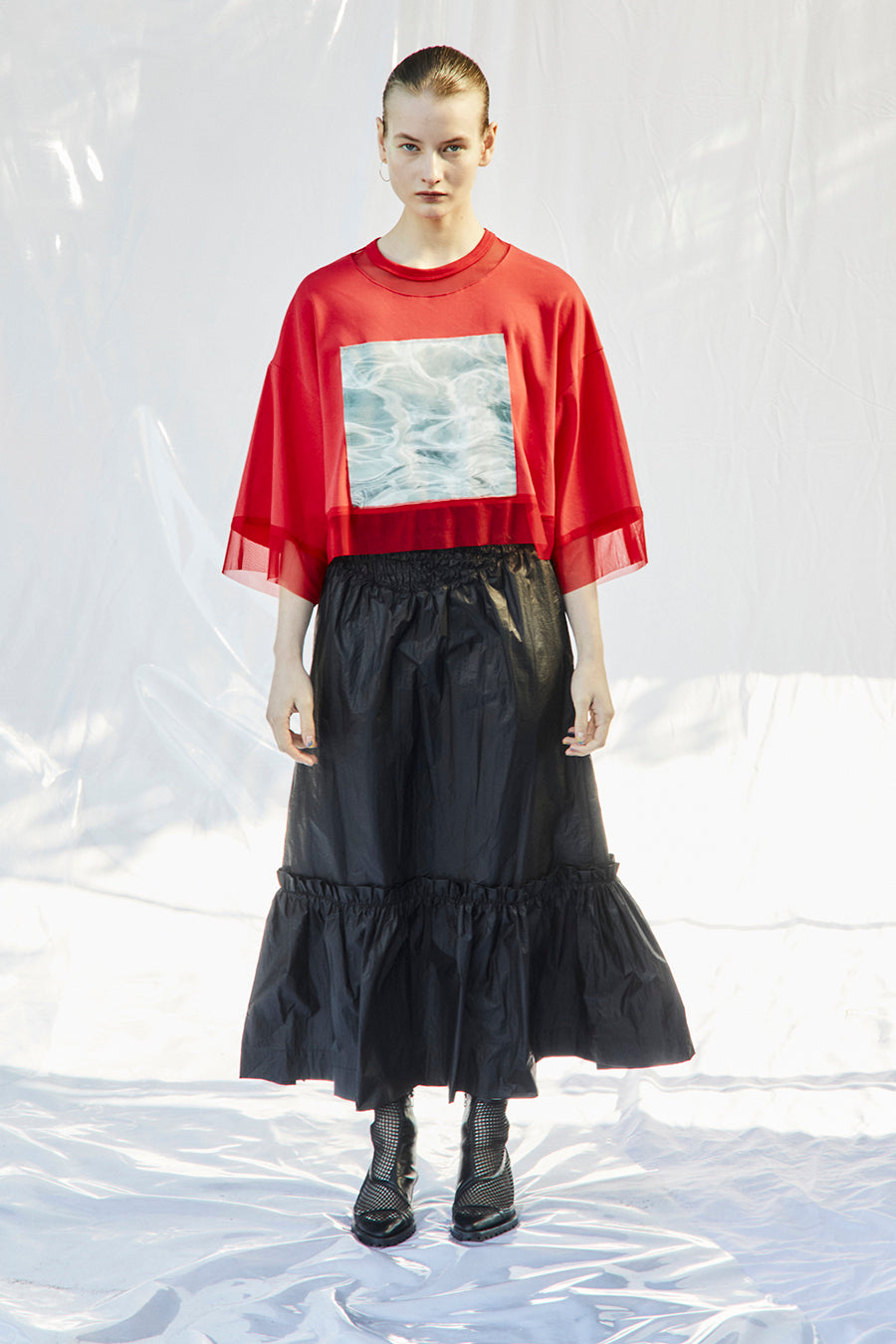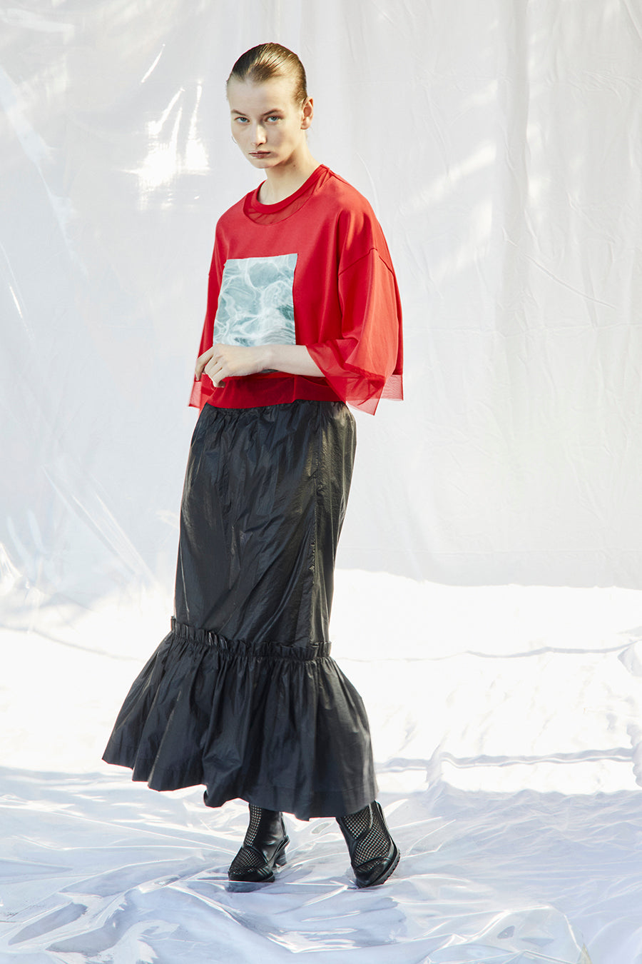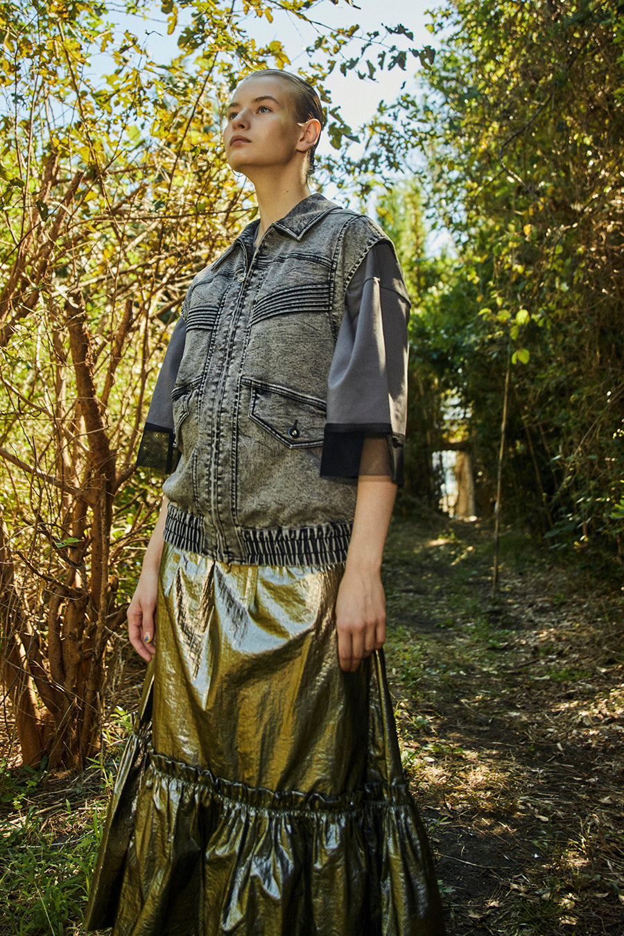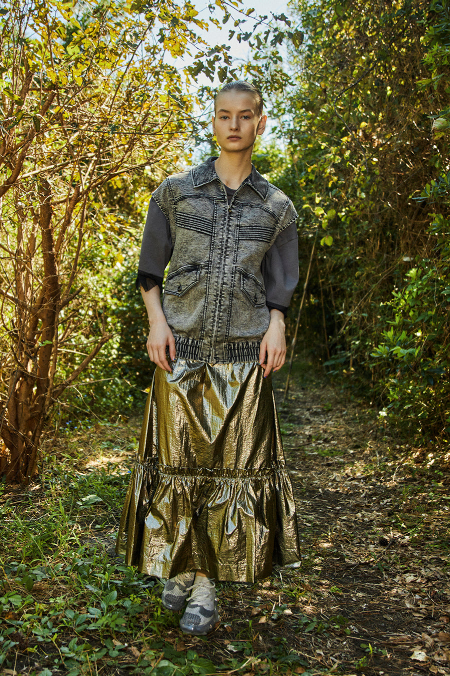 メタリックシャーリングティアードスカート