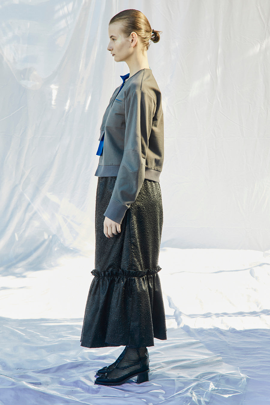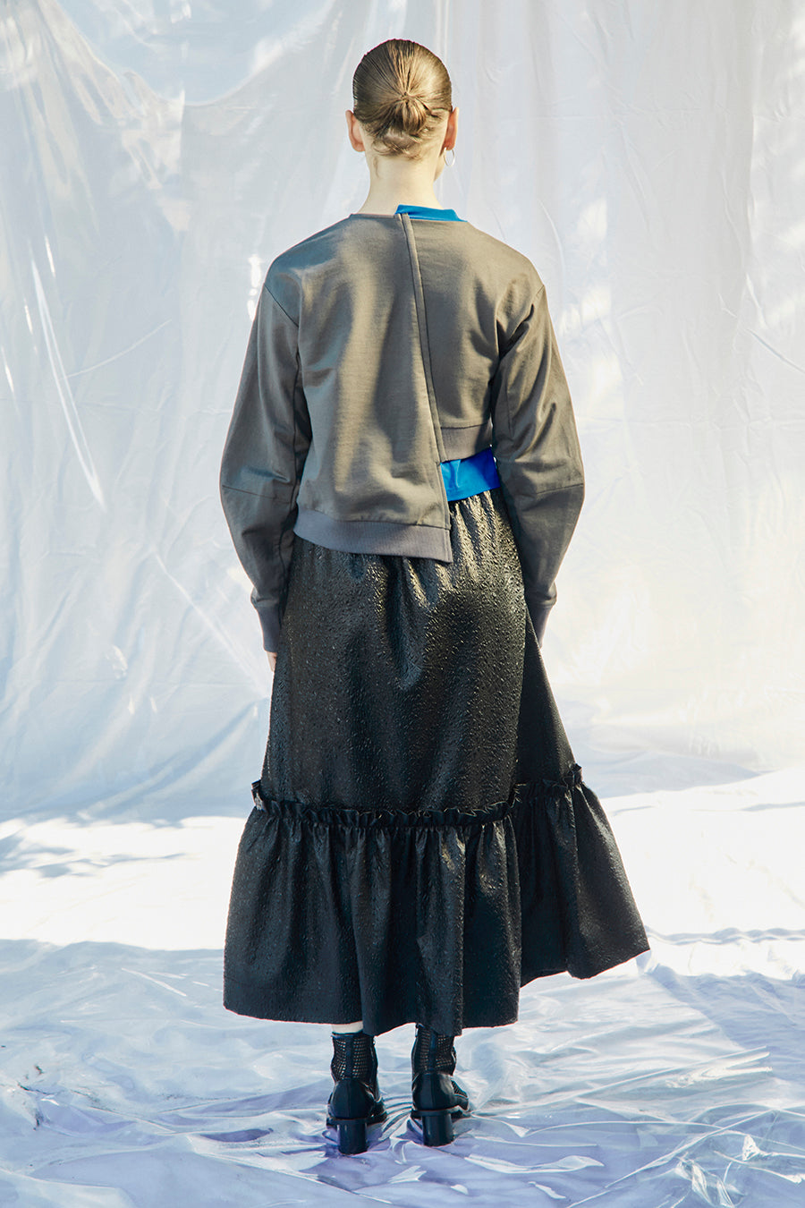 腰回りは張らずに下の切り替え箇所でボリュームを出しているので、きれいなフレアシルエットに広がります。