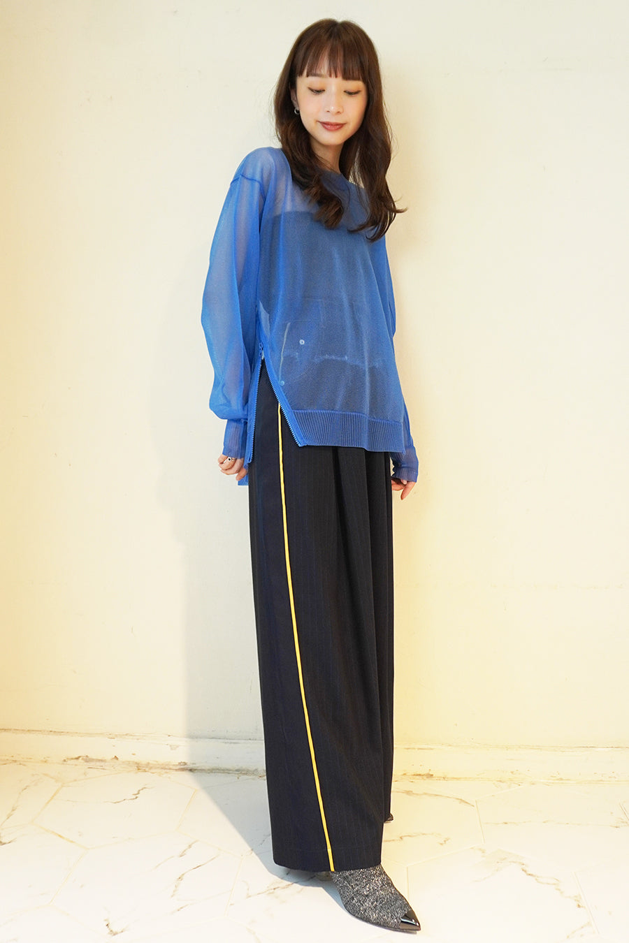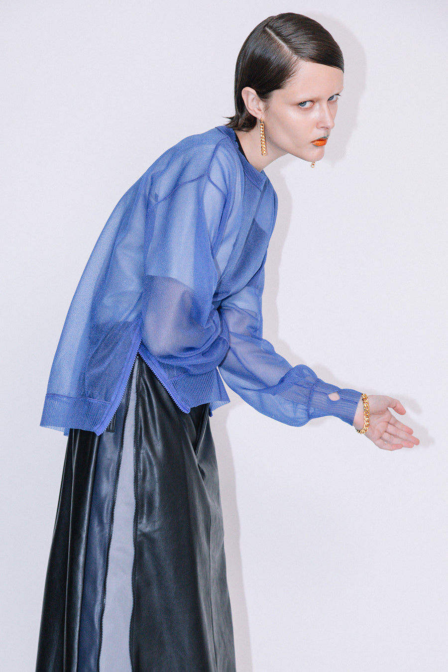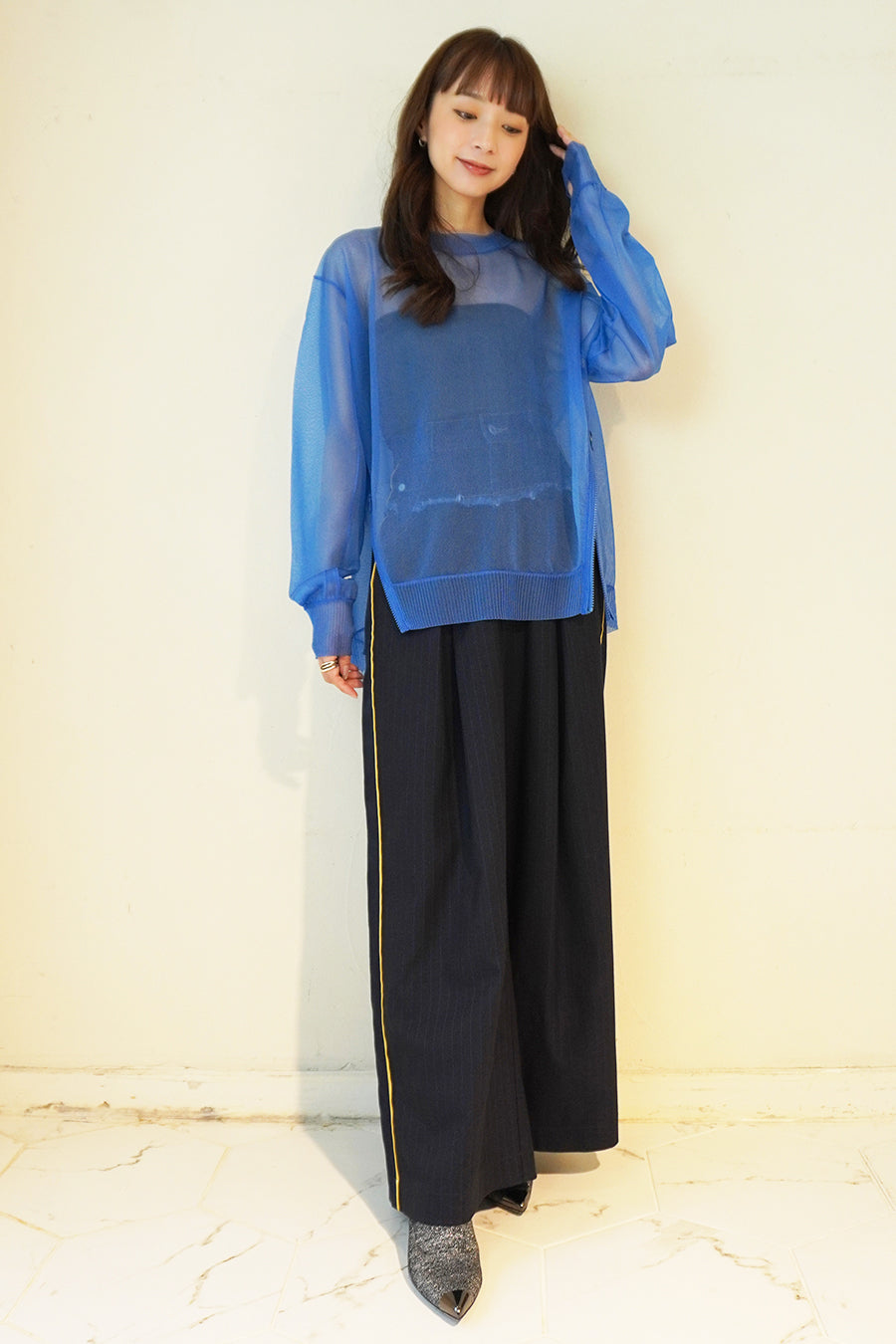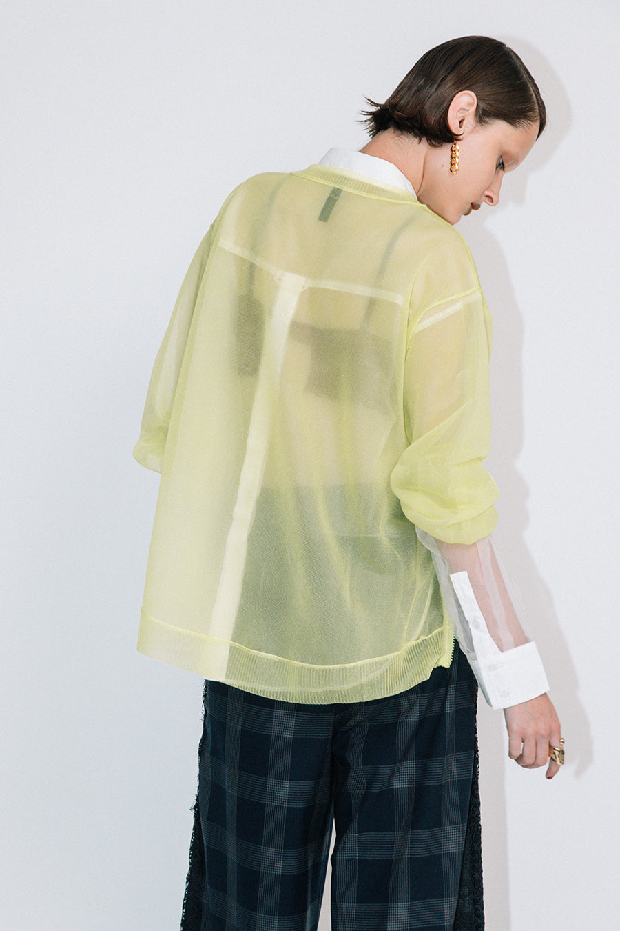 長袖インナーを重ねた際には、シアーニットの袖口を肘まで上げ、インナー袖を見せてのレイヤード着用もお勧め。甘く編んだシアー感が特徴で、糸は光沢があり、ドライな肌触りが涼し気な印象に。
