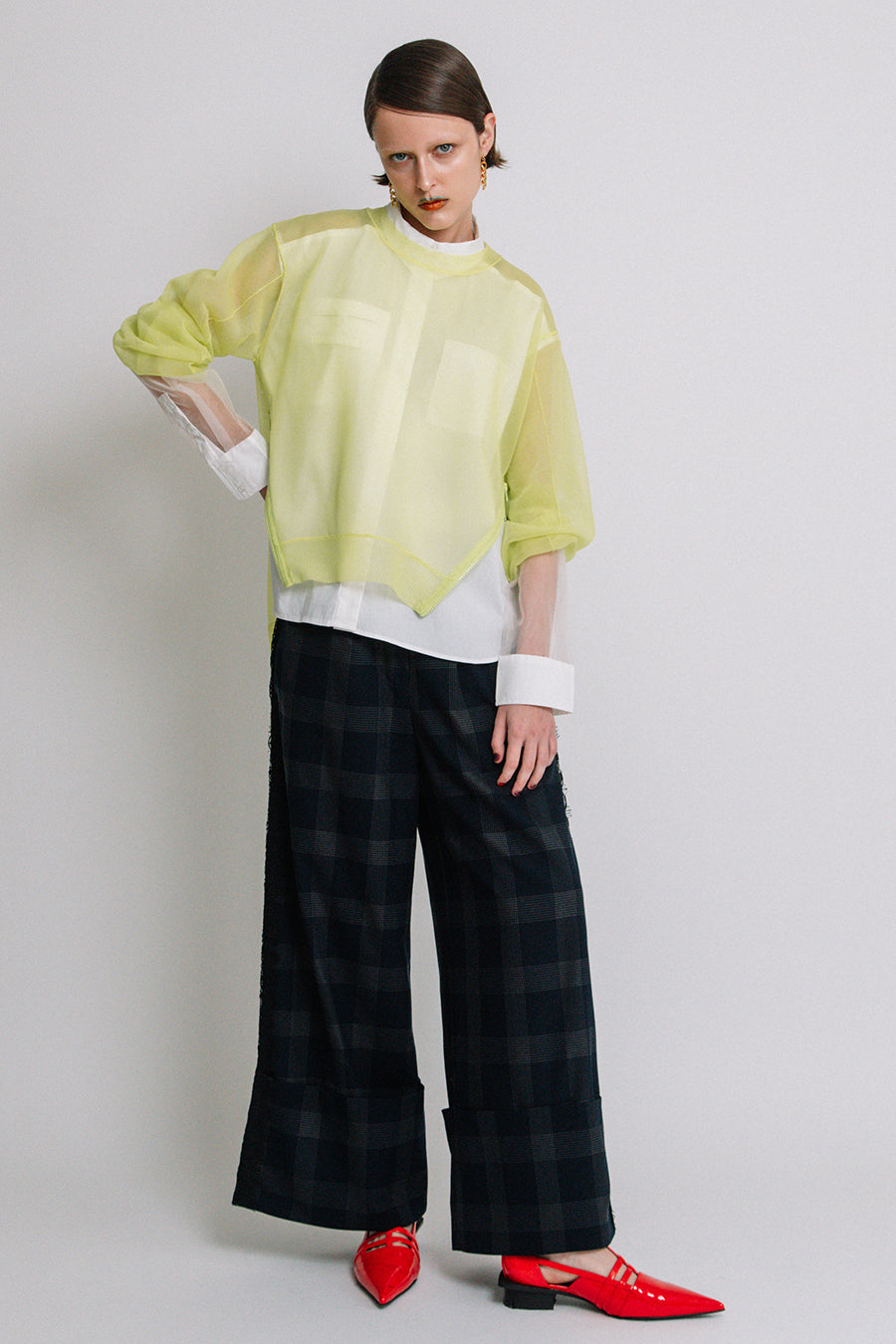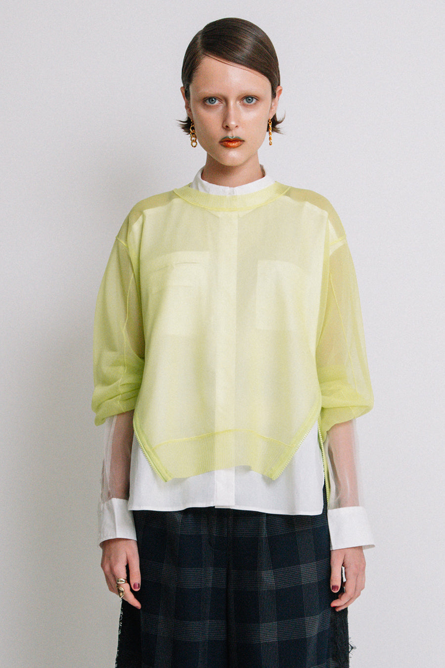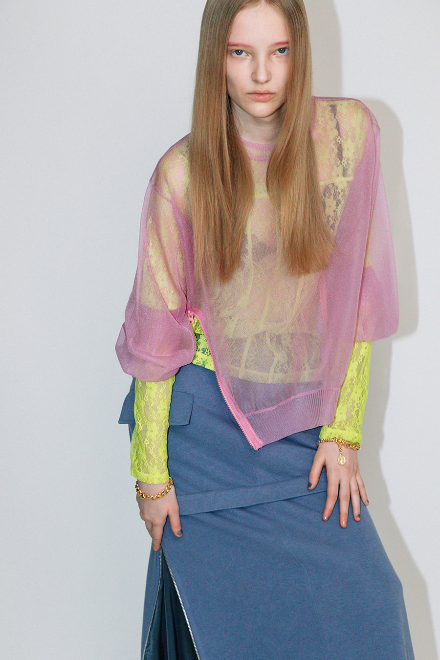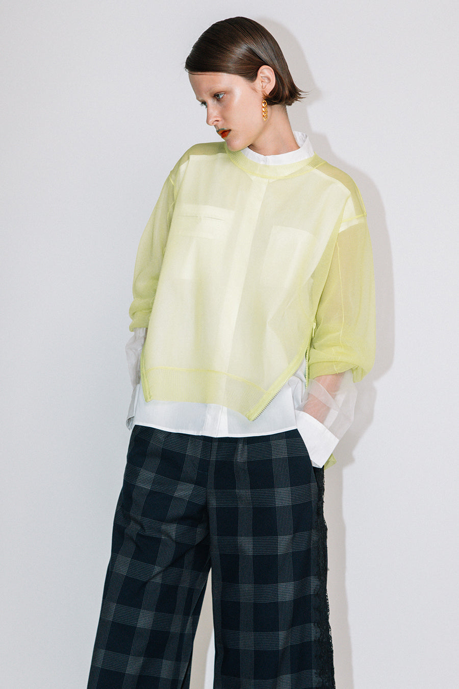 長袖インナーを重ねた際には、シアーニットの袖口を肘まで上げ、インナー袖を見せてのレイヤード着用もお勧め。甘く編んだシアー感が特徴で、糸は光沢があり、ドライな肌触りが涼し気な印象に。