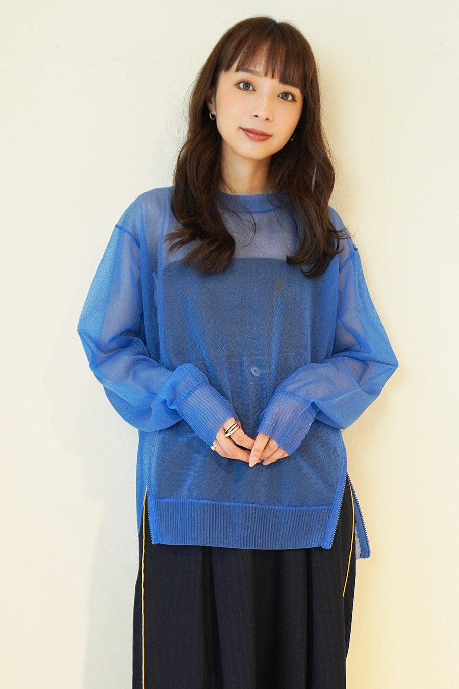 晩夏から秋にかけてもまだまだおすすめのシアープルオーバーニット。