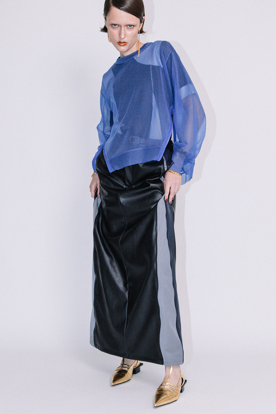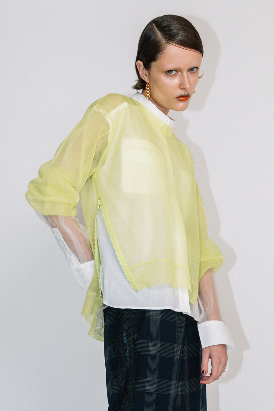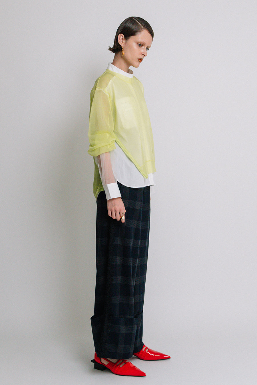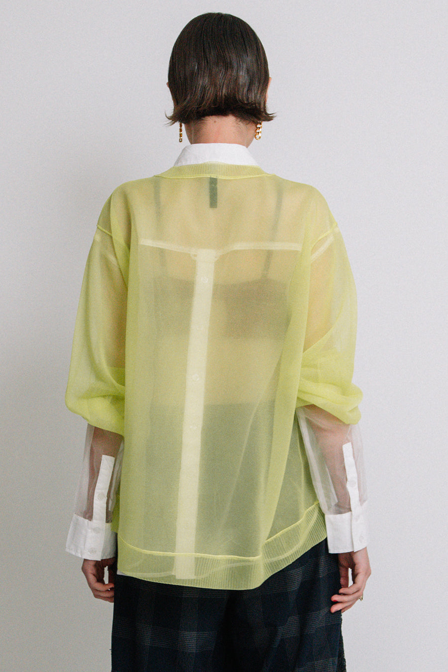 レイヤードしやすいよう、袖も膨らみがあり、全体にオーバーサイズで後ろ下がりの抜け感のあるシルエットに。