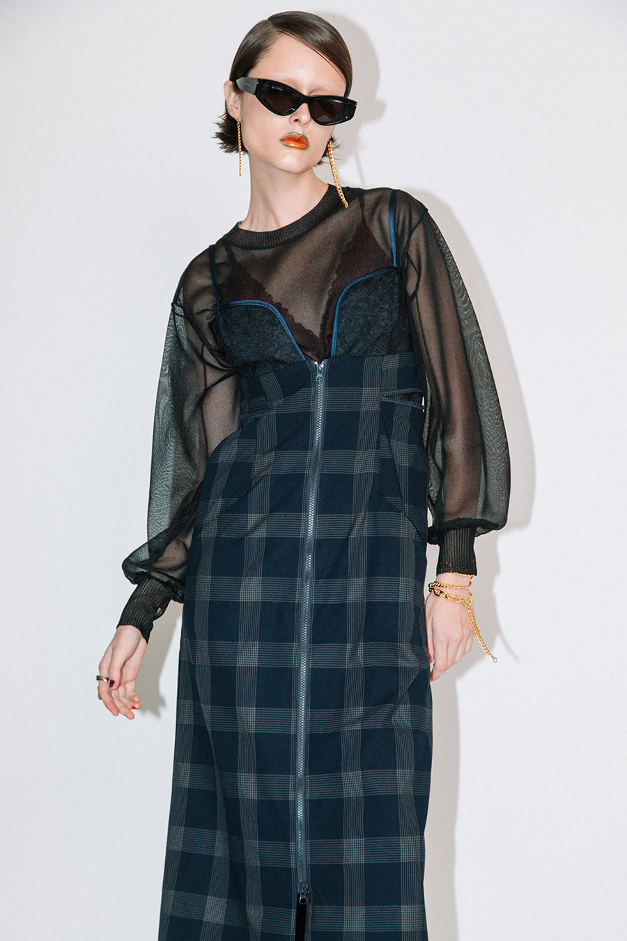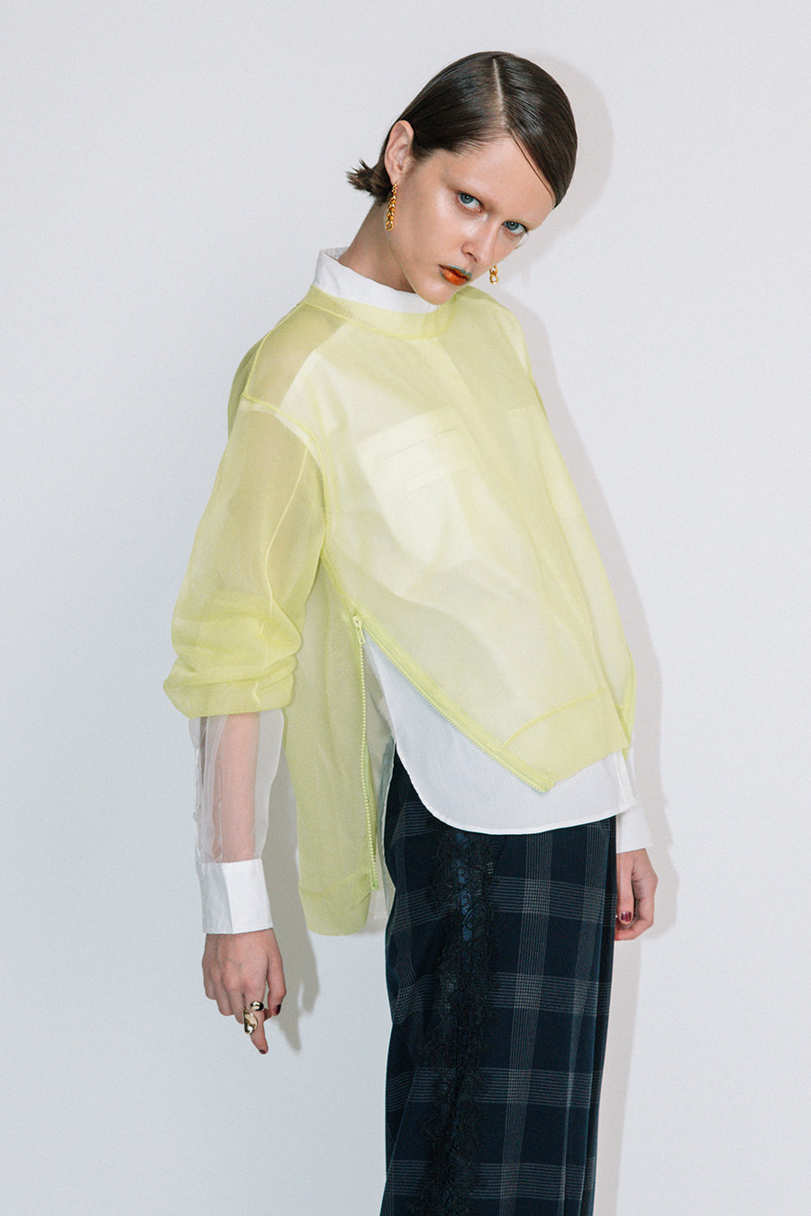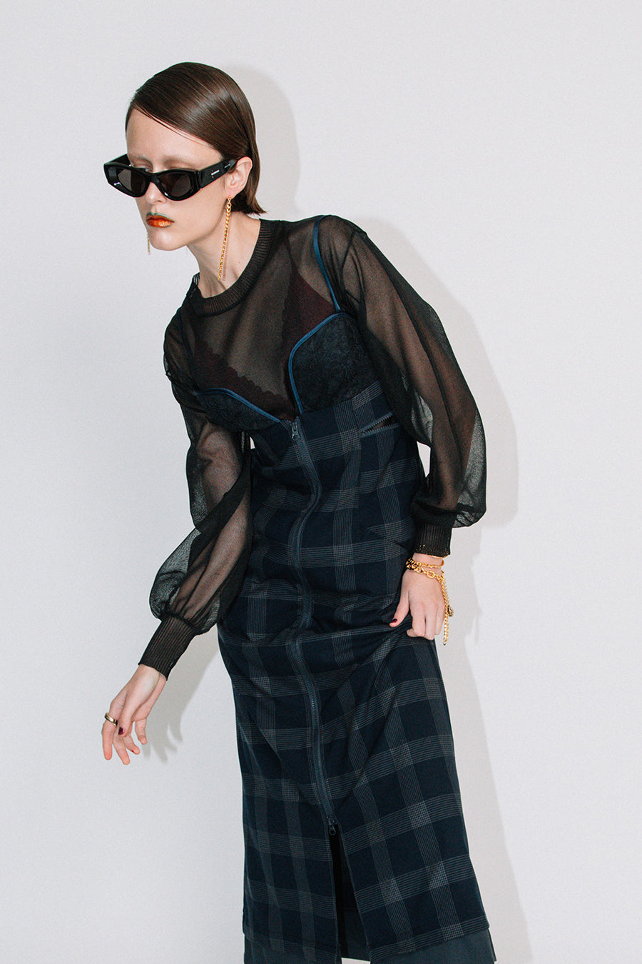 インナーに、スポーティーなアシンメトリーキャミやタンク、女性らしいレーシーなランジェリーインナー、マニッシュなシャツなど、色々なレイヤードを楽めるアイテム。