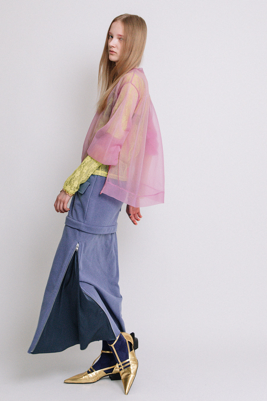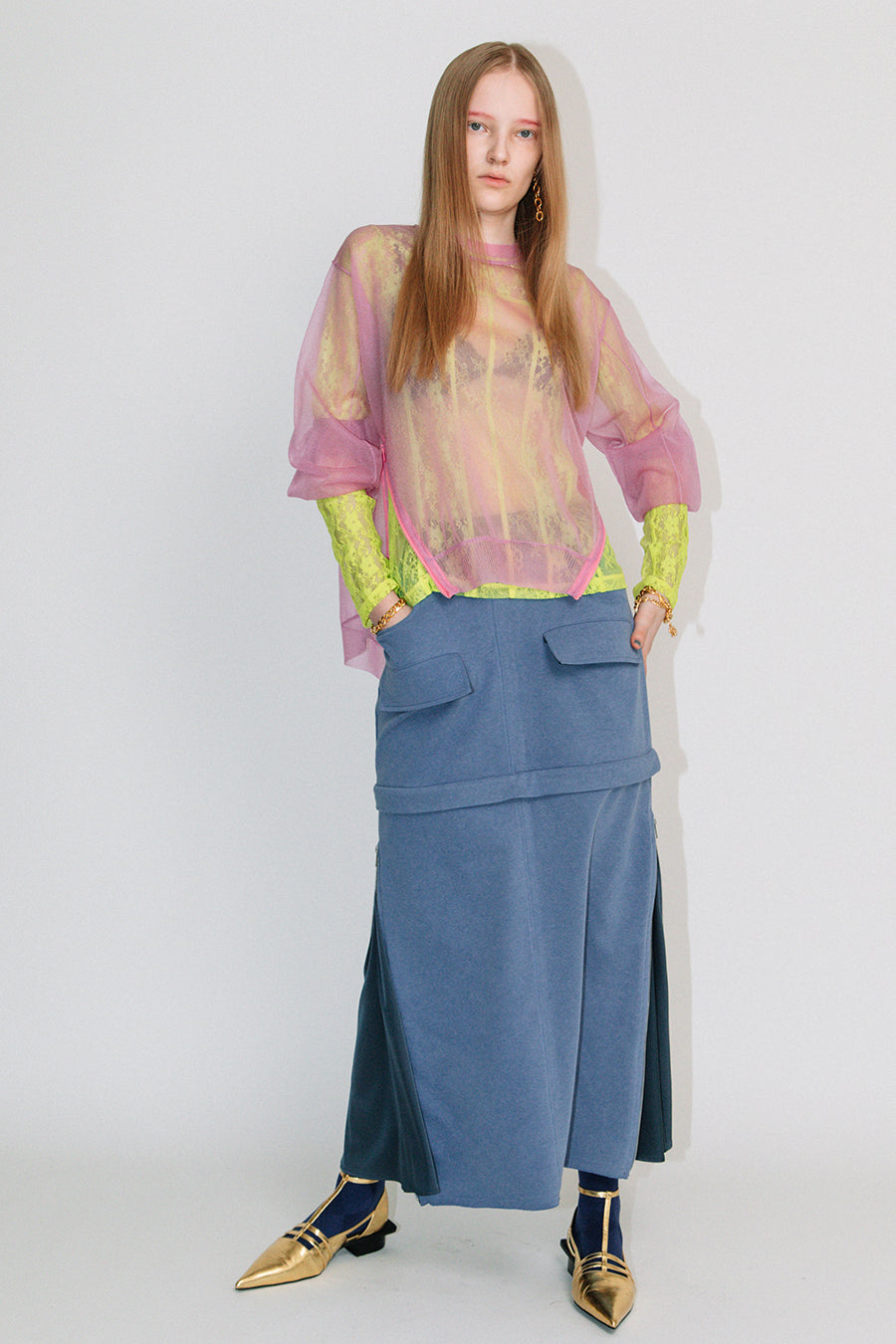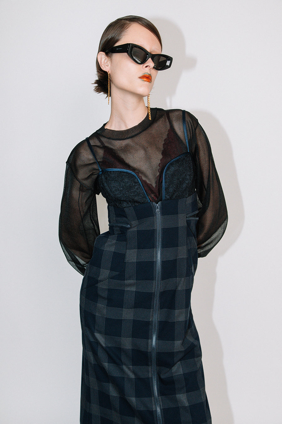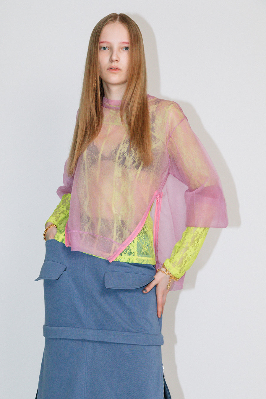 インナーに、スポーティーなアシンメトリーキャミやタンク、女性らしいレーシーなランジェリーインナー、マニッシュなシャツなど、色々なレイヤードを楽めるアイテム。