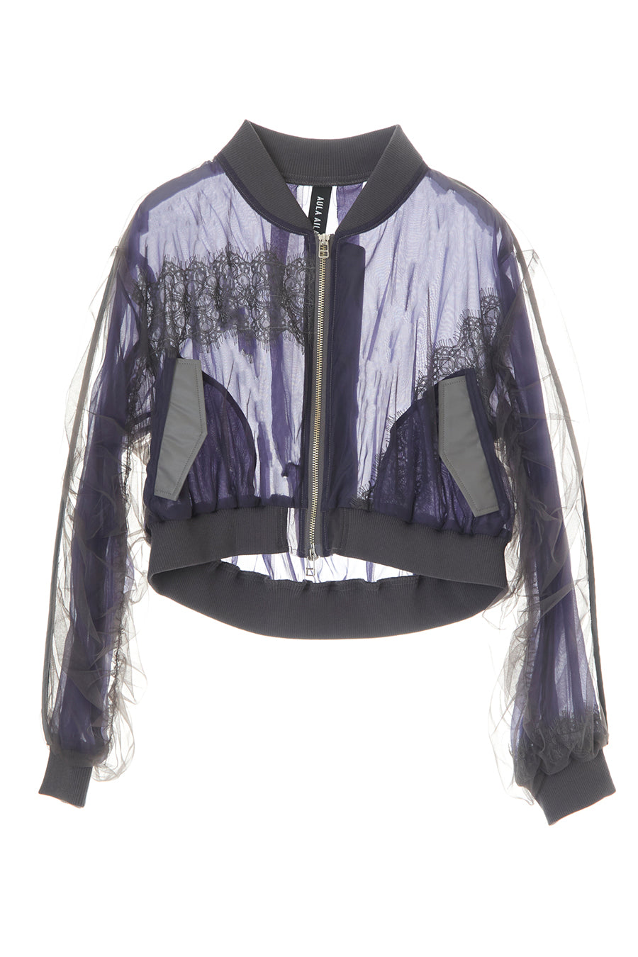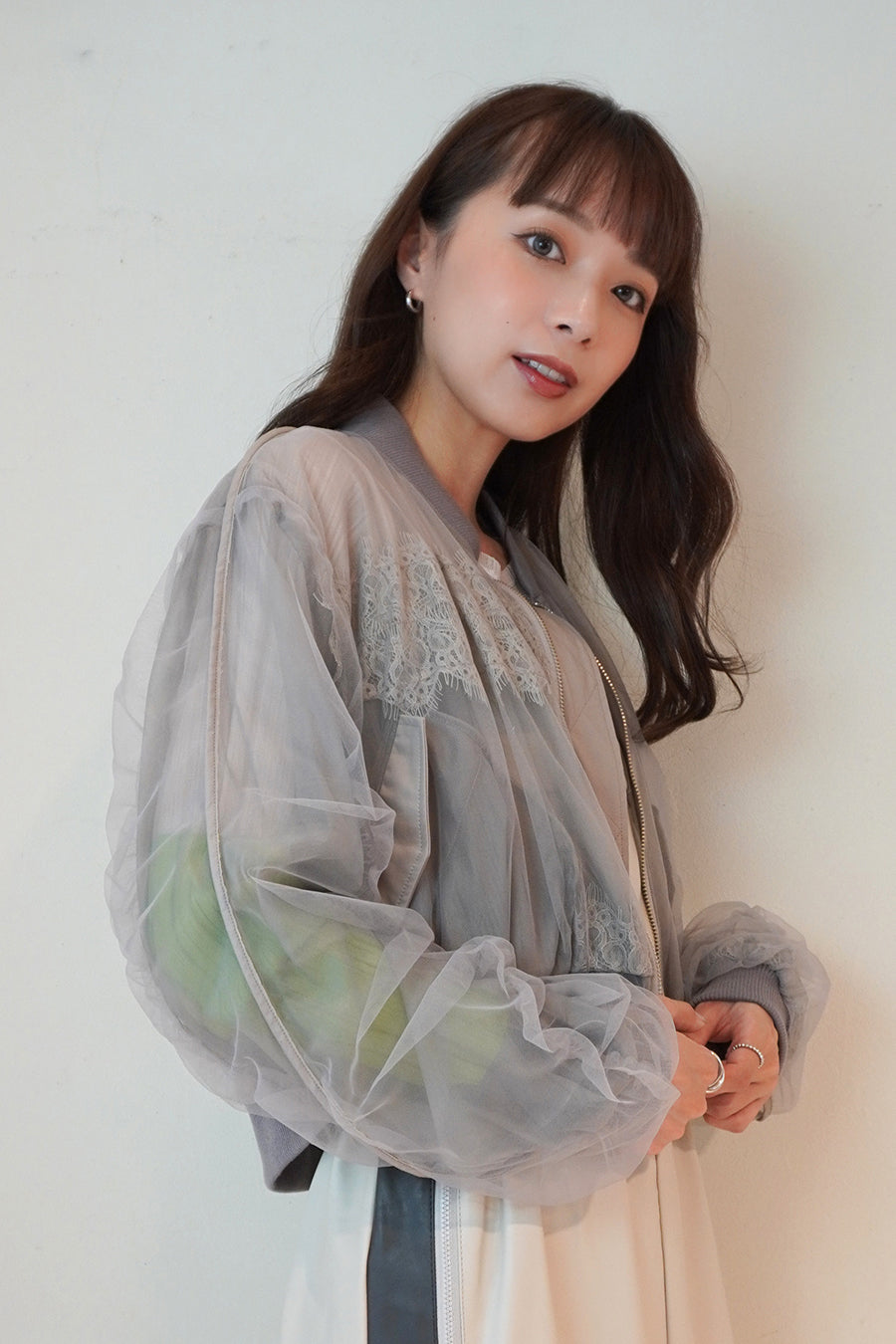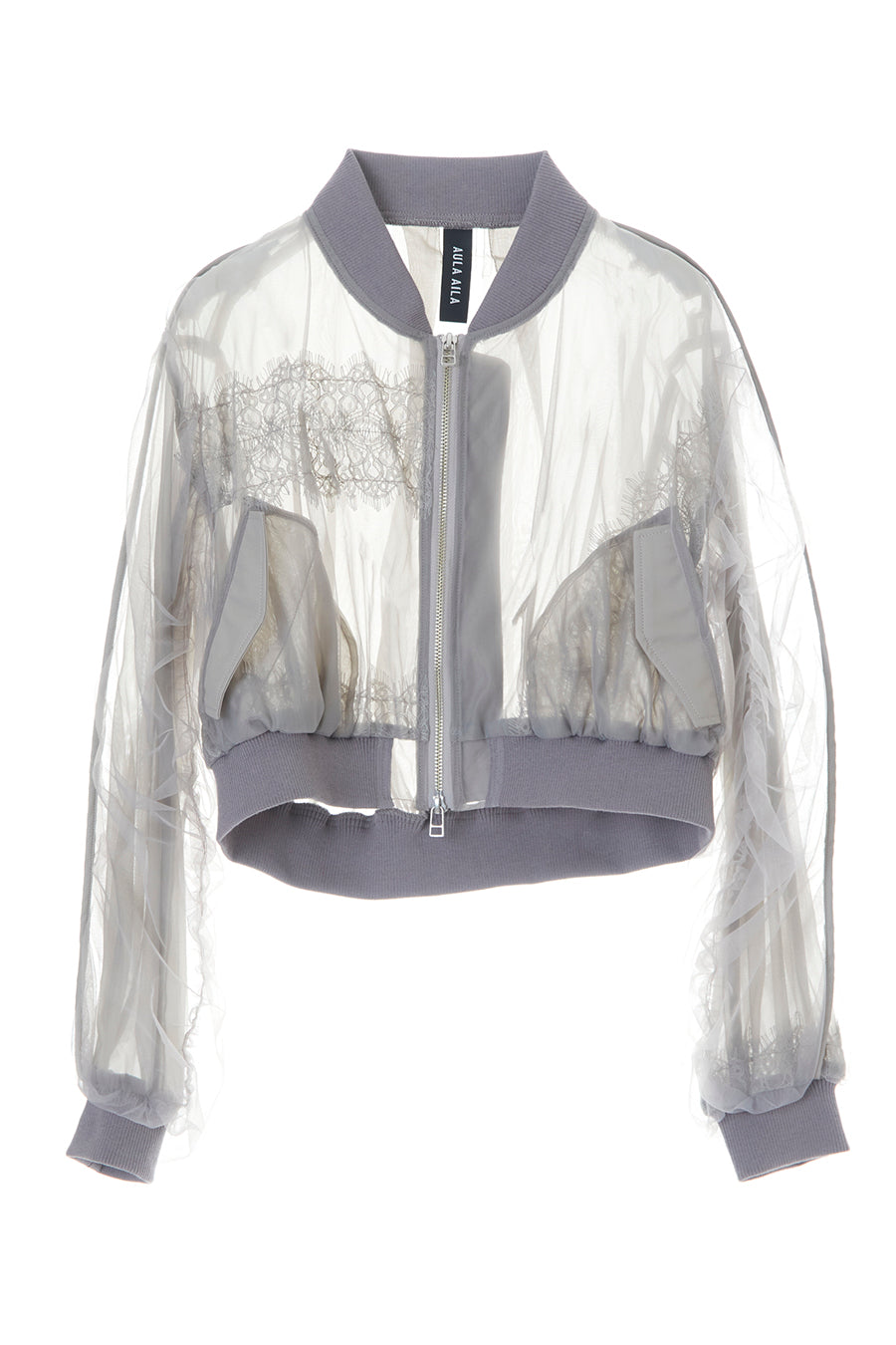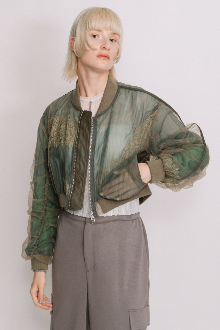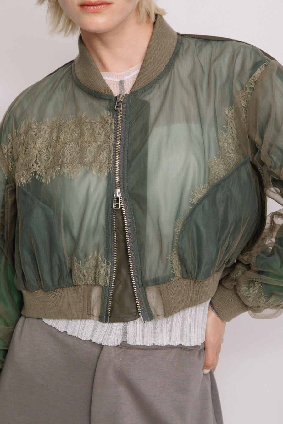 アシンメトリーに部分レースが付いた、シアーショートブルゾン。