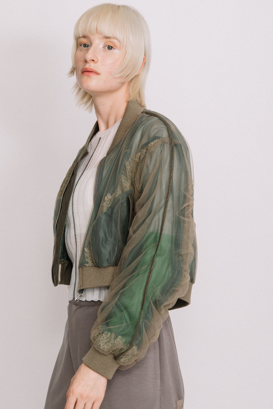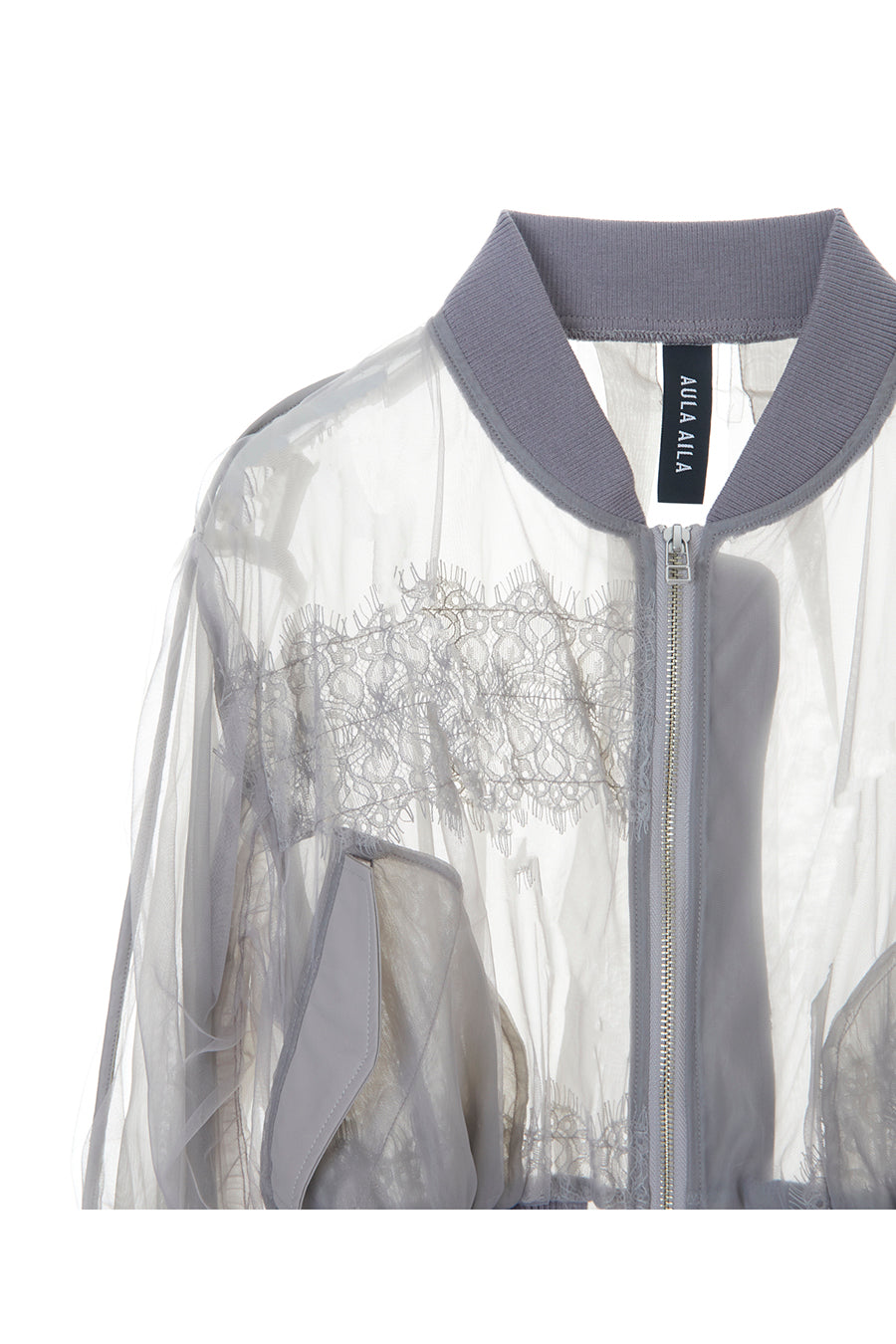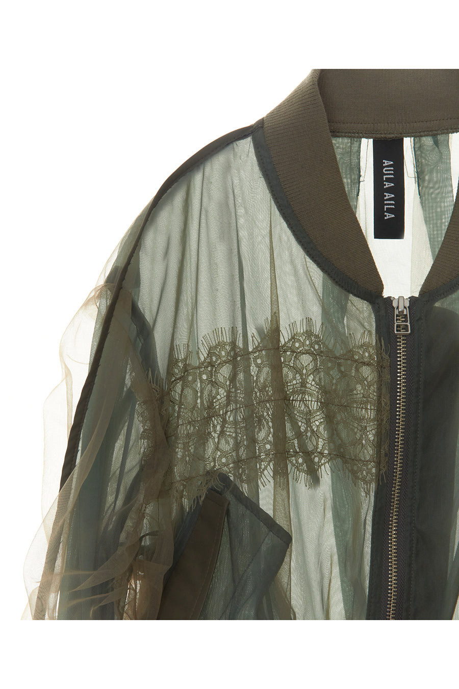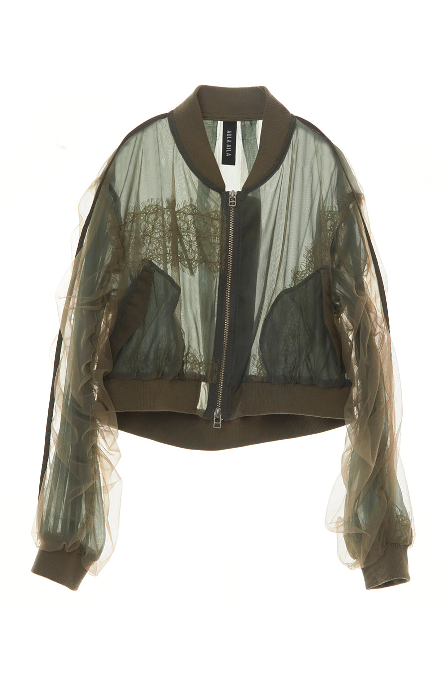 アシンメトリーに部分レースが付いた、シアーショートブルゾン。