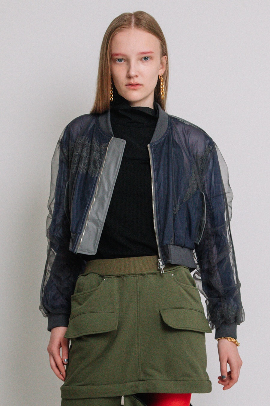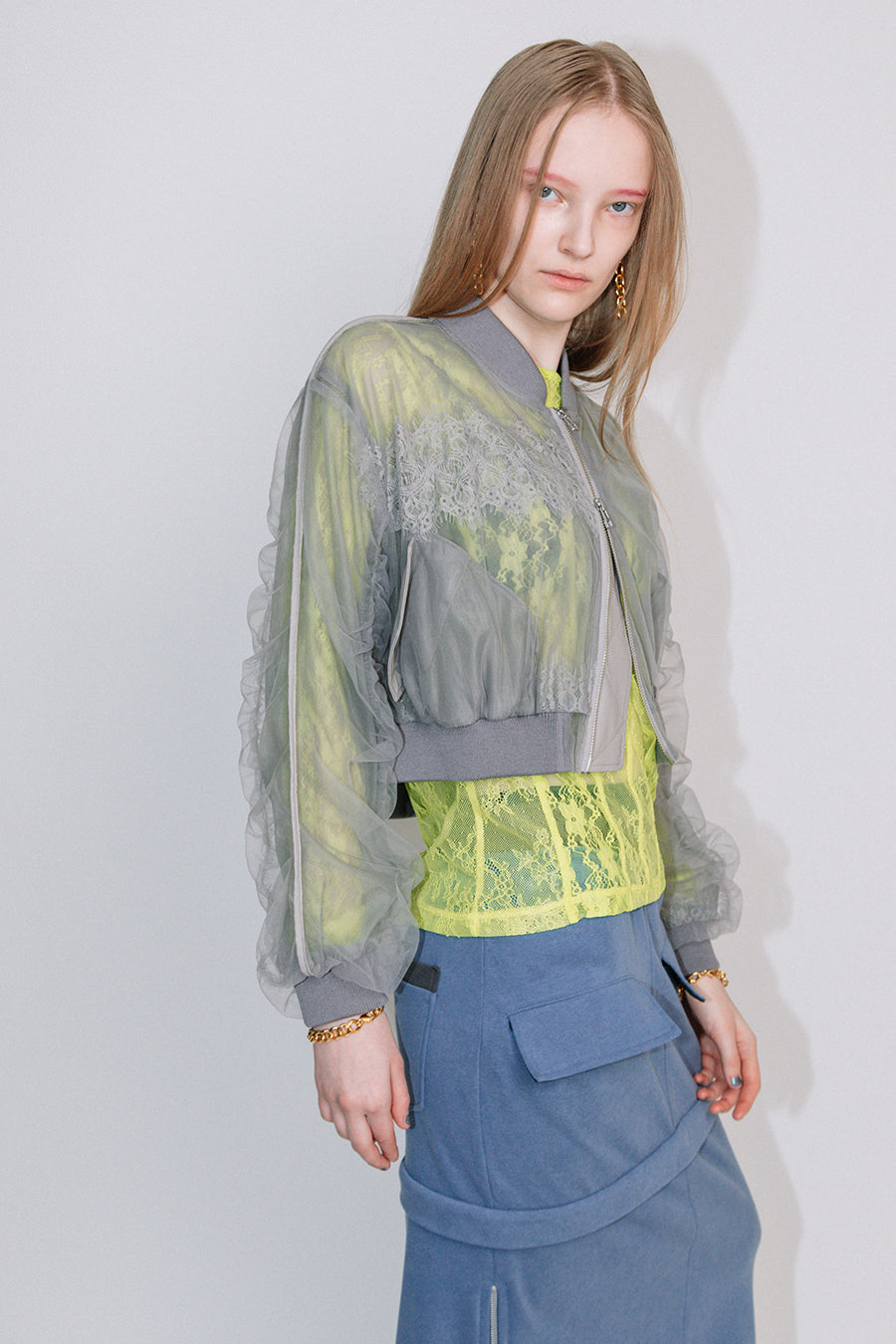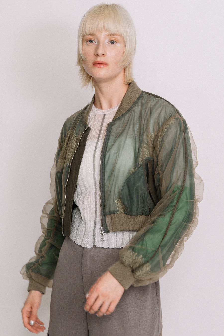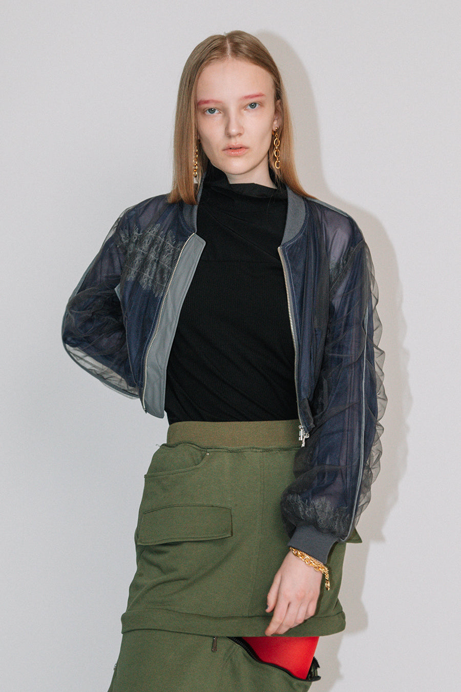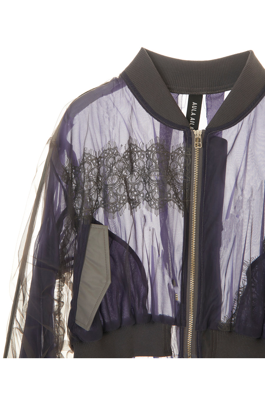 アシンメトリーに部分レースが付いた、シアーショートブルゾン。