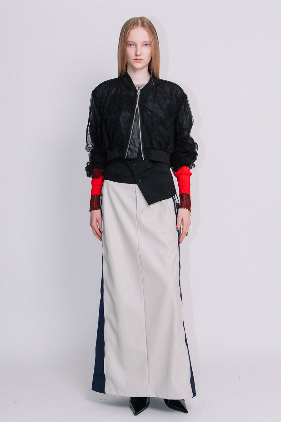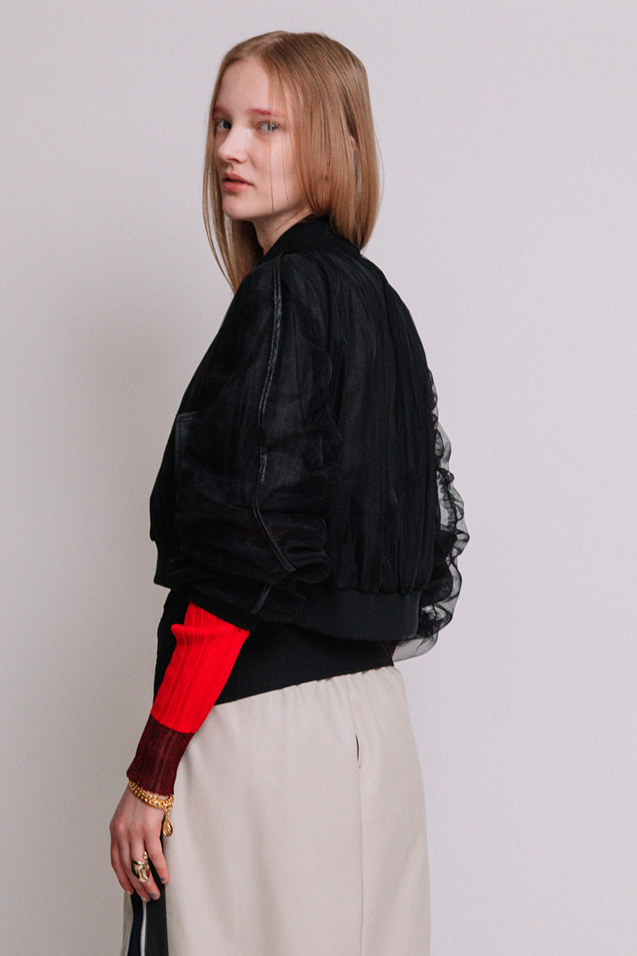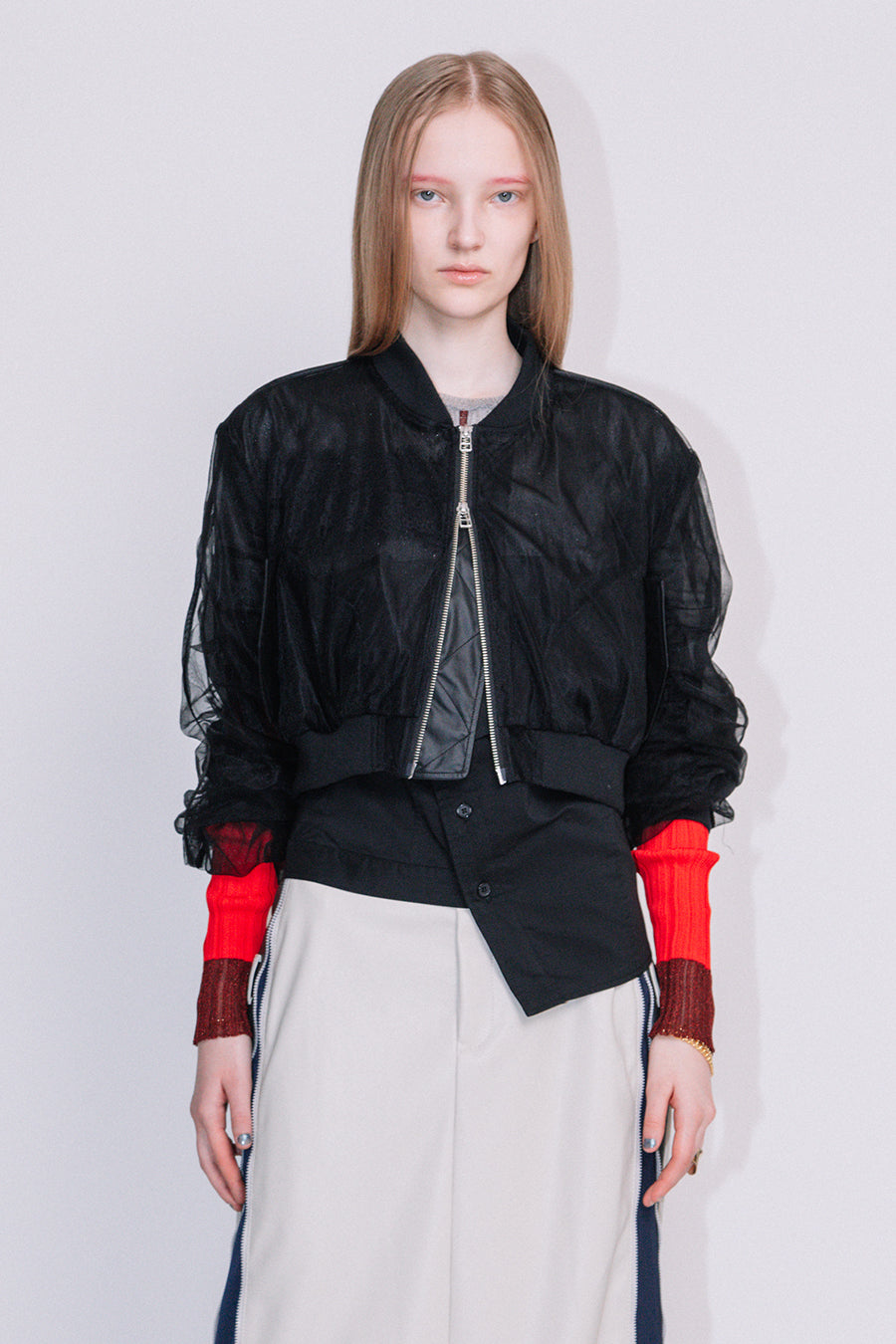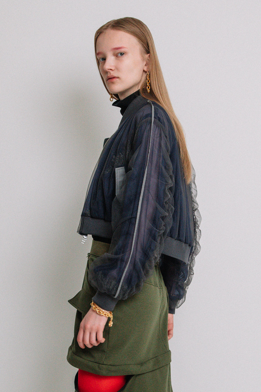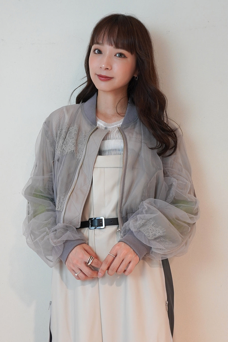アシンメトリーに部分レースが付いた、シアーショートブルゾン。