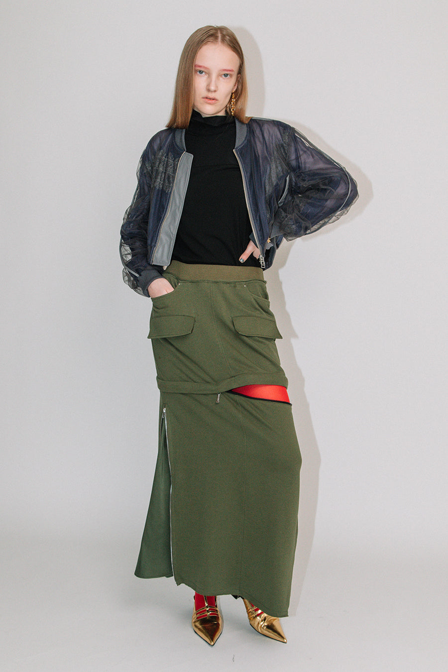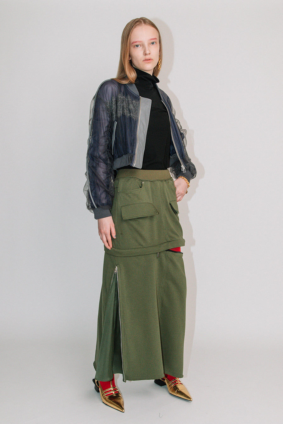 袖はギャザーをたっぷり入れ、後ろ着丈を下げて、抜け感をプラス。ダブルジップで裾を広げても着用可能。ポケット付き。
