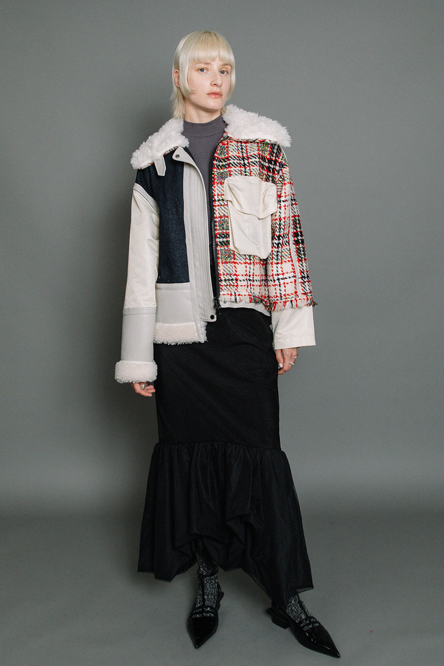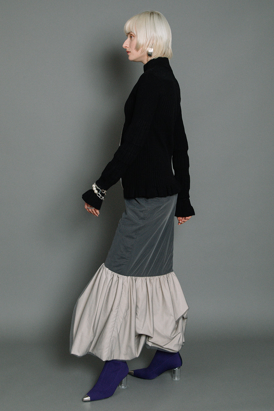 下はタフタ素材で切り替え、ランダムタックの入ったバルーンデザインが立体的なディティールを構築。