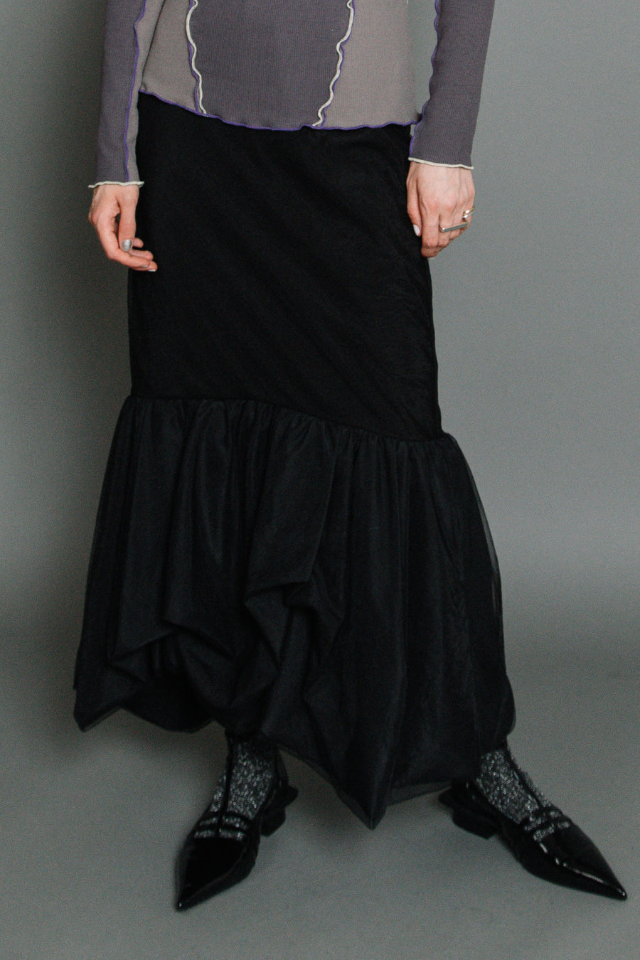 程よいマーメイドシルエットのスカートにチュールを重ねた奥行きのある華やかなアイテム。