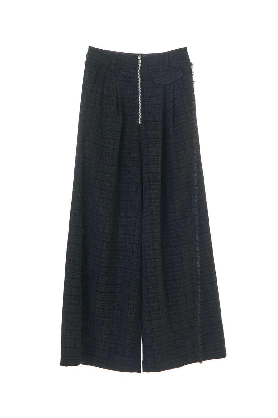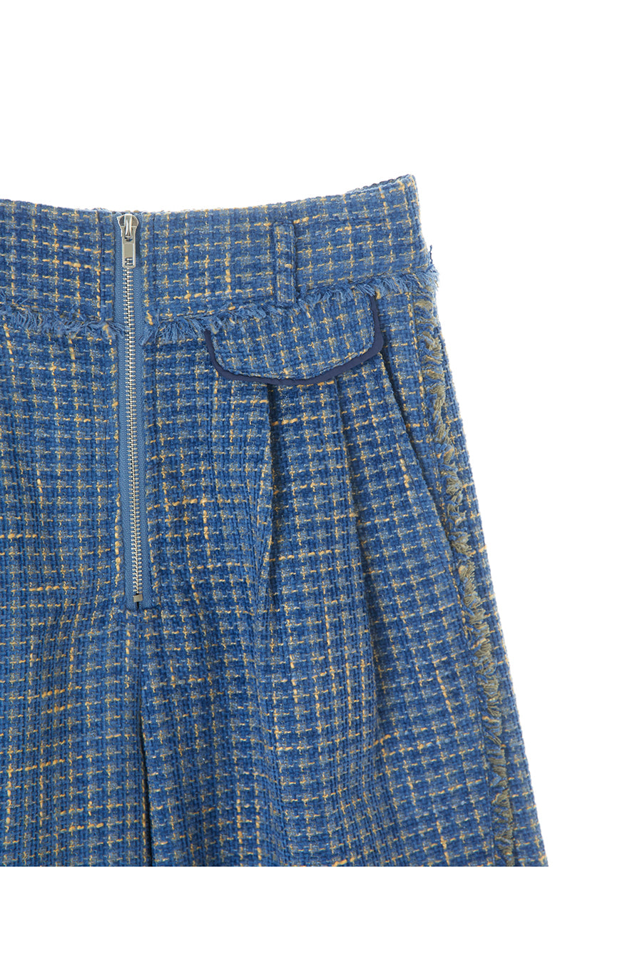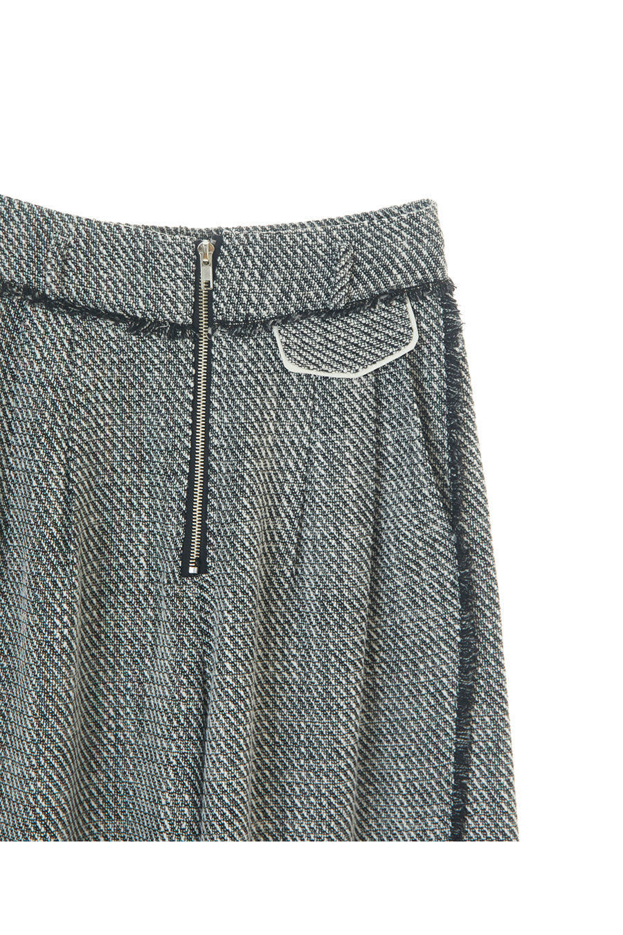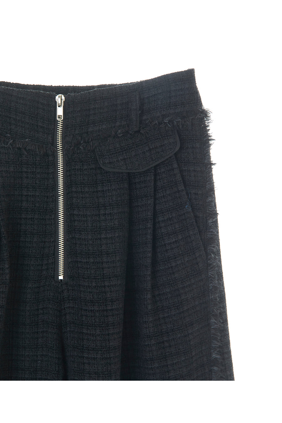 ウエストベルトや脇にツイードフリンジを施し、前中心のメタルジップや、前ウエストのフラップポケットパイピングでエッジプラス。