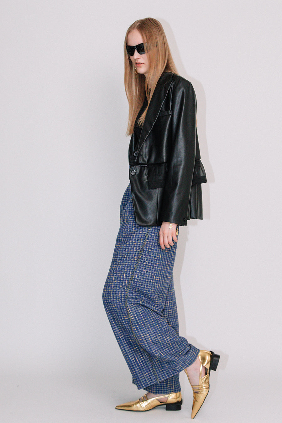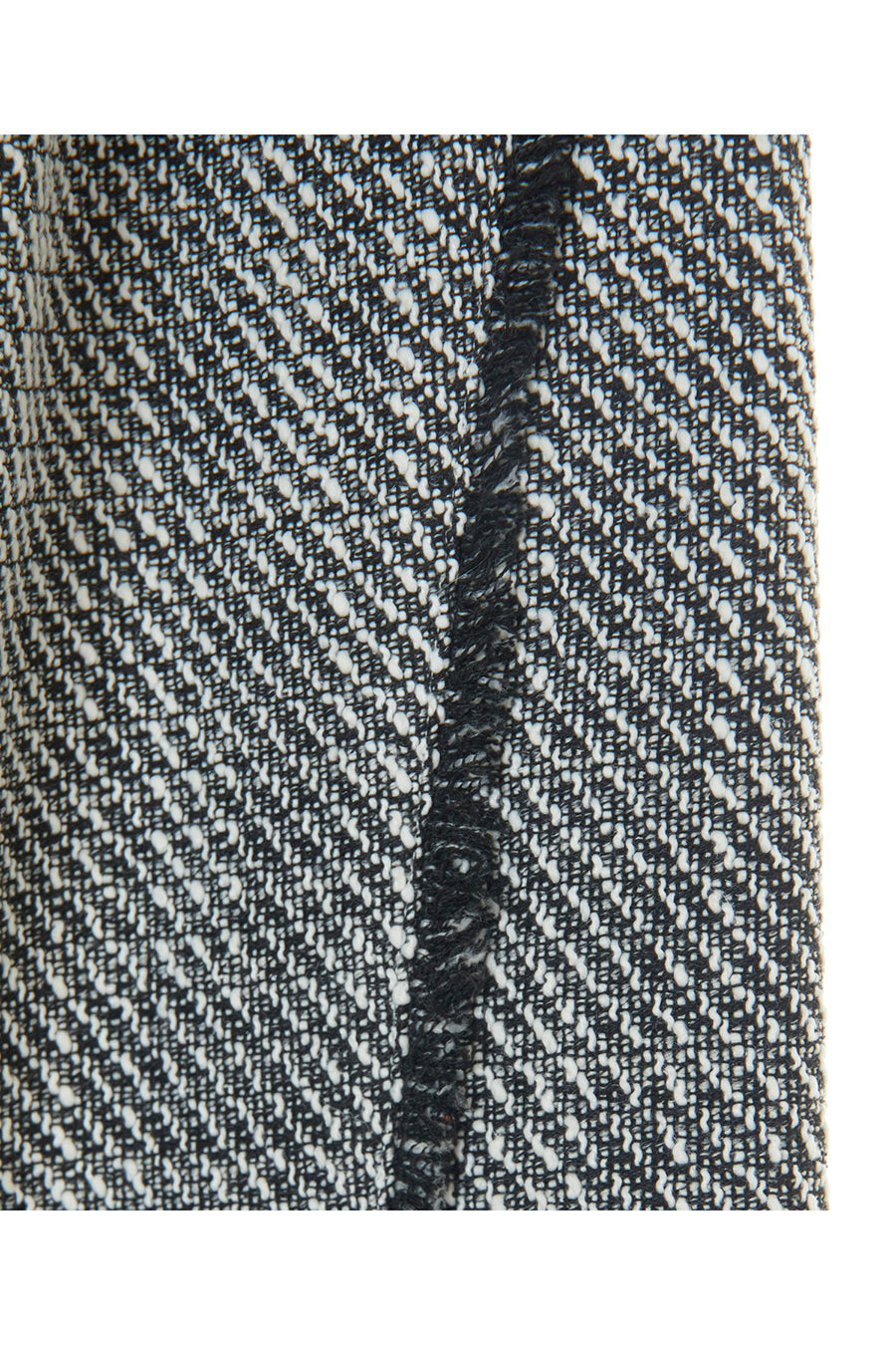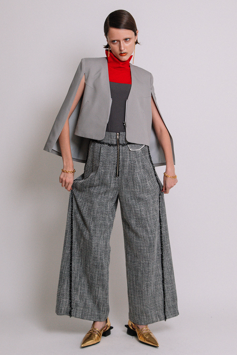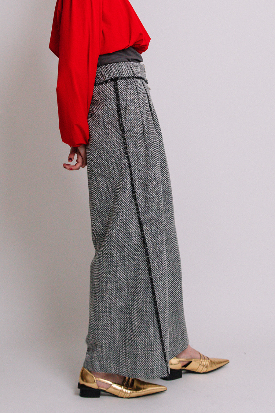 ウエストベルトや脇にツイードフリンジを施し、前中心のメタルジップや、前ウエストのフラップポケットパイピングでエッジプラス。