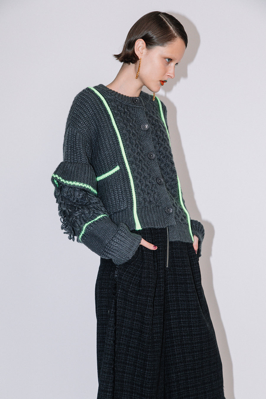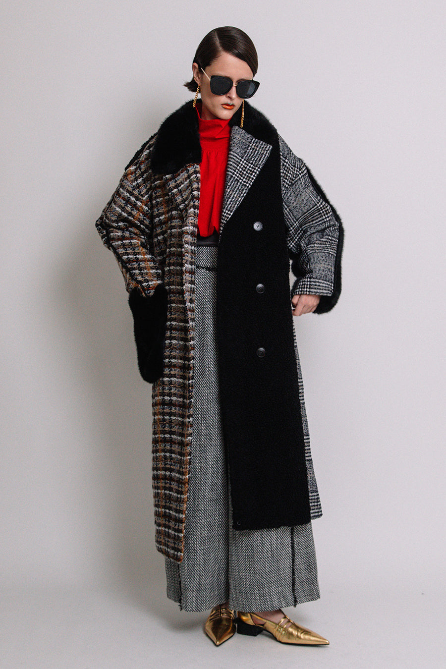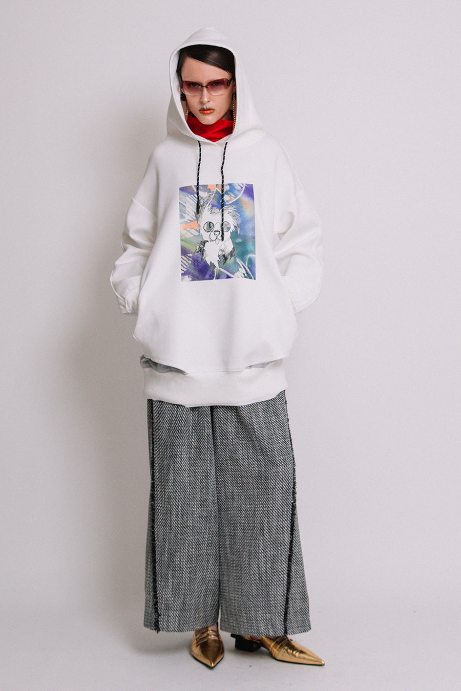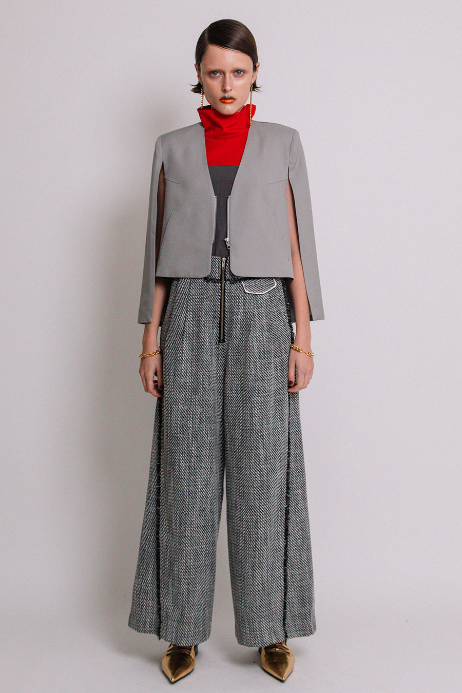 ウエストベルトや脇にツイードフリンジを施し、前中心のメタルジップや、前ウエストのフラップポケットパイピングでエッジプラス。