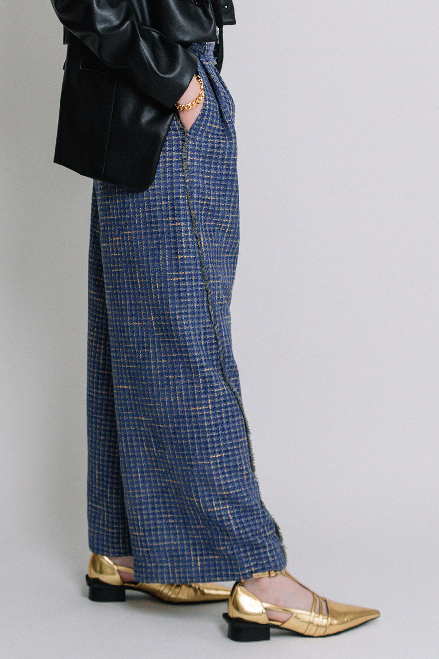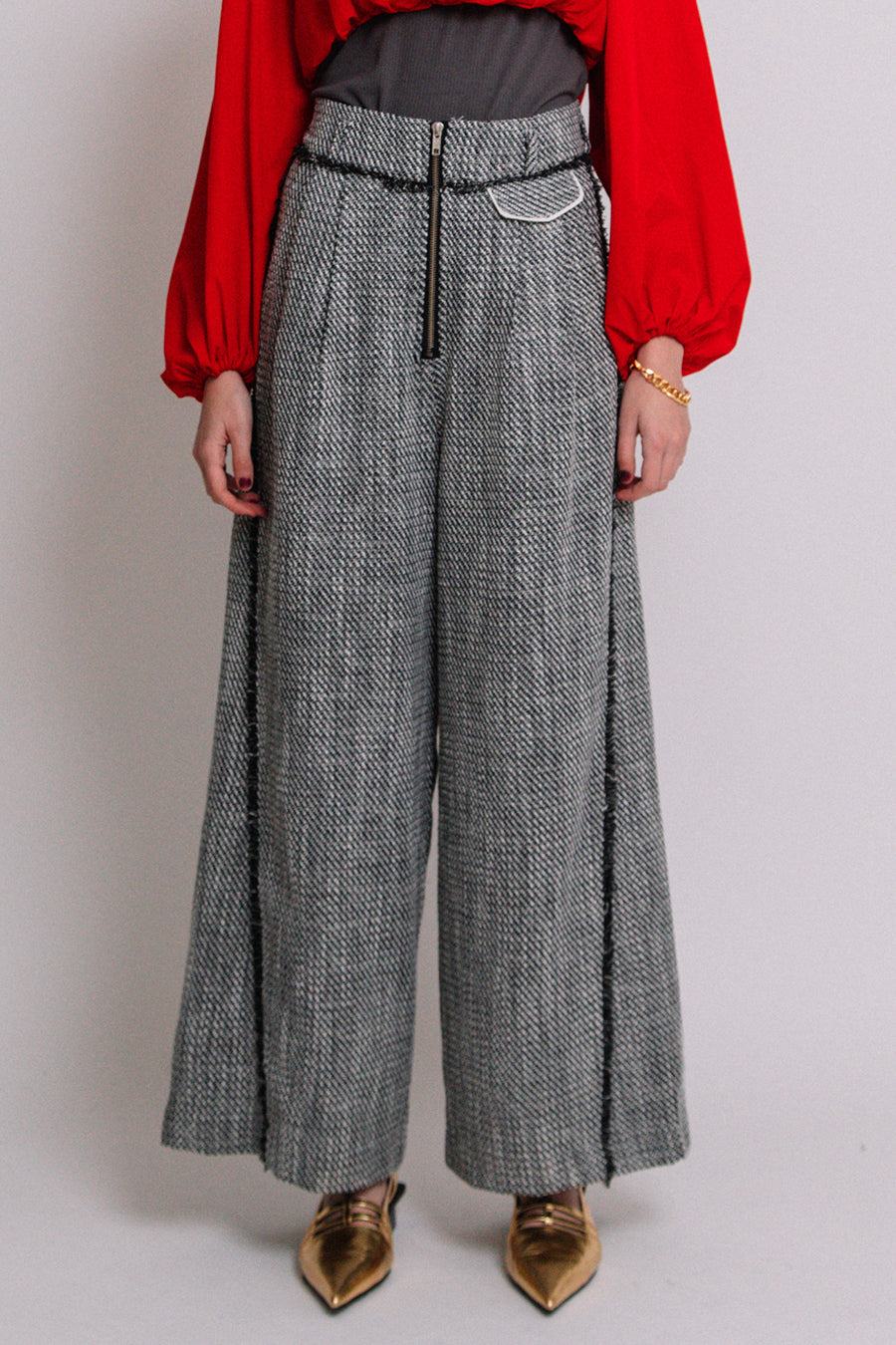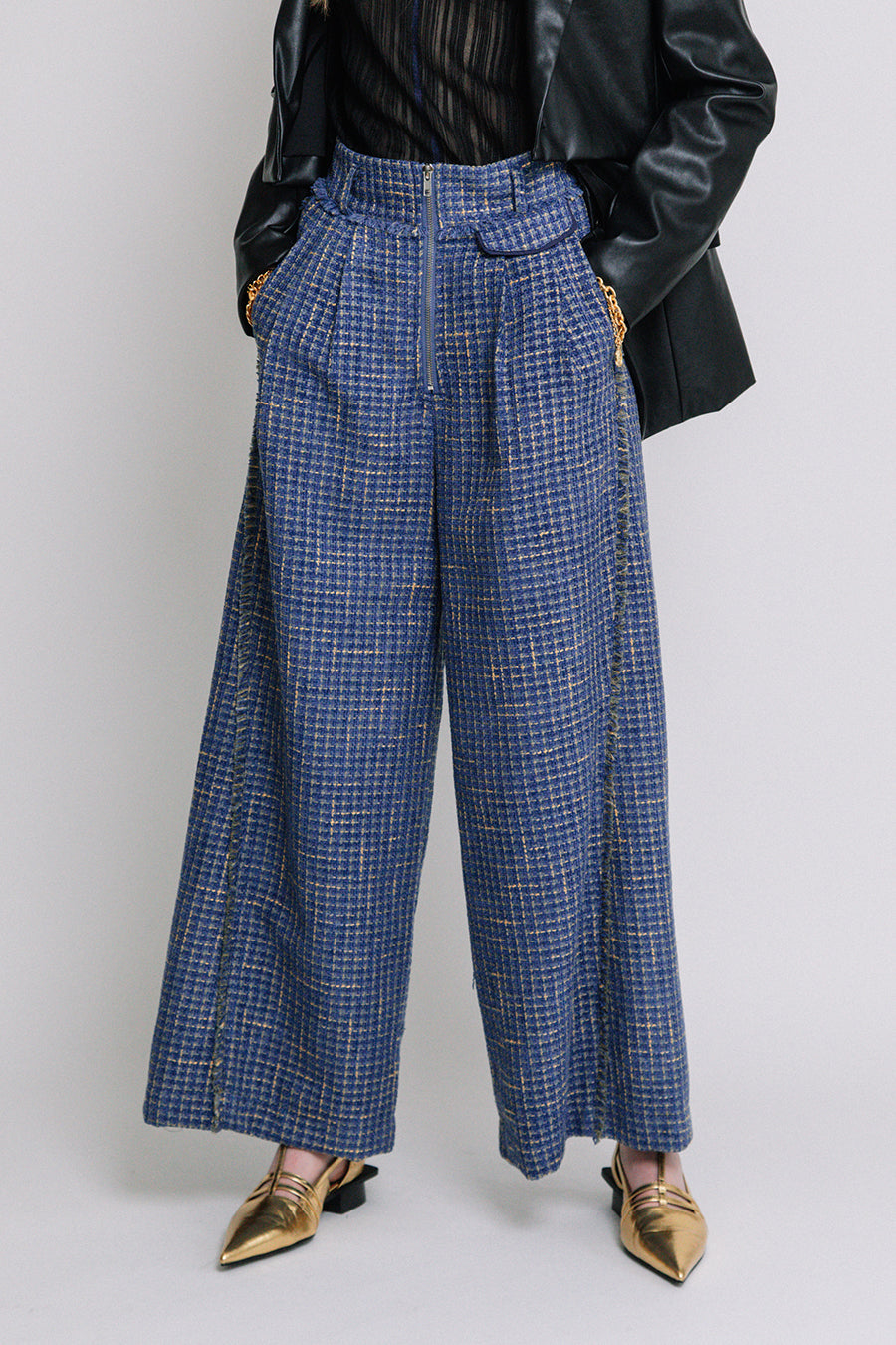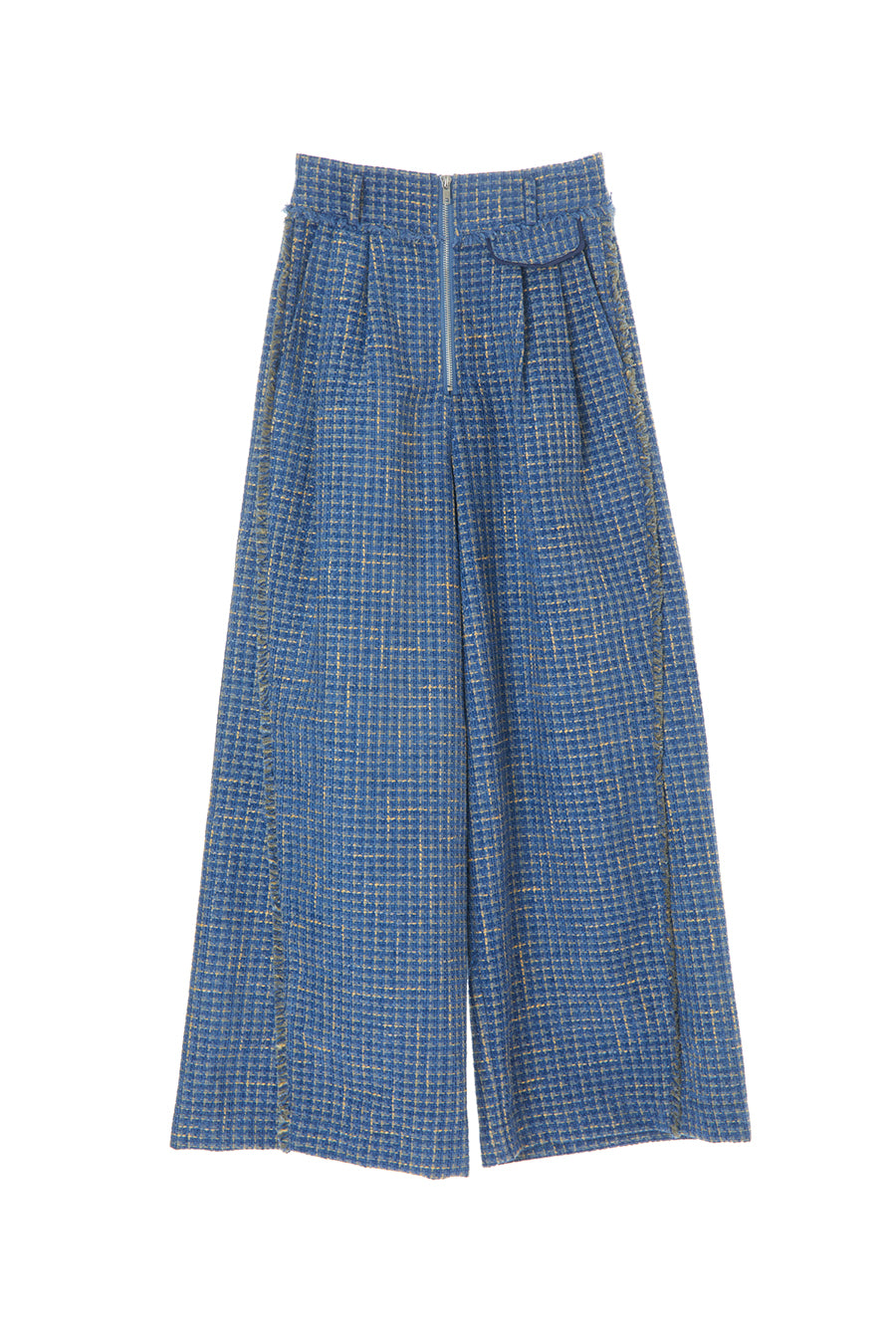 程よくハリのあるツイード 生地で、綺麗なワイドシルエットを構築したハイウエストパンツは、美脚効果を狙えるアイテム。
